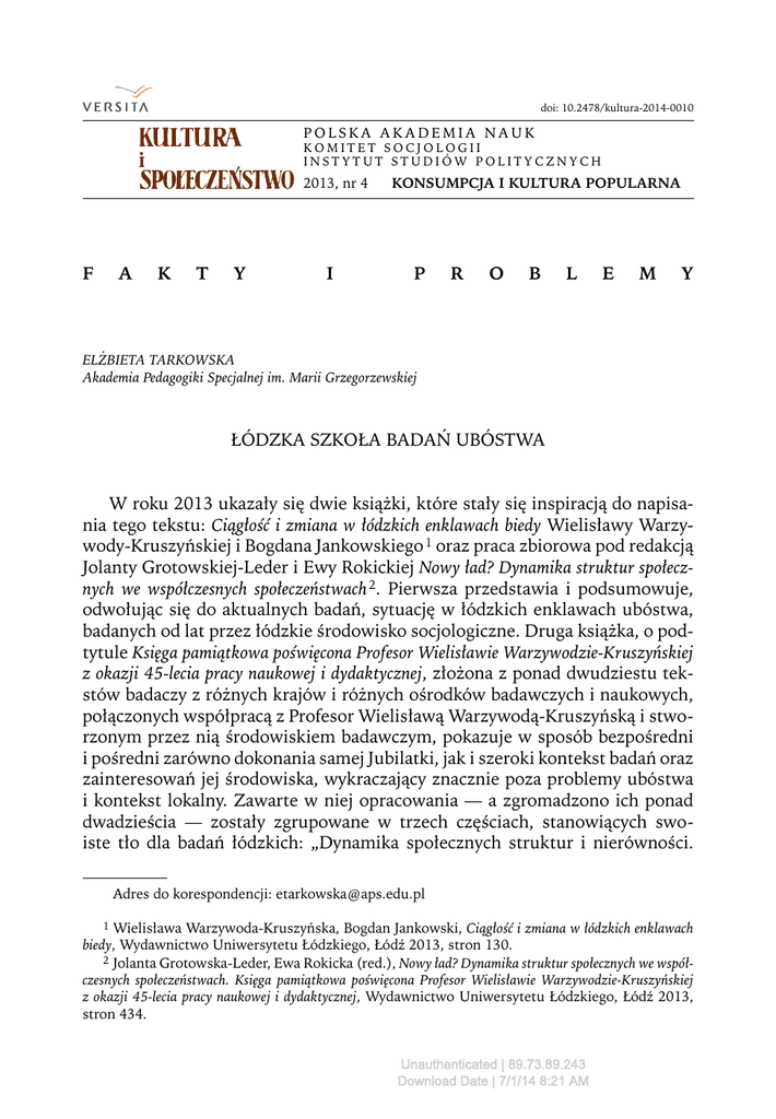 doi: 10.2478/kultura-2014-0010 POLSKA AKADEMIA NAUK KOMITET SOCJOLOGII INSTYTUT STUDIÓW POLITYCZNYCH 2013, nr 4 F A K T Y I KONSUMPCJA I KULTURA POPULARNA P R O B L E M Y ELŻBIETA TARKOWSKA Akademia Pedagogiki Specjalnej im. Marii Grzegorzewskiej ŁÓDZKA SZKOŁA BADAŃ UBÓSTWA W roku 2013 ukazały się dwie książki, które stały się inspiracją do napisania tego tekstu: Ciągłość i zmiana w łódzkich enklawach biedy Wielisławy Warzywody-Kruszyńskiej i Bogdana Jankowskiego 1 oraz praca zbiorowa pod redakcją Jolanty Grotowskiej-Leder i Ewy Rokickiej Nowy ład? Dynamika struktur społecznych we współczesnych społeczeństwach 2. Pierwsza przedstawia i podsumowuje, odwołując się do aktualnych badań, sytuację w łódzkich enklawach ubóstwa, badanych od lat przez łódzkie środowisko socjologiczne. Druga książka, o podtytule Księga pamiątkowa poświęcona Profesor Wielisławie Warzywodzie-Kruszyńskiej z okazji 45-lecia pracy naukowej i dydaktycznej, złożona z ponad dwudziestu tekstów badaczy z różnych krajów i różnych ośrodków badawczych i naukowych, połączonych współpracą z Profesor Wielisławą Warzywodą-Kruszyńską i stworzonym przez nią środowiskiem badawczym, pokazuje w sposób bezpośredni i pośredni zarówno dokonania samej Jubilatki, jak i szeroki kontekst badań oraz zainteresowań jej środowiska, wykraczający znacznie poza problemy ubóstwa i kontekst lokalny. Zawarte w niej opracowania — a zgromadzono ich ponad dwadzieścia — zostały zgrupowane w trzech częściach, stanowiących swoiste tło dla badań łódzkich: „Dynamika społecznych struktur i nierówności. Adres do korespondencji: [email protected] 1 Wielisława Warzywoda-Kruszyńska, Bogdan Jankowski, Ciągłość i zmiana w łódzkich enklawach biedy, Wydawnictwo Uniwersytetu Łódzkiego, Łódź 2013, stron 130. 2 Jolanta Grotowska-Leder, Ewa Rokicka (red.), Nowy ład? Dynamika struktur społecznych we współczesnych społeczeństwach. Księga pamiątkowa poświęcona Profesor Wielisławie Warzywodzie-Kruszyńskiej z okazji 45-lecia pracy naukowej i dydaktycznej, Wydawnictwo Uniwersytetu Łódzkiego, Łódź 2013, stron 434. Unauthenticated | 89.73.89.243 Download Date | 7/1/14 8:21 AM 200 ELŻBIETA TARKOWSKA Podejścia teoretyczne i procesy globalne”, „Nierówności i ubóstwo — odpowiedzi polityczne”, „Społeczne konsekwencje przemian strukturalnych. Z badań empirycznych”. W wielu tekstach pojawiają się bezpośrednie odwołania do badań przeprowadzonych przez to środowisko, w niektórych — pióra jego przedstawicieli — omawia się też wyniki badań. Księga jubileuszowa została zaprezentowana podczas wielkiej międzynarodowej konferencji pt. „Nowy ład? Dynamika struktur współczesnych społeczeństw”, która odbyła się w dniach 21–23 października 2013 r. w Uniwersytecie Łódzkim. Konferencja ta była ważnym wydarzeniem w polskiej socjologii, zwłaszcza zaś w kręgu badaczy zainteresowanych problemami ubóstwa i wykluczenia społecznego, przeciwdziałania tym zjawiskom i łagodzenia ich skutków. Obie te publikacje oraz konferencja to dobra okazja, by podkreślić dorobek łódzkiej szkoły badania ubóstwa 3 i oddać sprawiedliwość jej twórczyni i mistrzyni — profesor Wielisławie Warzywodzie-Kruszyńskiej, z której biografią naukową powstanie i dzieje szkoły są nierozerwalnie związane. Łódzkie badania ubóstwa, prowadzone od dwudziestu lat, wyrastają z badań struktury społecznej Łodzi, zapoczątkowanych w połowie lat sześćdziesiątych przez Włodzimierza Wesołowskiego, pracującego wówczas na Uniwersytecie Łódzkim, i przez jego zespół. Do zespołu należała, jeszcze jako magistrantka, Wielisława Warzywoda-Kruszyńska, obok wielu innych osób, które też wniosły później doniosły wkład do socjologii, pracując nie tylko w Łodzi i nie tylko w Polsce, ale także poza jej granicami. Jak mówi Wielisława Warzywoda-Kruszyńska w wywiadzie biograficznym, udzielonym przedstawicielom najmłodszego pokolenia łódzkich badaczy ubóstwa, Magdalenie Rek-Woźniak i Wojciechowi Woźniakowi, kolejne jej prace „na stopień” — magisterska, doktorska i habilitacyjna — dotyczyły różnych aspektów społecznego zróżnicowania mieszkańców Łodzi 4. Pierwsze badanie z serii łódzkich badań ubóstwa i pomocy społecznej przeprowadzono w 1993 r. i dotyczyło ono społecznej charakterystyki „biedoty miejskiej” (jak to wówczas określono), czyli ludzi, którzy w wyniku głębokich zmian z początków polskiej transformacji utracili możliwości samodzielnej egzystencji i stali się klientami pomocy społecznej. Już następne badania dotyczyły przestrzennego rozmieszczenia w Łodzi „ubóstwa i zagrożeń społecznych”, czyli „geografii biedy”, stanowiącej jeden z najbardziej charakterystycznych dla tego środowiska badanych problemów i podejść badawczych. Polegały one na identyfikacji obszarów koncentracji ludności korzystającej z pomocy społecznej, a więc enklaw biedy i były przeprowadzone w latach 1997–1999. 3 Przyjęta nazwa tego zespołu i środowiska to „Łódzka Szkoła Badań nad Biedą i Pomocą Społeczną”, zob. Joanna Staręga-Piasek, Od Redakcji, „Praca Socjalna”, t. 25, lipiec–sierpień 2010, numer specjalny, s. 3. 4 Profesor Warzywoda-Kruszyńska o swoim życiu. Wywiad Magdaleny Rek-Woźniak i Wojciecha Woźniaka, w: Jolanta Grotowska-Leder, Ewa Rokicka (red.), Nowy ład?, cyt. wyd. Unauthenticated | 89.73.89.243 Download Date | 7/1/14 8:21 AM ŁÓDZKA SZKOŁA BADAŃ UBÓSTWA 201 Po dziesięciu latach, w okresie 2008–2010, autorzy badań powrócili do tych samych rodzin, a nawet do tych samych respondentów, by zbadać zjawisko międzypokoleniowej transmisji ubóstwa. Choć łódzka szkoła badania ubóstwa utożsamiana jest przede wszystkim z badaniem specyficznej miejskiej biedy, łódzkie enklawy były tylko punktem wyjścia aktywności badawczej 
