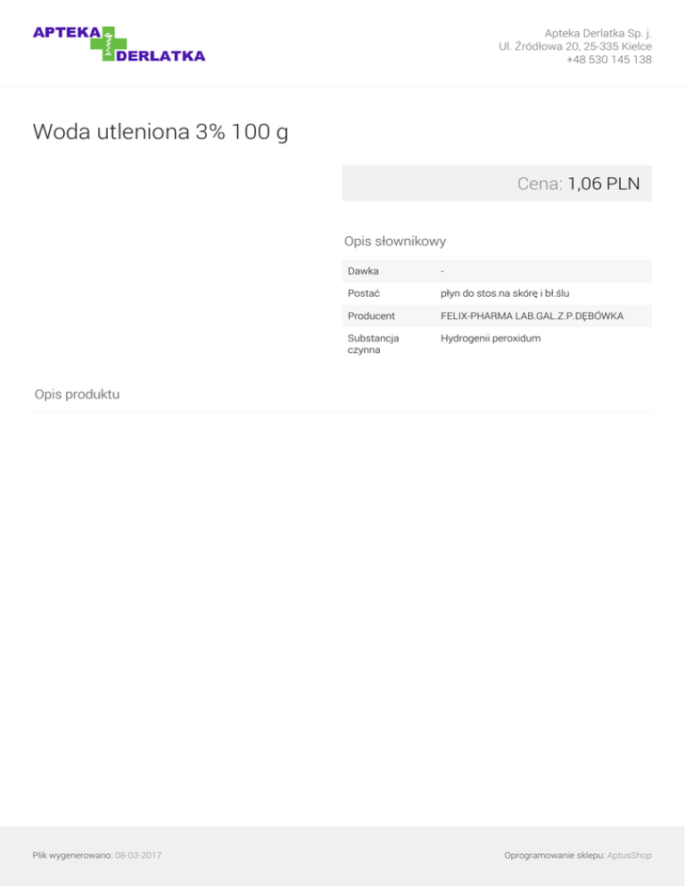 Apteka Derlatka Sp. j. Ul. Źródłowa 20, 25-335 Kielce +48 530 145 138 Woda utleniona 3% 100 g Cena: 1,06 PLN Opis słownikowy Dawka - Postać płyn do stos.na skórę i bł.ślu Producent FELIX-PHARMA LAB.GAL.Z.P.DĘBÓWKA Substancja czynna Hydrogenii peroxidum Opis produktu Plik wygenerowano: 08-03-2017 Powered by TCPDF (www.tcpdf.org) Oprogramowanie sklepu: AptusShop