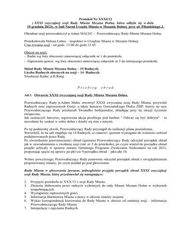 Protokół Nr XXXI/12 z XXXI zwyczajnej sesji Rady Miasta Mszana Dolna, która odbyła się w dniu 19 grudnia 2012r. w Sali Narad Urzędu Miasta w Mszanie Dolnej przy ul. Piłsudskiego 2. Obradom sesji przewodniczył p.Adam MALEC - Przewodniczący Rady Miasta Mszana Dolna. Protokołowała Helena Łabuz – inspektor w Urzędzie Miasta w Mszanie Dolnej. Czas trwania sesji : od godz. 13.00 do godz.15.45. Obecni na sesji: - Radni wg listy obecności stanowiącej załącznik nr 1 do protokołu. - Zaproszeni goście: wg listy obecności stanowiącej załącznik nr 2 do niniejszego protokołu. Skład Rady Miasta Mszana Dolna – 15 Radnych. Liczba Radnych obecnych na sesji – 14 Radnych. Nieobecni Radni: p.R.Rataj. Przebieg obrad Ad.1. Otwarcie XXXI zwyczajnej sesji Rady Miasta Mszana Dolna. Przewodniczący Rady p.Adam Malec otworzył XXXI zwyczajną sesję Rady Miasta, przywitał Radnych oraz zaproszonych Gości, a także harcerzy Gorczańskiego Hufca ZHP, którzy na ręce Przewodniczącego Rady przekazali Światełko betlejemskie, składając przy tej okazji życzenia świąteczne. Jak zaznaczyli harcerze, tegoroczna akcja przebiega pod hasłem " Odważ się być dobrym" – to nawołanie by szukać w sobie dobra i dzielić się nim z innymi. Po tej podniosłej chwili, Przewodniczący Rady przystąpił do realizacji planu posiedzenia. Stwierdził, że na sali znajduje się 14 Radnych, co stanowi quorum wymagane do ważności uchwał podejmowanych przez Radę. Po stwierdzeniu prawomocności obrad (quorum) Przewodniczący Rady odczytał porządek obrad jak w zawiadomieniu o zwołaniu sesji (zał. nr 3 do protokołu), po czym wniósł do porządku obrad projekt uchwały w sprawie zmiany Gminnego Programu Zwalczania Narkomanii na rok 2012, proponując ujęcie tej sprawy po pkt-cie 9 porządku obrad – jako pkt 10. Wobec powyższego, Przewodniczący Rady ponownie odczytał porządek obrad z uwzględnieniem proponowanej zmiany, po czym poddał go pod głosowanie. Rada Miasta w głosowaniu jawnym, jednogłośnie przyjęła porządek obrad XXXI zwyczajnej sesji Rady Miasta, który przedstawiał się następująco: 1. Otwarcie XXXII zwyczajnej sesji Rady Miasta Mszana Dolna. 2. Przyjęcie protokołu nr XXX/12 z sesji Rady Miasta. 3. Złożenie ślubowania przez radnych wybranych do rady Miasta Mszana Dolna w wyborach uzupełniających. 4. Wystąpienia zaproszonych gości. 5. Informacja Burmistrza Miasta o pracy w okresie między sesjami. 6. Wykaz korespondencji kierowanej do Rady Miasta w okresie od ostatniej sesji – informacja Przewodniczącego Rady Miasta. 7. Interpelacje i zapytania Radnych. 8. 9. 10. 11. 12. 13. 14. 15. 16. 17. 18. 19. 20. Podjęcie uchwały w sprawie uzupełnienia składów osobowych Komisji stałych Rady Miasta Mszana Dolna. Podjęcie uchwały w sprawie zmiany Gminnego Programu Profilaktyki i Rozwiązywania Problemów Alkoholowych na 2012r. Podjęcie uchwały w sprawie zmiany Gminnego Programu Zwalczania Narkomanii na rok 2012. Podjęcie uchwały w sprawie zmian w budżecie miasta Mszana Dolna na rok 2012. Podjęcie uchwały w sprawie zmiany WPF Miasta Mszana Dolna na lata 2012-2025. Podjęcie uchwały w sprawie ustalenia wykazu wydatków budżetowych, które nie wygasają z upływem roku budżetowego 2012. Podjęcie uchwały w sprawie podziału Gminy – Miasto Mszana Dolna na obwody glosowania, ustalenia ich numerów, granic i siedzib obwodowych komisji wyborczych. Podjęcie uchwały w sprawie zmiany składu osobowego Rady Społecznej Przychodni Miejskiej VITAL-MED w Mszanie Dolnej. Podjęcie uchwały w sprawie ustalenia wysokości opłaty za wpis do rejestru żłobków i klubów dziecięcych. Zatwierdzenie planu pracy Komisji rewizyjnej Rady Miasta Mszana Dolna na rok 2013. Odpowiedzi na interpelacje i zapytania Radnych. Wolne wnioski. Zamknięcie obrad XXXI zwyczajnej sesji Rady Miasta Mszana Dolna. Następnie Przewodniczący Rady przystąpił do realizacji kolejnego punktu porządku obrad, tj.: Ad.2. Przyjęcie protokołu nr XXX/12 z sesji Rady Miasta. Przewodniczący obrad poinformował, że protokół nr XXX/12 z posiedzenia Rady Miasta został wyłożony do wglądu w Biurze Rady Miasta. Został on również przesłany do radnych pocztą elektroniczną. Radni nie wnieśli uwag do protokołu. Wobec powyższego, Przewodniczący Rady Miasta poddał pod głosowanie przyjęcie protokołu nr XXX/12 z posiedzenia Rady Miasta Mszana Dolna : Rada Miasta w głosowaniu jawnym, jednogłośnie przyjęła protokół nr XXX/12 z posiedzenia Rady Miasta Mszana Dolna. Ad.3. Złożenie ślubowania przez Radnych wybranych do Rady Miasta Mszana Dolna w wyborach uzupełniających. Przewodniczący Rady poinformował, że Radni przed przystąpieniem do wykonywania mandatu składają ślubowanie. Odmowa złożenia ślubowania skutkuje wygaśnięciem mandatu radnego. Następnie Przewodniczący Rady przedstawił sposób składania ślubowania przez Radnych określony w art.23a ustawy o samorządzie gminnym, tzn. po odczytaniu roty ślubowania wywoływani radni powstają i wypowiadają słowo „ślubuję”, przy czym mogą dodać zdanie „tak mi dopomóż Bóg”. Przewodniczący Rady – p.A.Malec - poprosił zebranych o powstanie, po czym odczytał rotę ślubowania o następującej treści: "wierny Konstytucji i prawu Rzeczypospolitej Polskiej, ślubuję uroczyście obowiązki radnego sprawować godnie, rzetelnie i uczciwie, mając na względzie dobro mojej gminy i jej mieszkańców". Następnie Radni: kolejno p.Agnieszka Sasal, a po Niej p.Artur Widzisz, złożyli ślubowanie poprzez wypowiedzenie słów: „ślubuję – tak mi dopomóż Bóg” W dalszej kolejności Przewodniczący Rady wręczył nowym Radnym formularze oświadczenia majątkowego celem ich złożenia, informując o terminie i sposobie ich składania zgodnie z zapisami ustawy o samorządzie gminnym. Ad.4. Wystąpienia zaproszonych Gości. p.F.Dziedzina – Wicestarosta Limanowski – skierował do Rady i Burmistrza Mia