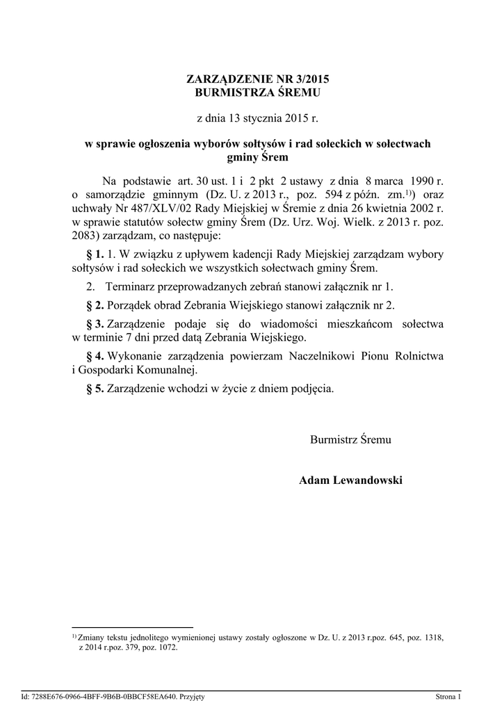 ZARZĄDZENIE NR 3/2015 BURMISTRZA ŚREMU z dnia 13 stycznia 2015 r. w sprawie ogłoszenia wyborów sołtysów i rad sołeckich w sołectwach gminy Śrem Na podstawie art. 30 ust. 1 i 2 pkt 2 ustawy z dnia 8 marca 1990 r. o samorządzie gminnym (Dz. U. z 2013 r., poz. 594 z późn. zm.1)) oraz uchwały Nr 487/XLV/02 Rady Miejskiej w Śremie z dnia 26 kwietnia 2002 r. w sprawie statutów sołectw gminy Śrem (Dz. Urz. Woj. Wielk. z 2013 r. poz. 2083) zarządzam, co następuje: § 1. 1. W związku z upływem kadencji Rady Miejskiej zarządzam wybory sołtysów i rad sołeckich we wszystkich sołectwach gminy Śrem. 2. Terminarz przeprowadzanych zebrań stanowi załącznik nr 1. § 2. Porządek obrad Zebrania Wiejskiego stanowi załącznik nr 2. § 3. Zarządzenie podaje się do wiadomości mieszkańcom sołectwa w terminie 7 dni przed datą Zebrania Wiejskiego. § 4. Wykonanie zarządzenia powierzam Naczelnikowi Pionu Rolnictwa i Gospodarki Komunalnej. § 5. Zarządzenie wchodzi w życie z dniem podjęcia. Burmistrz Śremu Adam Lewandowski 1) Zmiany tekstu jednolitego wymienionej ustawy zostały ogłoszone w Dz. U. z 2013 r.poz. 645, poz. 1318, z 2014 r.poz. 379, poz. 1072. Id: 7288E676-0966-4BFF-9B6B-0BBCF58EA640. Przyjęty Strona 1 Załącznik nr 1 do Zarządzenia Nr 3/2015 Burmistrza Śremu z dnia 13 stycznia 2015 r. TERMINARZ WYBORÓW SOŁTYSÓW I RAD SOŁECKICH W SOŁECTWACH GMINY ŚREM Lp. Sołectwo Data Godzina 1. Binkowo 26.01.2015 18.00 2. Błociszewo 26.01.2015 18.00 3. Bodzyniewo 26.01.2015 18.00 4. Borgowo 02.02.2015 18.00 5. Dalewo 26.01.2015 18.00 6. DąbrowaMateuszewo 27.01.2015 18.00 7. Dobczyn 27.01.2015 18.00 8. Gaj 27.01.2015 18.00 9. Góra 27.01.2015 18.00 10. Grodzewo 27.01.2015 18.00 11. Grzymysław 28.01.2015 18.00 12. KadzewoMarszewo 28.01.2015 18.00 13. Kaleje 28.01.2015 18.00 14. Kawcze 28.01.2015 18.00 Id: 7288E676-0966-4BFF-9B6B-0BBCF58EA640. Przyjęty Miejsce Świetlica wiejska Binkowo 3 Świetlica wiejska Błociszewo, ul. Kasztanowa 3 Szkoła Podstawowa Bodzyniewo 35 Mieszkanie sołtysa Borgowo 17 Świetlica wiejska Dalewo 72 ZSPiG Dąbrowa ul. Śremska 2 Dobczyn 5/1 (autokar) Świetlica wiejska Gaj Świetlica wiejska Góra Harcówka Grodzewo 56 Grzymysław 34 „Spójnia” Hodowla i Nasiennictwo Ogrodnicze Sp. z o .o. Kadzewo 12 Świetlica wiejska Kaleje 36 Mieszkanie sołtysa Kawcze 27 Obsługujący Szymon Rogaliński Marta GanoMańkowska Anna KoronowskaSkrzypczak Dominika Gronowska Ilona Klak Marta GanoMańkowska Robert Mielcarek Dominika Gronowska Ilona Klak Karolina Włodarczak Dominika Gronowska Romana Czeterbok Marta GanoMańkowska Robert Mielcarek Strona 2 15. KrzyżanowoPucołowo 28.01.2015 18.00 16. Luciny-Tesiny 28.01.2015 18.00 17. Łęg 29.01.2015 18.00 18. Marianowo 29.01.2015 18.00 19. Mechlin 29.01.2015 18.00 20. MórkaJeleńczewo 29.01.2015 18.00 21. Nochowo 29.01.2015 18.00 22. Niesłabin 29.01.2015 18.00 23. OlszaBystrzek 30.01.2015 18.00 24. Orkowo 30.01.2015 18.00 25. Ostrowo 30.01.2015 18.00 26. PełczynNochówko 30.01.2015 18.00 27. Psarskie 30.01.2015 18.00 28. Pysząca 02.02.2015 18.00 29. Sosnowiec 02.02.2015 18.00 30. Szymanowo 02.02.2015 18.00 31. Wirginowo 26.01.2015 18.00 32. Wyrzeka 02.02.2015 18.00 Id: 7288E676-0966-4BFF-9B6B-0BBCF58EA640. Przyjęty Szkoła Podstawowa Krzyżanowo 44 Świetlica wiejska Luciny 79 Mieszkanie sołtysa Łęg 3/4 Mieszkanie sołtysa Marianowo 6 Świetlica wiejska Mechlin, ul. Szkolna 36 Świetlica wiejska Mórka, ul. Wiatrakowa 3 ZSPiG Nochowo, ul. Szkolna 5 Świetlica wiejska Niesłabin, ul. Szkolna 12 Świetlica wiejska Olsza 11 Świetlica wiejska Orkowo 35 Świetlica wiejska Ostrowo 16 Świetlica wiejska Pełczyn 20 Świetlica wiejska Psarskie, ul. Owocowa 6 Świetlica wiejska Pysząca ul. Długa 8 Mieszkanie sołtysa Sosnowiec, ul. Kasztanowa 15 Świetlica wiejska Szymanowo, ul. Leśna 10 Mieszkanie sołtysa Wirginowo 13 Świetlica wiejska Wyrzeka, ul. ks. P. Wawrzyniaka 13 Anna KoronowskaSkrzypczak Ilona Klak Karolina Włodarczak Robert Mielcarek Marta GanoMańkowska Dominika Gronowska Szymon Rogaliński Ilona Klak Dominika Gronowska Marta GanoMańkowska Ilona Klak Anna KoronowskaSkrzypczak Romana Czeterbok Robert Mielcarek Szymon Rogaliński Ilona Klak Dominika Gronowska Anna KoronowskaSkrzypczak Strona 3 33. Zbrudzewo 02.02.2015 18.00 ZSPiG Zbrudzewo, Śremska 49 Marta GanoMańkowska Burmistrz Śremu Adam Lewandowski Id: 7288E676-0966-4BFF-9B6B-0BBCF58EA640. Przyjęty Strona 4 Załącznik nr 2 do Zarządzenia Nr 3/2015 Burmistrza Śremu z dnia 13 stycznia 2015 r. Porządek obrad Zebrania Wiejskiego 1. Otwarcie zebrania przez sołtysa i poinformowanie o celu i porządku zebrania. 2. Wybór przewodniczącego zebrania. 3. Wybór sekretarza. 4. Powołanie Komisji Wyborczej w składzie minimum 3 osób. 5. Zgłaszanie kandydatów na sołtysa. 6. Wybory sołtysa i ogłoszenie wyników. 7. Zgłaszanie kandydatów do rady sołeckiej. 8. Wybory członków rady sołeckiej i ogłoszenie wyników. 9. Dyskusja. 10. Zakończenie zebrania. Burmistrz Śremu Adam Lewandowski Id: 7288E676-0966-4BFF-9B6B-0BBCF58EA640. Przyjęty Strona 5