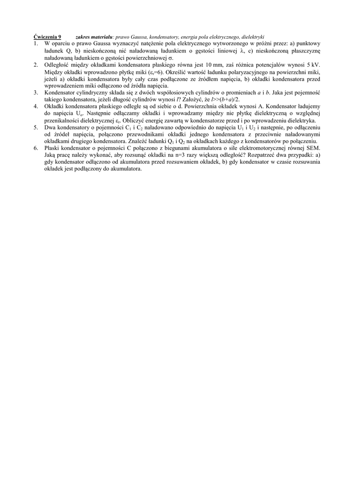 Ćwiczenia 9 1. 2. 3. 4. 5. 6. zakres materiału: prawo Gaussa, kondensatory, energia pola elektrycznego, dielektryki W oparciu o prawo Gaussa wyznaczyć natęŜenie pola elektrycznego wytworzonego w próŜni przez: a) punktowy ładunek Q, b) nieskończoną nić naładowaną ładunkiem o gęstości liniowej λ, c) nieskończoną płaszczyznę naładowaną ładunkiem o gęstości powierzchniowej σ. Odległość między okładkami kondensatora płaskiego równa jest 10 mm, zaś róŜnica potencjałów wynosi 5 kV. Między okładki wprowadzono płytkę miki (εr=6). Określić wartość ładunku polaryzacyjnego na powierzchni miki, jeŜeli a) okładki kondensatora były cały czas podłączone ze źródłem napięcia, b) okładki kondensatora przed wprowadzeniem miki odłączono od źródła napięcia. Kondensator cylindryczny składa się z dwóch współosiowych cylindrów o promieniach a i b. Jaka jest pojemność takiego kondensatora, jeŜeli długość cylindrów wynosi l? ZałoŜyć, Ŝe l>>(b+a)/2. Okładki kondensatora płaskiego odległe są od siebie o d. Powierzchnia okładek wynosi A. Kondensator ładujemy do napięcia Uo. Następnie odłączamy okładki i wprowadzamy między nie płytkę dielektryczną o względnej przenikalności dielektrycznej εr. Obliczyć energię zawartą w kondensatorze przed i po wprowadzeniu dielektryka. Dwa kondensatory o pojemności C1 i C2 naładowano odpowiednio do napięcia U1 i U2 i następnie, po odłączeniu od źródeł napięcia, połączono przewodnikami okładki jednego kondensatora z przeciwnie naładowanymi okładkami drugiego kondensatora. Znaleźć ładunki Q1 i Q2 na okładkach kaŜdego z kondensatorów po połączeniu. Płaski kondensator o pojemności C połączono z biegunami akumulatora o sile elektromotorycznej równej SEM. Jaką pracę naleŜy wykonać, aby rozsunąć okładki na n=3 razy większą odległość? Rozpatrzeć dwa przypadki: a) gdy kondensator odłączono od akumulatora przed rozsuwaniem okładek, b) gdy kondensator w czasie rozsuwania okładek jest podłączony do akumulatora.