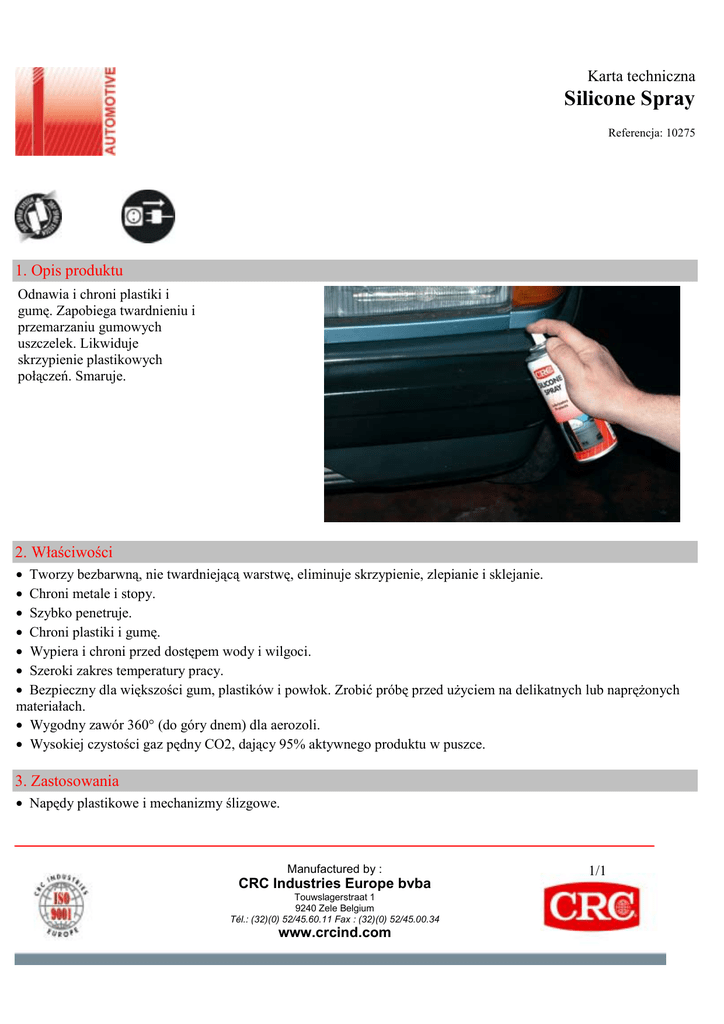Karta techniczna Silicone Spray Referencja: 10275 1. Opis produktu Odnawia i chroni plastiki i gumę. Zapobiega twardnieniu i przemarzaniu gumowych uszczelek. Likwiduje skrzypienie plastikowych połączeń. Smaruje. 2. Właściwości • Tworzy bezbarwną, nie twardniejącą warstwę, eliminuje skrzypienie, zlepianie i sklejanie. • Chroni metale i stopy. • Szybko penetruje. • Chroni plastiki i gumę. • Wypiera i chroni przed dostępem wody i wilgoci. • Szeroki zakres temperatury pracy. • Bezpieczny dla większości gum, plastików i powłok. Zrobić próbę przed użyciem na delikatnych lub naprężonych materiałach. • Wygodny zawór 360° (do góry dnem) dla aerozoli. • Wysokiej czystości gaz pędny CO2, dający 95% aktywnego produktu w puszce. 3. Zastosowania • Napędy plastikowe i mechanizmy ślizgowe. Manufactured by : CRC Industries Europe bvba Touwslagerstraat 1 9240 Zele Belgium Tél.: (32)(0) 52/45.60.11 Fax : (32)(0) 52/45.00.34 www.crcind.com 1/1 Karta techniczna Silicone Spray Referencja: 10275 • • • • Instrumenty precyzyjne. Zapobieganie przemarzaniu gumy. Łączenie opakowań. Ochrona i konserwacja gumy. 4. Sposób użycia • Nakładać cienką równomierną warstwę. • Odpowiedni dla mineralnych półsyntetycznych i syntetycznych olejów silnikowych. • Powtórzyć w razie potrzeby. • Nie stosować na urządzenia pod napięciem. • Aby usunąć pozostałości lub nadmiar produktu, użyć jednego ze zmywaczy CRC. • Karta charakterystyki zgodna z rozporządzeniem (WE) nr 1907/2006 art. 31 z poprawkami dostępna jest dla wszystkich produktów CRC. 5. Dane techniczne (bez gazu pędnego) Wygląd Kolor Zapach Gęstość Temperatura zapłonu Temperatura samozapłonu Gęstość oparów Temperatura zapłonu Operating temperature active product Dynamic viscosity active product Dielectric strenght active product Surface tension active product Aerozol Ciecz. Bezbarwny. Rozpuszczalnik. 0.72 g/cm3 (@ 20°C). - 26 °C (Tygiel zamknięty) > 200 °C >3 (@ 20°C). >300 °C (Tygiel zamknięty) -40 till 200 °C 10.000 - 12.000 mPa.s (@ 20°C). 35 kV 21 mN/m luzem Ciecz. Bezbarwny. Rozpuszczalnik. 0.72 g/cm3 (@ 20°C). - 26 °C (Tygiel zamknięty) > 200 °C >3 (@ 20°C). > 300 °C (Tygiel zamknięty) -40 --> 200 °C 10.000 - 12.000 mPa.s (@ 20°C). 35 kV 21 mN/m 6. Opakowania Aerozol 12x200 ML 12x300 ML 12x400 ML Manufactured by : CRC Industries Europe bvba Touwslagerstraat 1 9240 Zele Belgium Tél.: (32)(0) 52/45.60.11 Fax : (32)(0) 52/45.00.34 www.crcind.com Ref. : 10506 Ref. : 30315 Ref. : 10517 2/1 Karta techniczna Silicone Spray Referencja: 10275 luzem 6x200 ML 20 L 2x5 L Ref. : 10506 Ref. : 10523 Ref. : 10522 Wszystkie dane przedstawione w tej karcie oparte są na naszym doświadczeniu i/lub testach laboratoryjnych. Z powodu różnorodności urządzeń i warunków pracy oraz nieprzewidywalnych zachowań ludzkich polecamy wcześniejsze przetestowanie produktu przed użyciem. Wszystkie informacje podane są w dobrej wierze, ale bez żadnej gwarancji. Informacje przedstawione w niniejszej Karcie Technicznej mogły ulec zmianie w wyniku zmian prawnych, zmiany składników lub nowych doświadczeń. Ostateczna i aktualna wersja Karty Technicznej może być przesłana na żądanie, jest także dostępna na naszej stronie internetowej: www.crcind.com. Zalecamy zarejestrowanie się na tej stronie, aby w przyszłości automatycznie otrzymywać uaktualnione wersje tej Karty Technicznej. CRC_RED-SILICONE-20131003 Wersja Data Manufactured by : CRC Industries Europe bvba Touwslagerstraat 1 9240 Zele Belgium Tél.: (32)(0) 52/45.60.11 Fax : (32)(0) 52/45.00.34 www.crcind.com 3/1