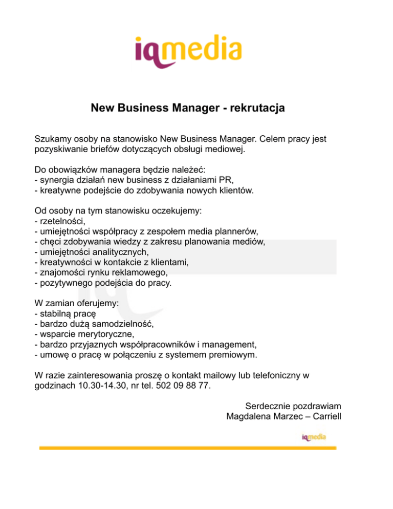 ! New Business Manager - rekrutacja Szukamy osoby na stanowisko New Business Manager. Celem pracy jest pozyskiwanie briefów dotyczących obsługi mediowej. Do obowiązków managera będzie należeć: - synergia działań new business z działaniami PR, - kreatywne podejście do zdobywania nowych klientów. Od osoby na tym stanowisku oczekujemy: - rzetelności, - umiejętności współpracy z zespołem media plannerów, - chęci zdobywania wiedzy z zakresu planowania mediów, - umiejętności analitycznych, - kreatywności w kontakcie z klientami, - znajomości rynku reklamowego, - pozytywnego podejścia do pracy. W zamian oferujemy: - stabilną pracę - bardzo dużą samodzielność, - wsparcie merytoryczne, - bardzo przyjaznych współpracowników i management, - umowę o pracę w połączeniu z systemem premiowym. W razie zainteresowania proszę o kontakt mailowy lub telefoniczny w godzinach 10.30-14.30, nr tel. 502 09 88 77. Serdecznie pozdrawiam Magdalena Marzec – Carriell