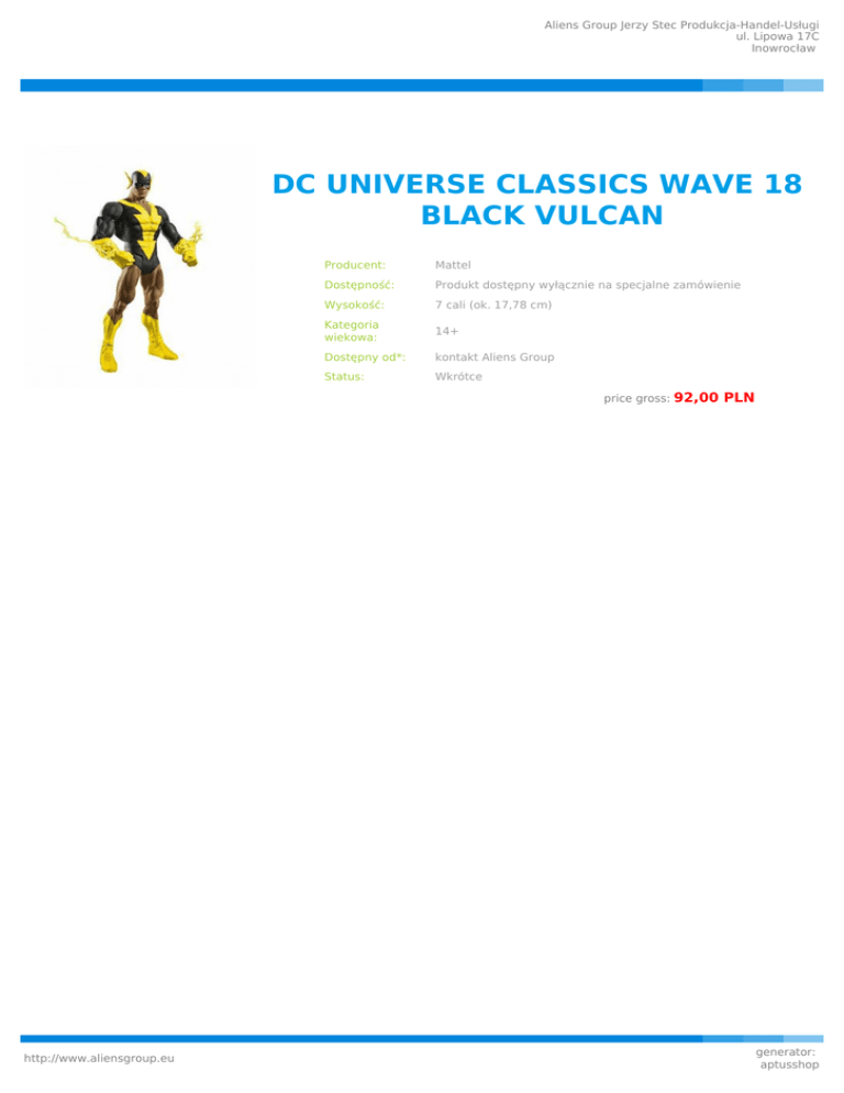 Aliens Group Jerzy Stec Produkcja-Handel-Usługi ul. Lipowa 17C Inowrocław DC UNIVERSE CLASSICS WAVE 18 BLACK VULCAN Producent: Mattel Dostępność: Produkt dostępny wyłącznie na specjalne zamówienie Wysokość: 7 cali (ok. 17,78 cm) Kategoria wiekowa: 14+ Dostępny od*: kontakt Aliens Group Status: Wkrótce price gross: http://www.aliensgroup.eu 92,00 PLN generator: aptusshop