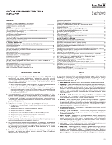 Ogólne warunki ubezpieczenia biznes pro Spis treści Informacje, o których mowa w art. 17 ust. 1 ustawy o działalności ubezpieczeniowej i reasekuracyjnej ................................................ rewers str. 1 I. POSTANOWIENIA GENERALNE Definicje .........................................................................................................................................................1 Ograniczenia i wyłączenia odpowiedzialności ................................................................................4 Suma ubezpieczenia / gwarancyjna i warunki jej zmiany ...........................................................5 Zawarcie umowy ubezpieczenia ..........................................................................................................5 Początek i koniec odpowiedzialności .................................................................................................5 Rozwiązanie umowy ubezpieczenia ...................................................................................................5 Składka ubezpieczeniowa ......................................................................................................................5 Prawa i obowiązki stron ...........................................................................................................................6 Zgłoszenie szkody. Ustalenie rozmiaru szkody i wysokości odszkodowania .......................7 Wypłata odszkodowania / świadczenia .............................................................................................7 Roszczenia regresowe ..............................................................................................................................8 II. UBEZPIECZENIA MIENIA UBEZPIECZENIE MIENIA OD OGNIA l INNYCH ZDARZEŃ LOSOWYCH Przedmiot ubezpieczenia ........................................................................................................................8 Zakres ubezpieczenia ...............................................................................................................................8 Ograniczenia i wyłączenia odpowiedzialności ................................................................................8 UBEZPIECZENIE MIENIA OD KRADZIEŻY Z WŁAMANIEM l RABUNKU (ROZBOJU) Przedmiot ubezpieczenia ........................................................................................................................9 Zakres ubezpieczenia ...............................................................................................................................10 Ograniczenia i wyłączenia odpowiedzialności ................................................................................10 UBEZPIECZENIE MIENIA OD WANDALIZMU Przedmiot ubezpieczenia ........................................................................................................................10 Zakres ubezpieczenia ...............................................................................................................................11 Ograniczenia i wyłączenia odpowiedzialności ................................................................................11 UBEZPIECZENIE SZYB I INNYCH PRZEDMIOTÓW OD STŁUCZENIA LUB PĘKNIĘCIA Przedmiot ubezpieczenia ........................................................................................................................11 Zakres ubezpieczenia ...............................................................................................................................11 Ograniczenia i wyłączenia odpowiedzialności ................................................................................11 UBEZPIECZENIE SPRZĘTU ELEKTRONICZNEGO ORAZ PROGRAMÓW OD SZKÓD MATERIALNYCH InterRisk Kontakt 22 212 20 12 Przedmiot ubezpieczenia ........................................................................................................................12 Zakres ubezpieczenia ...............................................................................................................................12 Ograniczenia i wyłączenia odpowiedzialności ................................................................................12 POZOSTAŁE POSTANOWIENIA DOTYCZĄCE UBEZPIECZEŃ MIENIA Suma ubezpieczenia i warunki jej zmiany .........................................................................................12 System ubezpieczeń ..................................................................................................................................13 Ustalenie rozmiaru szkody i wysokości odszkodowania ..............................................................13 III. UBEZPIECZENIE ODPOWIEDZIALNOŚCI CYWILNEJ Przedmiot i zakres ubezpieczenia ........................................................................................................14 Ograniczenia i wyłączenia odpowiedzialności ................................................................................15 Suma gwarancyjna .....................................................................................................................................18 Ustalenie rozmiaru szkody i wysokości odszkodowania ..............................................................18 IV. SKARGI I REKLAMACJE ....................................................................................................................18 V. POSTANOWIENIA KOŃCOWE .........................................................................................................18 MINIMALNE WYMOGI ZABEZPIECZENIA MIENIA Definicje .........................................................................................................................................................19 Konstrukcja ścian, stropów, sufitów, podłóg i dachów .................................................................19 Zabezpieczenie okien i innych zewnętrznych otworów .................................................