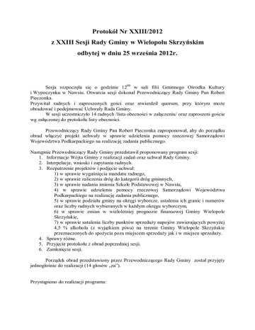Protokół Nr XXIII/2012 z XXIII Sesji Rady Gminy w Wielopolu