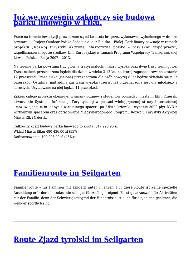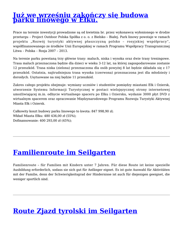 Już we wrześniu zakończy się budowa parku linowego w Ełku. Prace na terenie inwestycji prowadzone są od kwietnia br. przez wykonawcę wyłonionego w drodze przetargu – Project Outdoor Polska Spółka z o. o. z Bielsko – Białej. Park linowy powstaje w ramach projektu „Rozwój turystyki aktywnej płaszczyzną polsko – rosyjskiej współpracy”, współfinansowanego ze środków Unii Europejskiej w ramach Programu Współpracy Transgranicznej Litwa – Polska – Rosja 2007 – 2013. Na terenie parku powstaną trzy główne trasy: maluch, niska i wysoka oraz dwie trasy treningowe. Trasa maluch przeznaczona będzie dla dzieci w wieku 3-12 lat, na której zagospodarowane zostanie 12 przeszkód. Trasa niska (zielona) przeznaczona dla osób powyżej 8 lat będzie składała się z 17 przeszkód. Ostatnia, najtrudniejsza trasa wysoka (czerwona) przeznaczona jest dla młodzieży i dorosłych. Usytuowane na niej będzie 11 przeszkód. Zakres całego projektu obejmuje: wymiany uczniów i studentów pomiędzy miastami Ełk i Oziersk, utworzenie Systemu Informacji Turystycznej w postaci wielojęzycznej strony internetowej umożliwiającej m.in. odbycie wirtualnego spaceru po Ełku i Oziersku, wydanie 3000 płyt DVD z wirtualnym spacerem oraz opracowanie Międzynarodowego Programu Rozwoju Turystyki Aktywnej Miasta Ełk i Oziersk. Całkowity koszt budowy parku linowego to kwota: 847 998,90 zł; Wkład Miasta Ełku: 480 436,00 zł (55%); Dofinansowanie: 400 293,00 zł (45%); Familienroute im Seilgarten Familienroute – für Familien mit Kindern unter 7 Jahren. Für diese Route ist keine spezielle Ausbildung erforderlich, sodass sie sich gut für Anfänger eignet. Es ist gute Auswahl für Aktivitäten mit der Familie, denn der Schwierigkeitsgrad der Hindernisse ist auch für diejenigen geeignet, die weniger sportlich sind. Route Zjazd tyrolski im Seilgarten Die Route „теле́жка” („tirolerische Abfahrt”) ist für Personen ab dem 12. Lebensjahr geeignet und hierfür ist eine frühere Ausbildung erforderlich (mittlere Stufe). Extremroute im Seilgarten Die Extremroute ist die schwierigste Strecke im Seilgarten in Oziersk, die sich für Personen ab 14 Jahre mit entsprechender Vorbereitung eignet. Fahrrad- und Kajakroute Die Länge der Route beträgt 22 km für die Fahrt mit dem Fahrrad und 8 km mit dem Kajak auf dem Fluss Angerapp . Sportschule In der Stadt Ozersk befindet sich eine Sportschule, in welcher sowohl Kinder als auch Jugendliche jeden Alters sowie auch Erwachsene einbezogen werden. Die beliebtesten Sportarten sind Volleyball und Fußball. Hotel Angerap Das Angerap-Hotel liegt im Herzen der Stadt auf dem Platz Zwycięstwa. Es ist das älteste Gebäude in der Stadt. Rings um das Gebäude erstreckt sich eine wunderschöne Aussicht auf den Platz. Das Hotel bietet gemütliche Zimmer, WiFi, TV und ein gemütliches Kaminzimmer. Plac Zwycięstwa, 11, powiat Ozersky,Obwód Kaliningradzki, Russland, Tel. 9062 10 57 83 8, E-Mail: [email protected] http://hotelangerap.ru Gästehaus „Czerwony rolnicze” Das Gästehaus „Czerwony Chutor” ist ein Haus im deutschen Stil auf den Fundamenten eines alten deutschen Hauses, ausgestattet mit den modernsten Standards. Es befindet sich in der Ortschaft mit einem poetischen Namen „Valdhorst”. Jetzt – Konev. Im Erdgeschoss befindet sich ein Bankettsaal im Jägerstil mit Trophäen an den Wänden, Holzmöbeln im alten Stil. Hier kann man köstliche hausgemachte Gerichte mit frischem Gemüse und Kräutern aus dem Gewächshaus, Hühnereier und Ziegenmilch genießen. Konew 4B, powiat Ozersky, Obwód Kaliningradzki, Rosja, tel.: 8 (965) 224-50-01, 8 (929) 165-24-68, 8 (921) 268-81-26 http://hutor39.ru/ R. Wiechert-Haus Ursprünglich handelte es sich um ein erdgeschossiges Gebäude mit Dachgeschoss, errichtet als das erste Gebäude in der Stadt. Gegenüber stand das Haus des Bürgermeisters. Nach dem 2. Weltkrieg wurde auf dem bewahrten Fundament die Büste von Stalin und später in den 60er Jahren die von Lenin aufgestellt. Hindenburg-Eiche Die Eiche befindet sich im Park „Zariecznyj”. Bis 1945 war er ein Rathauspark beim Landrat. In der Mitte des 18. Jahrhunderts befand sich hier eine Weberei. Bis zum Ende der 70er Jahre waren ein Gedenkstein und eine Marmortafel auf der Eiche angebracht. Später verschwand die Tafel, der Stein brach in zwei Hälften, der Rest ging beim Abriss des Rathauses verloren. Als die Anzahl der Schüler des Technikums, denen das Rathaus als Internat diente, sank, wurde dieses abgerissen.
