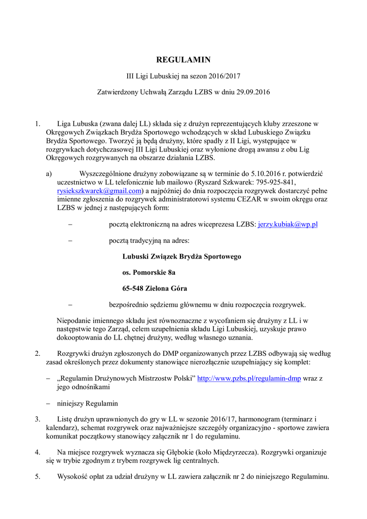 REGULAMIN III Ligi Lubuskiej na sezon 2016/2017 Zatwierdzony Uchwałą Zarządu LZBS w dniu 29.09.2016 1. Liga Lubuska (zwana dalej LL) składa się z drużyn reprezentujących kluby zrzeszone w Okręgowych Związkach Brydża Sportowego wchodzących w skład Lubuskiego Związku Brydża Sportowego. Tworzyć ją będą drużyny, które spadły z II Ligi, występujące w rozgrywkach dotychczasowej III Ligi Lubuskiej oraz wyłonione drogą awansu z obu Lig Okręgowych rozgrywanych na obszarze działania LZBS. a) Wyszczególnione drużyny zobowiązane są w terminie do 5.10.2016 r. potwierdzić uczestnictwo w LL telefonicznie lub mailowo (Ryszard Szkwarek: 795-925-841, [email protected]) a najpóźniej do dnia rozpoczęcia rozgrywek dostarczyć pełne imienne zgłoszenia do rozgrywek administratorowi systemu CEZAR w swoim okręgu oraz LZBS w jednej z następujących form: pocztą elektroniczną na adres wiceprezesa LZBS: [email protected] pocztą tradycyjną na adres: Lubuski Związek Brydża Sportowego os. Pomorskie 8a 65-548 Zielona Góra bezpośrednio sędziemu głównemu w dniu rozpoczęcia rozgrywek. Niepodanie imiennego składu jest równoznaczne z wycofaniem się drużyny z LL i w następstwie tego Zarząd, celem uzupełnienia składu Ligi Lubuskiej, uzyskuje prawo dokooptowania do LL chętnej drużyny, według własnego uznania. 2. Rozgrywki drużyn zgłoszonych do DMP organizowanych przez LZBS odbywają się według zasad określonych przez dokumenty stanowiące nierozłącznie uzupełniający się komplet: „Regulamin Drużynowych Mistrzostw Polski” http://www.pzbs.pl/regulamin-dmp wraz z jego odnośnikami niniejszy Regulamin 3. Listę drużyn uprawnionych do gry w LL w sezonie 2016/17, harmonogram (terminarz i kalendarz), schemat rozgrywek oraz najważniejsze szczegóły organizacyjno - sportowe zawiera komunikat początkowy stanowiący załącznik nr 1 do regulaminu. 4. Na miejsce rozgrywek wyznacza się Głębokie (koło Międzyrzecza). Rozgrywki organizuje się w trybie zgodnym z trybem rozgrywek lig centralnych. 5. Wysokość opłat za udział drużyny w LL zawiera załącznik nr 2 do niniejszego Regulaminu. Zarząd LZBS w przypadku nieuregulowania bieżących lub wcześniejszych zobowiązań może nie dopuścić drużyny lub odsunąć ją (lub zawodnika) od uczestnictwa w Lidze w dowolnej fazie rozgrywek. 6. Drużyna w LL składa się z co najmniej 6 zawodników. 7. W rozgrywkach LL prowadzona będzie punktacja butler. 8. O miejscu drużyny w tabeli rozgrywek decyduje suma VP. W przypadku równej ilości VP o lokacie decydować będą kolejno: wyniki bezpośrednich spotkań (w VP, przy remisie w IMP), bilans IMP ze wszystkich meczów, dodatkowe spotkanie. 9. Pierwsza i Druga drużyna uzyskują tytuły Mistrza i Wicemistrza LL, a Mistrz awans do II Ligi. Wicemistrz walczy w barażach o wejście do II ligii 10. Z LL spada drużyna z miejsca 16 oraz tyle drużyn z miejsc końcowych, ile spadło z II Ligi (o ile drużyny spadkowe przystąpią do rozgrywek w kolejnym sezonie). 11. Za udział w meczach zawodnicy otrzymają punkty klasyfikacyjne zgodnie z odpowiednimi punktami aktualnego Regulaminu Klasyfikacyjnego PZBS oraz Regulaminu DMP. 12. Mecze w każdej kolejnej rundzie należy rozpoczynać zgodnie z ustalonym Harmonogramem. Spóźnienie może skutkować karą w VP według regulaminu zawodów. 13. W przypadku poddania przez drużynę meczu walkowerem przegrywa ona mecz w stosunku 0:15VP. Drużyna wygrywająca walkowerem otrzymuje wynik zgodnie z § 61 RZBS PZBS. W przypadku poddania przez drużynę walkowerem dwóch różnych meczów lub nie rozegrania meczów z ostatniej kolejki drużyna zostaje zdegradowana do Ligi Okręgowej. 14. W wyjątkowych przypadkach losowych usprawiedliwiających w sposób udokumentowany nieobecność drużyny na meczu lub jej spóźnienie organizator (Lubuski Związek Brydża Sportowego) może nakazać rozegranie meczu w innym terminie, zaakceptowanym przez drużynę przeciwną (organizacja i koszty obciążają drużynę, z której winy nie rozegrano meczu w prawidłowym terminie). 15. Zarząd LZBS powołuje skład sędziowski (załącznik nr 3 do Regulaminu Ligi Lubuskiej). Sędzia główny staje się odpowiedzialnym za zgodne z przepisami przeprowadzenie rozgrywek. Po zakończeniu rozgrywek, zgodnie w Regulaminem Klasyfikacyjnym oraz Regulaminem DMP, upoważniony operator CEZARA wprowadza zdobyte przez zawodników drużyn punkty klasyfikacyjne. 16. Za wykroczenia przeciwko Przepisom MPB sędzia ma prawo nakładać kary proceduralne. Szczególne naruszenie harmonogramu i ustaleń rozgrywek pociągnie za sobą automatyczne kary ujęte w Ustaleniach Technicznych Ligi Lubuskiej (załącznik nr 3 do Regulaminu Ligi Lubuskiej). 17. Na wniosek drużyny przeciwnej sędzia odsuwa od gry zawodnika będącego w stanie wskazującym na nadmierne spożycie alkoholu o ile uzna zasadność tego wniosku. 18. Na salach gry obowiązuje bezwzględny zakaz spożywania alkoholu!!! W trakcie meczu w miejscu rozgrywek obowiązuje bezwzględny zakaz palenia i używania telefonów komórkowych. 19. Zarząd LZBS powołuje Komisję Odwoławczą (załącznik nr 4 do Regulaminu Ligi Lubuskiej). Prawo do odwołania się od decyzji sędziowskiej ma każda drużyna, która wpłaci sędziemu głównemu kaucję zwrotną w wysokości 100 zł. W przypadku kiedy odwołanie będzie w sposób rażący nieuzasadnione komisja odwoławcza ma prawo zarządzić przepadek wpłaconej kaucji na rzecz LZBS. 20. Prawo startu w LL mają wyłącznie zawodnicy, którzy do czasu rozpoczęcia meczu zostali zgłoszeni do rozgrywek przez macierzyste kluby. Wystawienie do meczu zawodnika nieuprawnionego powoduje walkower. 21. Jeżeli klub posiadający drużynę w LL posiada również drużynę w niższej lidze, to zawodnik zgłoszony do niższej ligi, który wziął udział w co najmniej jednym zjeździe LL, traci prawo do gry w lidze niższej. Jeżeli klub posiadający drużynę w LL posiada także 