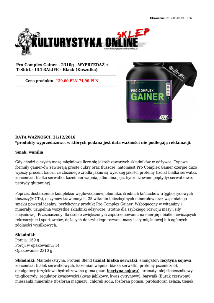 Utworzono: 2017-03-08 09:31:36 Pro Complex Gainer - 2310g - WYPRZEDAŻ + T-Shirt - ULTRALIFE - Black (Koszulka) Cena produktu: 129,00 PLN 74,90 PLN DATA WAŻNOŚCI: 31/12/2016 *produkty wyprzedażowe, w których podana jest data ważności nie podlegają reklamacji. Smak: wanilia Gdy chodzi o czystą masę mięśniową liczy się jakość zawartych składników w odżywce. Typowe formuły gainer-ów zawierają proste cukry oraz tłuszcze, natomiast Pro Complex Gainer czerpie dużo wyższy procent kalorii ze złożonego źródła jakim są wysokiej jakości proteiny (izolat białka serwatki, koncentrat białka serwatki, kazeinian wapnia, albumina jaja, hydrolizowane peptydy: serwatkowe, peptydy glutaminy). Poprzez dostarczenie kompleksu węglowodanów, błonnika, średnich łańcuchów trójglicerydowych tłuszczy(MCTs), enzymów trawiennych, 25 witamin i niezbędnych minerałów oraz wspaniałego smaku powstał idealny, perfekcyjny produkt Pro Complex Gainer. Wzbogacony w witaminy i minerały, uzupełnia wszystkie składniki odżywcze, istotne dla szybkiego rozwoju masy i siły mięśniowej. Przeznaczony dla osób o zwiększonym zapotrzebowaniu na energię i białko, ćwiczących rekreacyjnie i sportowców, dążących do szybkiego rozwoju masy i siły mięśniowej lub ogólnych zdolności wysiłkowych. Składniki: Porcja: 169 g Porcji w opakowaniu: 14 Opakowanie: 2310 g Składniki: Maltodekstryna, Protein Blend (izolat białka serwatki, emulgator: lecytyna sojowa, koncentrat białek serwatkowych, kazeinian wapnia, białka serwatki, proteiny pszeniczne), emulgatory (częściowo hydrolizowana guma guar, lecytyna sojowa), aromaty, olej słonecznikowy, tri-glicerydy, regulator kwasowości (kwas jabłkowy, kwas cytrynowy), barwnik (Burak czerwony), mieszanki mineralne (fosforan magnezu, chlorek sodu, fosforan potasu, pirofosforan żelaza, tlenek cynku, mangan siarczanu, glukonian miedzi, sześciowodny chlorek chromu, jodek potasu, sód, molibden), kompleks enzymów (amylaza, proteaza, celulaza, beta-D-galaktozydazy, lipazy), substancje słodzące (sukraloza, acesulfam potasowy), mieszanka witamin (Dekstroza jednowodna, kwas askorbinowy , octan witaminy E, Niacyna, biotyna, witamina A, octan, wapń-D-pantotenian, chlorowodorek pirydoksyny, kwas foliowy, cholekalcyferol, chlorowodorek tiaminy, ryboflawina, witamina B12), przeciwutleniacz (mieszane tokoferole). Alergeny: Zawiera mleko, soję (lecytyna) i jajka. Może zawierać gluten i orzechy. Wartości odżywcze w 169 g w 100 g 2754 kJ / 657 kcal 1639 kJ / 391 kcal Tłuszcz 8,5 g 5,1 g tłuszcze nasycone 1,5 g 0,9 g Węglowodany 85 g 51 g cukry 8,5 g 5,1 g Błonnik 4,2 g 2,5 g Białko 60 g 36 g Sól 0,77 g 0,46 g Sód 308 g 183 mg Witamina A 542 µ 323 µ Witamina D 3,4 µ 2µ Witamina E 6,4 mg 3,8 mg Witamina C 40 mg 24 mg Witamina B1 0,9 mg 0,6 mg Witamina B2 1,1 mg 0,6 mg Niacyna 12 mg 7,3 mg Witamina B6 1,3 mg 0,8 mg Kwas foliowy 129 µ 77 µ Witamina B12 1,2 mg 0,7 mg 99 µ 59 µ Kwas pantotenowy 3,9 mg 2,3 mg Potas 977 mg 582 mg Wapń 395 mg 235 mg Fosfor 588 mg 350 mg Magnez 184 mg 110 mg Żelazo 6,9 mg 4,1 mg Cynk 4,9 mg 2,9 mg Miedź 1 mg 0,6 mg Mangan 1 mg 0,6 mg Selen 62 µ 37 µ Chrom 21 µ 13 µ Molibden 28 µ 17 µ Jod 88 µ 52 µ Wartość energetyczna Biotyna Suplementy diety nie mogą być stosowane jako substytut zróżnicowanej diety. Pamiętaj, że tylko zdrowy tryb życia i zrównoważony sposób odżywiania zapewniają prawidłowe funkcjonowanie organizmu i zachowanie dobrej kondycji. Sposób użycia: Spożywać Nie przekraczać zalecanej porcji do spożycia w ciągu dnia. Produkt nie może być stosowany przez osoby uczulone na którykolwiek z jego składników. Najlepiej spożyć przed końcem: miesiąc, rok pod kodem kreskowym Numer partii produkcyjnej: pod kodem kreskowym Przechowywać w miejscu niedostępnym dla małych dzieci. Przechowywać w miejscu suchym w temperaturze pokojowej w szczelnie zamkniętych opakowaniach. Masa netto opakowania: 2310g T-SHIRT Ultralife Jeśli marzysz o tym, aby podkreślić swoją budowę oraz chcesz, aby Twoi znajomi nie pozostali obojętni na zmiany, których dokonujesz na siłowni to z całą pewnością powinieneś zainteresować się koszulką Ultralife. T-shirt przeznaczony zarówno na siłownię, jak i na co dzień doskonale uwypukla Twoje mięśnie, wizualizując je większymi i lepiej zdefiniowanymi niż kiedykolwiek wcześniej! Doskonała koszulka Ultralife nada Twojemu ciału kulturystycznego wyglądu, którego zazdrościć Ci będą wszyscy bez wyjątku! Wszystko za sprawą specjalnego kroju, niwelującego wszelkie braki symetrii. Koszulka posiada olbrzymie logo na piersi, a to co jest najważniejsze jest komfortowa podczas wysiłku fizycznego. Rozmiar A B C S 48 cm 66 cm 19 cm M 53 cm 72 cm 20 cm L 56 cm 74 cm 20 cm XL 59 cm 76 cm 21 cm XXL 62 cm 78 cm 21 cm Adres: http://www.ko.sklep.pl/ Telefon: kom. 782 010 880 Email: [email protected]