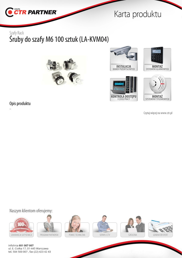 Szafy Rack Śruby do szafy M6 100 sztuk (LA-KVM04) INSTALACJA KAMER PRZEMYSŁOWYCH KONTROLA DOSTĘPU I CZASU PRACY MONTAŻ SYSTEMÓW ALARMOWYCH MONTAŻ SYSTEMÓW P.POŻAROWYCH Opis produktu ... Czytaj więcej na www.ctr.pl Naszym klientom oferujemy: GWARANCJA SATYSFAKCJI PROGRAM PARTNERSKI POMOC TECHNICZNA SERWIS CCTV SZKOLENIA GENERATOR OFERT