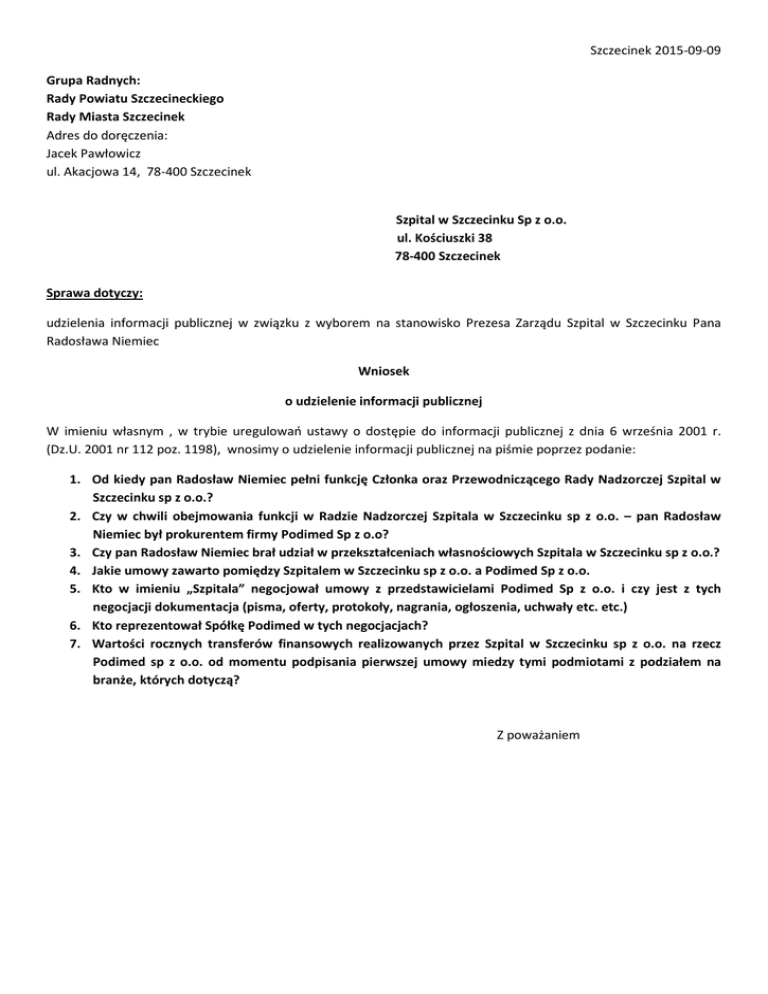Szczecinek 2015-09-09 Grupa Radnych: Rady Powiatu Szczecineckiego Rady Miasta Szczecinek Adres do doręczenia: Jacek Pawłowicz ul. Akacjowa 14, 78-400 Szczecinek Szpital w Szczecinku Sp z o.o. ul. Kościuszki 38 78-400 Szczecinek Sprawa dotyczy: udzielenia informacji publicznej w związku z wyborem na stanowisko Prezesa Zarządu Szpital w Szczecinku Pana Radosława Niemiec Wniosek o udzielenie informacji publicznej W imieniu własnym , w trybie uregulowań ustawy o dostępie do informacji publicznej z dnia 6 września 2001 r. (Dz.U. 2001 nr 112 poz. 1198), wnosimy o udzielenie informacji publicznej na piśmie poprzez podanie: 1. Od kiedy pan Radosław Niemiec pełni funkcję Członka oraz Przewodniczącego Rady Nadzorczej Szpital w Szczecinku sp z o.o.? 2. Czy w chwili obejmowania funkcji w Radzie Nadzorczej Szpitala w Szczecinku sp z o.o. – pan Radosław Niemiec był prokurentem firmy Podimed Sp z o.o? 3. Czy pan Radosław Niemiec brał udział w przekształceniach własnościowych Szpitala w Szczecinku sp z o.o.? 4. Jakie umowy zawarto pomiędzy Szpitalem w Szczecinku sp z o.o. a Podimed Sp z o.o. 5. Kto w imieniu „Szpitala” negocjował umowy z przedstawicielami Podimed Sp z o.o. i czy jest z tych negocjacji dokumentacja (pisma, oferty, protokoły, nagrania, ogłoszenia, uchwały etc. etc.) 6. Kto reprezentował Spółkę Podimed w tych negocjacjach? 7. Wartości rocznych transferów finansowych realizowanych przez Szpital w Szczecinku sp z o.o. na rzecz Podimed sp z o.o. od momentu podpisania pierwszej umowy miedzy tymi podmiotami z podziałem na branże, których dotyczą? Z poważaniem