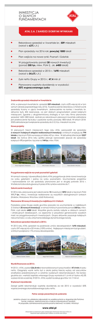 INWESTYCJA O SILNYCH FUNDAMENTACH ATAL S.A. Z BARDZO DOBRYMI WYNIKAMI Rekordowa sprzedaż w I kwartale br.: 509 mieszkań (wzrost o 62% r./r.) Plan sprzedaży na 2016 rok: powyżej 1800 lokali Plan wejścia na nowe rynki: Poznań i Gdańsk W przygotowaniu ponad 30 nowych inwestycji (ponad 350 tys. mkw. PUM tj . ok. 6400 lokali) Rekordowa sprzedaż w 2015 r.: 1690 mieszkań (wzrost o 54,6% r./r.) Zysk netto Grupy w 2015 r.: 47,4 mln zł Planowana wypłata dywidendy w wysokości 50% wypracowanego zysku Znakomita sprzedaż mieszkań w I kwartale br. ATAL w pierwszym kwartale br. sprzedał 509 mieszkań, czyli o 62% więcej niż w tym samym okresie poprzedniego roku (315). To jednocześnie rekordowy w historii wynik sprzedaży liczony w ujęciu kwartalnym. Jednocześnie na koniec I kwartału br. aktywne były 404 rezerwacje, co jest dobrym prognostykiem przed kolejnymi miesiącami. Zgodnie z długoterminową strategią w tym roku firma planowała sprzedaż 1600-1800 lokali. Jednak po rekordowym pierwszym kwartale zakładane jest przekroczenie tej liczby i uzyskanie wyniku powyżej 1800 lokali. W latach 20182020 zakładane jest zwiększenie sprzedaży do 2-2,5 tys. mieszkań rocznie. Nowe projekty W pierwszych trzech miesiącach tego roku ATAL wprowadził do sprzedaży 6 nowych i kolejnych etapów realizowanych inwestycji, w których znajdują się 794 lokale o łącznym PUM wynoszącym blisko 43 tys. mkw. W aktualnej ofercie jest 2227 lokali. Do końca 2016 roku spółka planuje wprowadzić jeszcze do sprzedaży kolejnych 17 projektów, łącznie na 144 tys. mkw. PUM. ATAL Towers II, Wrocław Nowy Targówek II, Warszawa Nowe Żerniki II, Wrocław Przygotowane wejście na rynek poznański i gdański W ramach rozwoju i dywersyfikacji oferty ATAL przygotowuje dwie nowe inwestycje na rynku gdańskim i jedną na rynku poznańskim. Uruchomienie projektów i wprowadzenie ich do sprzedaży planowane jest w drugiej połowie 2016 r. W efekcie liczba obsługiwanych przez ATAL rynków wzrośnie do 7. Zakończenie inwestycji W 2016 roku planowane jest zakończenie 15 inwestycji (1892 lokali o łącznym PUM 111,7 tys. mkw.). Inwestycje realizowane są wszystkich obsługiwanych rynkach (Kraków, Warszawa, Wrocław, Łódź i Katowice). Planowane 30 nowych inwestycji w najbliższych 2-3 latach Posiadany przez Grupę zasób gruntów pozwala na uruchomienie w najbliższych 2-3 latach 30 nowych inwestycji, w ramach których powstanie ponad 350 tys. mkw. PUM, czyli około 6400 lokali. Wszystkie grunty zostały nabyte w dobrych cenach i atrakcyjnych lokalizacjach, co zapewnia w przyszłości generowanie wysokich marż na przygotowywanych inwestycjach. Grupa aktywnie poszukuje kolejnych nieruchomości, w celu utrzymania dalszego dynamicznego rozwój. Rekordowa sprzedaż mieszkań w 2015 r. W 2015 roku ATAL sprzedał na podstawie umów deweloperskich 1690 mieszkań, czyli o 597 więcej niż w 2014 roku (1093 umów). Najlepszym miesiącem był grudzień, w którym podpisano 172 umowy deweloperskie. Wielicka Garden, Kraków Bagry Park III, Kraków Bajeczna Apartamenty, Kraków Wyniki finansowe za 2015 r. W 2015 r. ATAL uzyskał 226,8 mln zł skonsolidowanych przychodów i 47,4 mln zł zysku netto. Osiągnięty wynik netto był o około jedną trzecią wyższy od szacunków analityków przedstawionych w ostatnio wydanych rekomendacjach. Na koniec grudnia ub.r. wartość kapitału własnego Grupy wyniosła 611,6 mln zł i była o 42,5% wyższa niż rok wcześniej. W 2015 r. ATAL wydał na zakup gruntów 161,7 mln zł. W planach dywidenda Zarząd spółki rekomenduje wypłatę dywidendy za rok 2015 w wysokości 50% wypracowanego skonsolidowanego zysku netto. Pełna wersja prezentacji do pobrania Jesteśmy otwarci na udzielenie odpowiedzi na wszelkie pytania w dogodnej dla Państwa formie: mailowo, telefonicznie lub w trakcie indywidualnych spotkań. W przypadku zainteresowania pytania prosimy kierować na adres: [email protected] www.atal.pl Otrzymałeś tę wiadomość gdyż subskrybujesz informacje dotyczące ATAL S.A. Zapisanie bądź wypisanie jest możliwe na stronie www.atal.pl