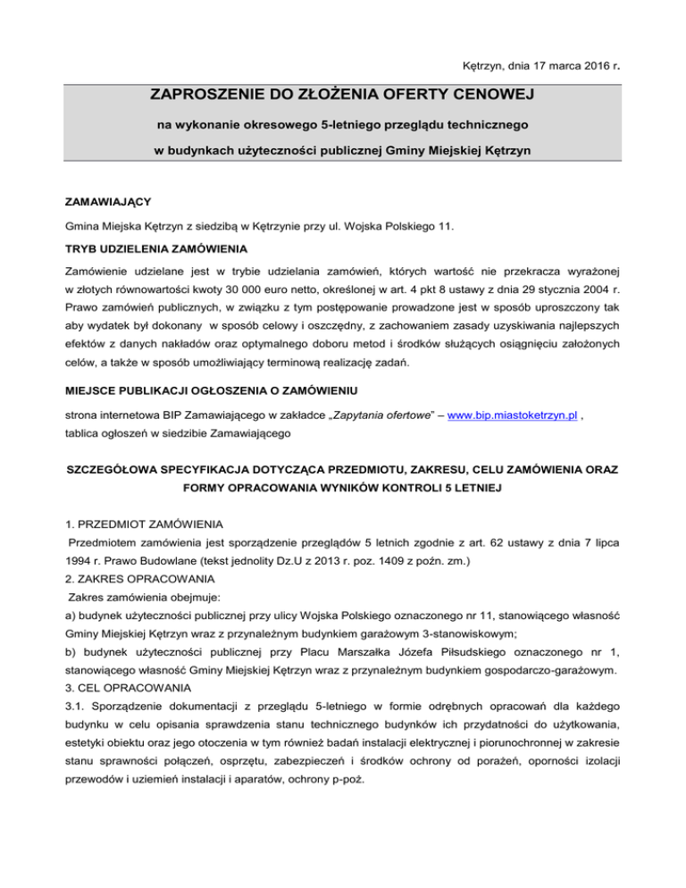 Kętrzyn, dnia 17 marca 2016 r. ZAPROSZENIE DO ZŁOŻENIA OFERTY CENOWEJ na wykonanie okresowego 5-letniego przeglądu technicznego w budynkach użyteczności publicznej Gminy Miejskiej Kętrzyn ZAMAWIAJĄCY Gmina Miejska Kętrzyn z siedzibą w Kętrzynie przy ul. Wojska Polskiego 11. TRYB UDZIELENIA ZAMÓWIENIA Zamówienie udzielane jest w trybie udzielania zamówień, których wartość nie przekracza wyrażonej w złotych równowartości kwoty 30 000 euro netto, określonej w art. 4 pkt 8 ustawy z dnia 29 stycznia 2004 r. Prawo zamówień publicznych, w związku z tym postępowanie prowadzone jest w sposób uproszczony tak aby wydatek był dokonany w sposób celowy i oszczędny, z zachowaniem zasady uzyskiwania najlepszych efektów z danych nakładów oraz optymalnego doboru metod i środków służących osiągnięciu założonych celów, a także w sposób umożliwiający terminową realizację zadań. MIEJSCE PUBLIKACJI OGŁOSZENIA O ZAMÓWIENIU strona internetowa BIP Zamawiającego w zakładce „Zapytania ofertowe” – www.bip.miastoketrzyn.pl , tablica ogłoszeń w siedzibie Zamawiającego SZCZEGÓŁOWA SPECYFIKACJA DOTYCZĄCA PRZEDMIOTU, ZAKRESU, CELU ZAMÓWIENIA ORAZ FORMY OPRACOWANIA WYNIKÓW KONTROLI 5 LETNIEJ 1. PRZEDMIOT ZAMÓWIENIA Przedmiotem zamówienia jest sporządzenie przeglądów 5 letnich zgodnie z art. 62 ustawy z dnia 7 lipca 1994 r. Prawo Budowlane (tekst jednolity Dz.U z 2013 r. poz. 1409 z poźn. zm.) 2. ZAKRES OPRACOWANIA Zakres zamówienia obejmuje: a) budynek użyteczności publicznej przy ulicy Wojska Polskiego oznaczonego nr 11, stanowiącego własność Gminy Miejskiej Kętrzyn wraz z przynależnym budynkiem garażowym 3-stanowiskowym; b) budynek użyteczności publicznej przy Placu Marszałka Józefa Piłsudskiego oznaczonego nr 1, stanowiącego własność Gminy Miejskiej Kętrzyn wraz z przynależnym budynkiem gospodarczo-garażowym. 3. CEL OPRACOWANIA 3.1. Sporządzenie dokumentacji z przeglądu 5-letniego w formie odrębnych opracowań dla każdego budynku w celu opisania sprawdzenia stanu technicznego budynków ich przydatności do użytkowania, estetyki obiektu oraz jego otoczenia w tym również badań instalacji elektrycznej i piorunochronnej w zakresie stanu sprawności połączeń, osprzętu, zabezpieczeń i środków ochrony od porażeń, oporności izolacji przewodów i uziemień instalacji i aparatów, ochrony p-poż. 4. FORMA OPRACOWANIA Całość opracowania z przeglądu 5 letniego powinno być wykonane i przekazane w formie pisemnej oraz na nośniku elektronicznym (dysku CD). Forma pisemna musi zawierać: 4.1. Stronę tytułową na której zamieszczona jest : - nazwa i adres oraz nip , regon i telefon firmy wykonującej przegląd - nazwę przeglądu - liczbę porządkową budynku wg załącznika nr 1 do umowy - nazwę obiektu oraz jego zdjęcie (kolorowe) - adres - nazwę i adres zleceniodawcy - autorów poszczególnych protokołów branżowych wraz z pieczątkami, podpisami, nr uprawnień i nr ewidencji w Izbie - miejscowość i datę wykonania opracowania 4.2. Spis zawartości opracowania 4.3. Dane ogólne - przedmiot - zakres - cel 4.5. Opis techniczny budynku z wyszczególnieniem jego elementów - opis ogólny zawierający technologię w jakiej obiekt wybudowano, wyszczególnione elementy budynku i ich opis (ok. 16 - 20 elementów) 4.6. Określenie procentu zużycia budynku min. 2 metodami: 1 - metoda Rossa uwzględniająca wiek i stan utrzymania budynku, 2 – metoda oparta o stan zachowania elementów z podziałem na minimum trzy elementy: stan surowy, wykończeniowy, instalacje. 4.7. Wstępną kwalifikację do jakiego rodzaju remontu czy też naprawy bieżącej nadaje się budynek. 4.8. Protokoły 4.8.1. Branży budowlanej zawierający: nazwę obiektu, adres, datę przeglądu oraz autora i podstawę prawną wykonanego przeglądu. Tabelarycznie zestawione przeglądy wszystkich pomieszczeń, piwnic i strychów, klatek schodowych elewacji, dachu i innych miejsc w budynku z opisem miejsca występowania usterek, opis usterek, sposób usunięcia usterek oraz ich stopień pilności. Protokół kominiarski z wypisanymi usterkami i zaleceniami pokontrolnymi dostarczony przez zlecającego. Ocena estetyki otoczenia budynku możliwości ewakuacji ludzi w razie wystąpienia pożaru itp. Dokumentacja fotograficzna budynku zawierająca co najmniej wszystkie elewacje, dach i inne miejsca występowania usterek. Wnioski i zalecenia z branży budowlanej oraz podpis osoby wykonującej przegląd. 4.8.2. Branży instalacyjnej - sanitarnej (wodnej, kanalizacyjne, c.o. innej jeżeli występuje) zawierający: nazwę obiektu datę wykonania przeglądu oraz osobę wykonującą przegląd, podstawę prawną. Tabelaryczne zestawienie zawierające lokalizację miejsca przeglądu, opis spostrzeżeń, braków i uszkodzeń, stopień pilności naprawy. Wnioski i zalecenia pokontrolne oraz podpis osoby wykonującej przegląd. - elektrycznej zawierający: nazwę obiektu datę wykonania przeglądu oraz osobę wykonującą przegląd. Dane instalacji, układ sieciowy instalacji, napięcie znamionowe sieci zasilającej, ochrona p-porażeniowa dodatkowa, przyrządy użyte do badań z opisem typu nr fabrycznego i świadectwa legalizacji urządzenia. Tabelaryczne zestawienie zawierające lokalizację miejsca przeglądu, opis spostrzeżeń, braków i uszkodzeń, zalecenia, stopień pilności naprawy Protokół z pomiaru skuteczności ochrony przeciwporażeniowej, pomiary rezystancji izolacji instalacji i urządzeń elektrycznych oraz podstawę prawną. Ocena stanu technicznego badanej instalacji, wyniki pomiarów, zalecenia uwagi, orzeczenia. - wentylacji mechanicznej zawierający: pomiary sprawności wentylacji w poszczególnych pomieszczeniach, opis stanu technicznego instalacji, kontrolę urządzeń (wentylatorów, przewodów i osprzętu instalacyjnego), drożności przewodów kominowych i wentylacyjnych. 4.9. Dokumentacja na nośniku elektronicznych na płycie CD powi