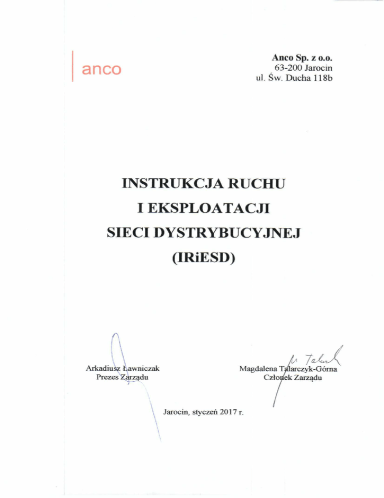 SPIS TREŚCI Spis treści 1. 2 3 4 5. 6. 7. 8. 9. 10. 11. 12. 13. 14. 15. 16. 17. 18. 19. 20. 21. 22. 23. 24. 25. 26. 27. 28. 29. 30. WSTĘP I DEFINICJE........................................................................................... 3 PODSTAWY PRAWNE I ZASADY OBOWIĄZYWANIA IRiESD .................. 12 DOKUMENTY POWIĄZANE ........................................................................... 14 INFORMACJE DODATKOWE ......................................................................... 14 PROCEDURA WPROWADZENIA I AKTUALIZACJI IRiESD ....................... 15 SYSTEM DYSTRYBUCYJNY .......................................................................... 15 WSPÓŁPRACA OSD Z OPERATORAMI SYSTEMÓW GAZOWYCH ........... 24 PLANOWANIE ROZWOJU SYSTEMU DYSTRYBUCYJNEGO .................... 24 PRZYŁĄCZANIE DO SIECI DYSTRYBUCYJNEJ .......................................... 25 PRAWA I OBOWIĄZKI ODBIORCÓW ........................................................... 32 UMOWA KOMPLEKSOWA ZAWARTA POMIĘDZY OSD A ODBIORCĄ .. 37 UMOWA DYSTRYBUCYJNA .......................................................................... 37 WARUNKI ŚWIADCZENIA USŁUG DYSTRYBUCJI .................................... 44 PROCEDURA ZGŁASZANIA UMÓW DO REALIZACJI ................................ 46 ZASADY ROCZNEJ AKTUALIZACJI PZD ..................................................... 53 PROCEDURA ZMIANY SPRZEDAWCY ......................................................... 54 PRACE W SYSTEMIE DYSTRYBUCYJNYM ................................................. 57 ZASADY WYMIANY INFORMACJI POMIĘDZY STRONAMI UMOWY DYSTRYBUCYJNEJ ......................................................................................... 58 WYMAGANIA DOTYCZĄCE UKŁADÓW POMIAROWYCH, SYSTEMÓW TELEMETRYCZNYCH ORAZ ZASADY DOKONYWANIA POMIARÓW.... 62 ZASADY WYKONYWANIA ODCZYTÓW UKŁADÓW POMIAROWYCH I PRZEKAZYWANIA DANYCH POMIAROWYCH I ROZLICZENIOWYCH .. 68 ZASADY OKREŚLANIA ILOŚCI PALIWA GAZOWEGO W PUNKTACH TYPU WR .......................................................................................................... 73 SZACOWANIE OBJĘTOŚCI I ILOŚCI PALIWA GAZOWEGO W PUNKTACH WYJŚCIA TYPU WS ......................................................................................... 74 ALOKACJE OBJĘTOŚCI I ILOŚCI PALIWA GAZOWEGO W PUNKTACH WEJŚCIA I WYJŚCIA ....................................................................................... 76 ZGŁASZANIE PZD DO RELIZACJI ................................................................. 83 BILANSOWANIE SYSTEMU DYSTRYBUCYJNEGO .................................... 86 ZARZĄDZANIE OGRANICZENIAMI W SYSTEMIE DYSTRYBUCYJNYM 89 WARUNKI ROZLICZANIA USŁUGI DYSTRYBUCJI .................................... 99 FAKTUROWANIE I PŁATNOŚCI .................................................................... 99 SPOSOBY POSTĘPOWANIA W SYTUACJACH AWARYJNYCH ................. 99 PRZEPISY KOŃCOWE ................................................................................... 103 INSTRUKCJA RUCHU I EKSPLOATACJI SIECI DYSRTRYBUCYJNEJ (IRiESD) Strona | 2 1. WSTĘP I DEFINICJE 1.1. Niniejsza Instrukcja Ruchu i Eksploatacji Sieci Dystrybucyjnej (IRiESD) reguluje warunki świadczenia usług Dystrybucji w Systemie dystrybucyjnym Anco Sp. z o.o. z siedzibą w Jarocinie, wyznaczonej decyzją Prezesa URE na Operatora Systemu Dystrybucyjnego (OSD). 1.2. Definicje: Alokacja Przypisanie poszczególnym ZUD ilości Paliwa gazowego przekazanego do Dystrybucji w Punkcie wejścia lub odebranego w Punkcie wyjścia. Alokacja operatywna Określenie szacunkowych ilości Paliwa gazowego dostarczonego do Punktu wejścia do Obszaru dystrybucyjnego lub odebranego w Punkcie wyjścia z Obszaru dystrybucyjnego w poprzedniej Dobie gazowej. Alokacja rozliczeniowa Określenie ilości Paliwa gazowego dostarczonego do Punktu wejścia do Obszaru dystrybucyjnego lub odebranego w Punkcie wyjścia z Obszaru dystrybucyjnego w poszczególnych Dobach gazowych zakończonego Miesiąca gazowego. Awaria Zdarzenie niespodziewane, które spowodowało znaczną utratę technicznej sprawności Sieci dystrybucyjnej lub przyłączonych do niej sieci, instalacji lub urządzeń, lub bezpośrednie poważne zagrożenie dla zdrowia ludzkiego, mienia lub środowiska, lub nagłą konieczność przeciwdziałania powstaniu takich zagrożeń, lub ich uniknięcia oraz usunięcia skutków spowodowanych ich wystąpieniem, i mogące spowodować ograniczenia w dostarczaniu, Dystrybucji lub poborze Paliwa gazowego. Bilansowanie fizyczne Działalność OSD mająca na celu zrównoważenie ilości Paliwa gazowego dostarczanego i odbieranego z Systemu dystrybucyjnego. Bilansowanie handlowe Działalność OSD polegająca na określeniu i rozliczaniu różnicy pomiędzy ilością Paliwa gazowego przypisaną ZUD w Punktach wejścia do Systemu dystrybucyjnego w ramach procedury Alokacji rozliczeniowej a ilością Paliwa gazowego odebraną przez ZUD z Systemu dystrybucyjnego, ustaloną na podstawie wskazań Układów INSTRUKCJA RUCHU I EKSPLOATACJI SIECI DYSRTRYBUCYJNEJ (IRiESD) Strona | 3 pomiarowych lub metodologii szacowania opisanej w rozdziale 22. Bilansowanie Bilansowane fizyczne i handlowe prowadzone przez OSD. Cena Referencyjna Gazu (CRG) Średnioważona cena zakupu Paliwa gazowego przez OSD, opublikowana na stronie internetowej OSD i wyznaczona odrębnie dla podsystemu gazu grupy E oraz dla podsystemu gazu grupy L (podgrupy Lw, Ls i Lm) zgodnie z zasadami określonymi w IRiESD. Ciepło spalania Ilość energii, która zostałaby wydzielona w postaci ciepła w wyniku całkowitego i zupełnego spalania w powietrzu 1 m3 Paliwa gazowego w Warunkach normalnych, gdyby reakcja zachodziła pod stałym ciśnieniem absolutnym 101,325 kPa, a wszystkie oprócz wody - produkty spalania były w stanie gazowym, para wodna utworzona w procesie spalania uległa kondensacji i wszystkie produkty spalania (zarówno produkty w stanie gazowym, jak i woda w stanie 