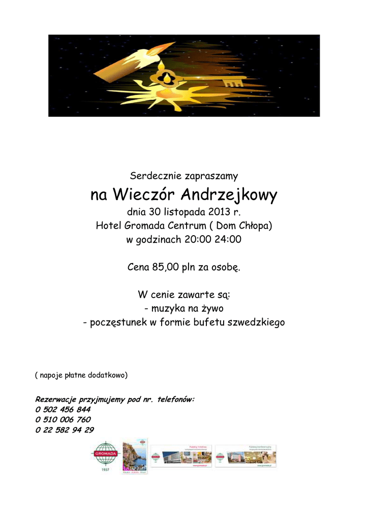 Serdecznie zapraszamy na Wieczór Andrzejkowy dnia 30 listopada 2013 r. Hotel Gromada Centrum ( Dom Chłopa) w godzinach 20:00 24:00 Cena 85,00 pln za osobę. W cenie zawarte są: - muzyka na żywo - poczęstunek w formie bufetu szwedzkiego ( napoje płatne dodatkowo) Rezerwacje przyjmujemy pod nr. telefonów: 0 502 456 844 0 510 006 760 0 22 582 94 29 Propozycja na bufet Andrzejkowy 2013 Menu : - roladki z łososia z farszem serowym - roladki z cukinii z musem z sera białego i ziól prowansalskich - pasztet z indyka gotowany na parze z żurawiną i morelą - galantyna z kurczaka z suszonymi pomidorami - mięsa pieczone / karkówka , szynka wieprzowa , boczek marynowany w świeżych ziołach / - jaja faszerowane pieczarkami z natką doprawiane pieprzem Sałatki : - sałatka z ziemniaków ze śledziem , szczypiorem i ogórkiem konserwowym z musztardą - mieszane sałaty z pomidorem i papryką podane z dresingiem z ogórka zielonego i octu balsamico - sałatka jarzynowa z majonezem - sałatka z fasoli czerwonej , papryki , ogórków , ziemniaka i sosu z vinegret Zupy : - aromatyczny rosół z makaronem - żurek z jajkiem Dania głowne : - plastry pieczonego kurczaka z sosem pesto - paski pieczonej wieprzowiny z zieloną papryką i czerwonym winem - szaszłyki z indyka z warzywami - mini kotlety wieprzowe – frykadela - ryż z warzywami - makaron z sosem z oliwek , kurczaka , kaparów i pomidorów - ziemniaki pieczone z rozmarynem i solą morska Desery : - racuchy z bananami i sosem z truskawek - sernik - ciasto marchewkowe