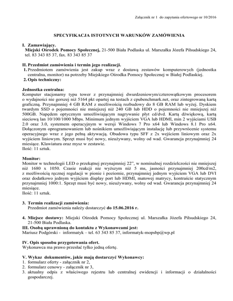 Załącznik nr 1 do zapytania ofertowego nr 10/2016 SPECYFIKACJA ISTOTNYCH WARUNKÓW ZAMÓWIENIA I. Zamawiający. Miejski Ośrodek Pomocy Społecznej, 21-500 Biała Podlaska ul. Marszałka Józefa Piłsudskiego 24, tel. 83 343 85 37, fax. 83 343 85 37 II. Przedmiot zamówienia i termin jego realizacji. 1. Przedmiotem zamówienia jest zakup wraz z dostawą zestawów komputerowych (jednostka centralna, monitor) na potrzeby Miejskiego Ośrodka Pomocy Społecznej w Białej Podlaskiej. 2. Opis techniczny: Jednostka centralna: Komputer stacjonarny typu tower z przynajmniej dwurdzeniowym/czterowątkowym procesorem o wydajności nie gorszej niż 5164 pkt opartej na testach z cpubenchmark.net, oraz zintegrowaną kartą graficzną. Przynajmniej 4 GB RAM z możliwością rozbudowy do 8 GB RAM lub wyżej. Dyskiem twardym SSD o pojemności nie mniejszej niż 240 GB lub HDD o pojemności nie mniejszej niż 500GB. Napędem optycznym umożliwiającym nagrywanie płyt cd/dvd. Kartą dźwiękową, kartą sieciową lan 10/100/1000 Mbps. Minimum jednym wyjściem VGA lub HDMI, min 2 wyjściami USB 2.0 oraz 3.0, systemem operacyjnym w wersji Windows 7 Pro x64 lub Windows 8.1 Pro x64. Dołączonym oprogramowaniem lub nośnikiem umożliwiającym instalację lub przywrócenie systemu operacyjnego wraz z jego pełną aktywacją. Obudowa typu SFF z 2x wejściem liniowym oraz 2x wyjściem liniowym. Sprzęt musi być nowy, nieużywany, wolny od wad. Gwarancja przynajmniej 24 miesiące. Klawiatura oraz mysz w zestawie. Ilość: 11 sztuk. Monitor: Monitor w technologii LED o przekątnej przynajmniej 22”, w nominalnej rozdzielczości nie mniejszej niż 1680 x 1050. Czasie reakcji nie wyższym niż 5 ms, jasności przynajmniej 200cd/m2, z możliwością ręcznej regulacji w pionie i poziomie, przynajmniej jednym wyjściem VGA lub DVI oraz dodatkowo jednym wyjściem display port lub HDMI, matowej matrycy, kontraście statycznym przynajmniej 1000:1. Sprzęt musi być nowy, nieużywany, wolny od wad. Gwarancja przynajmniej 24 miesiące. Ilość: 11 sztuk. 3. Termin realizacji zamówienia: Przedmiot zamówienia należy dostarczyć do 15.06.2016 r. 4. Miejsce dostawy: Miejski Ośrodek Pomocy Społecznej ul. Marszałka Józefa Piłsudskiego 24, 21-500 Biała Podlaska. III. Osobą uprawnioną do kontaktu z Wykonawcami jest: Mariusz Podgórski - informatyk – tel. 63 343 85 37, [email protected] IV. Opis sposobu przygotowania ofert. Wykonawca ma prawo przesłać tylko jedną ofertę. V. Wykaz dokumentów, jakie mają dostarczyć Wykonawcy: 1. formularz oferty - załącznik nr 2, 2. formularz cenowy - załącznik nr 3, 3. aktualny odpis z właściwego rejestru lub centralnej ewidencji i informacji o działalności gospodarczej. VI. Miejsce i termin składania ofert. 1. Ofertę należy złożyć w siedzibie Zamawiającego w Sekretariacie MOPS w zamkniętej kopercie z napisem „Oferta na zakup wraz z dostawą zestawów komputerowych (jednostka, monitor) na potrzeby Miejskiego Ośrodka Pomocy Społecznej w Białej Podlaskiej w terminie do 25.05.2016 r. do godziny 12:00. 2. Oferty przesłane po terminie nie będą rozpatrywane. VII. Opis sposobu obliczania ceny oferty 1. Wykonawca może podać tylko jedną cenę. 2. Cena brutto oferty musi zawierać wszystkie koszty niezbędne do realizacji całego przedmiotu zamówienia. VIII. Kryterium oceny oferty. 1. W celu wyboru najkorzystniejszej oferty Zamawiający przyjął następujące kryterium: cena oferty brutto - 100% 2. Za najkorzystniejszą zostanie uznana oferta z najniższą ceną. IX. Informacje dotyczące wyboru najkorzystniejszej oferty. O wyborze najkorzystniejszej oferty zawiadomimy oferentów e-mailem oraz publikując informację na stronie internetowej www.mops-bialapodlaska.pl. Biała Podlaska, dnia 18. 05.2016 r.