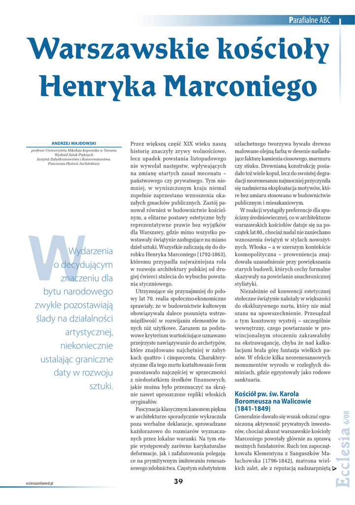 Parafialne ABC Warszawskie kościoły Henryka Marconiego W Wydarzenia o decydującym znaczeniu dla bytu narodowego zwykle pozostawiają ślady na działalności artystycznej, niekoniecznie ustalając graniczne daty w rozwoju sztuki. [email protected] Przez większą część XIX wieku naszą historię znaczyły zrywy wolnościowe, lecz upadek powstania listopadowego nie wywołał następstw, wpływających na zmianę utartych zasad mecenatu – państwowego czy prywatnego. Tym niemniej, w wyniszczonym kraju niemal zupełnie zaprzestano wznoszenia okazałych gmachów publicznych. Zastój panował również w budownictwie kościelnym, a elitarne postawy estetyczne były reprezentatywne prawie bez wyjątków dla Warszawy, gdzie mimo wszystko powstawały świątynie zasługujące na miano dzieł sztuki. Wszystkie zaliczają się do dorobku Henryka Marconiego (1792-1863), któremu przypadła najważniejsza rola w rozwoju architektury polskiej od drugiej ćwierci stulecia do wybuchu powstania styczniowego. Utrzymujące się przynajmniej do połowy lat 70. realia społeczno-ekonomiczne sprawiały, że w budownictwie kultowym obowiązywała dalece posunięta wstrzemięźliwość w rozwijaniu elementów innych niż użytkowe. Zarazem za podstawowe kryterium wartościujące uznawano przejrzyste nawiązywanie do archetypów, które znajdowano najchętniej w zabytkach quattro- i cinquecenta. Charakterystyczne dla tego nurtu kształtowanie form pozostawało najczęściej w sprzeczności z niedostatkiem środków finansowych, jakie można było przeznaczyć na skrajnie nawet uproszczone repliki włoskich oryginałów. Fascynacja klasycznym kanonem piękna w architekturze sporadycznie wykraczała poza werbalne deklaracje, sprowadzane każdorazowo do rozmiarów wyznaczanych przez lokalne warunki. Na tym etapie występowały zarówno karykaturalne deformacje, jak i zafałszowania polegające na prymitywnym imitowaniu renesansowego zdobnictwa. Częstym substytutem 39 szlachetnego tworzywa bywało drewno malowane olejną farbą w desenie naśladujące fakturę kamienia ciosowego, marmuru czy stiuku. Drewnianą konstrukcję posiadało też wiele kopuł, lecz do swoistej degradacji neorenesansu najmocniej przyczyniła się nadmierna eksploatacja motywów, które bez umiaru stosowano w budownictwie publicznym i mieszkaniowym. W reakcji wystąpiły preferencje dla spuścizny średniowiecznej, co w architekturze warszawskich kościołów datuje się na początek lat 80., chociaż nadal nie zaniechano wznoszenia świątyń w stylach nowożytnych. Włoska – a w szerszym kontekście kosmopolityczna – proweniencja znajdowała uzasadnienie przy powiększaniu starych budowli, których cechy formalne skazywały na powielanie anachronicznej stylistyki. Niezależnie od konwencji estetycznej stołeczne świątynie należały w większości do ekskluzywnego nurtu, który nie miał szans na upowszechnienie. Przesądzał o tym kosztowny wystrój – szczególnie wewnętrzny, czego powtarzanie w prowincjonalnym otoczeniu zakrawałoby na ekstrawagancję, chyba że nad kalkulacjami brała górę fantazja wielkich panów. W efekcie kilka neorenesansowych monumentów wyrosło w rozległych dominiach, gdzie egzystowały jako rodowe sanktuaria. Kościół pw. św. Karola Boromeusza na Walicowie (1841-1849) Generalnie dawało się wszak odczuć ograniczoną aktywność prywatnych inwestorów, chociaż akurat warszawskie kościoły Marconiego powstały głównie za sprawą możnych fundatorów. Ruch ten zapoczątkowała Klementyna z Sanguszków Małachowska (1796-1842), matrona wielkich zalet, ale z reputacją nadszarpniętą 6/08 ANDRZEJ MAJDOWSKI profesor Uniwersytetu Mikołaja Kopernika w Toruniu Wydział Sztuk Pięknych Instytut Zabytkoznawstwa i Konserwatorstwa, Pracownia Historii Architektury Parafialne ABC dzieł imponujących skalą profesjonalnej wszechstronności. Bodaj jedyny w owej epoce odkrywał nowe horyzonty przed architekturą krajową. Zgoła wyjątkowe okazały się także treści, jakimi nasycił projekt konkursowy. Stąd właśnie od Walicowa rozpoczyna się warszawski neorenesans w budownictwie sakralnym. Do wartości wynikających z nowatorstwa form trzeba dodać wątek techniczno-technologiczny, dopełniający obrazu całości i zapewniający budowli poczesne miejsce również wśród prekursorskich rozwiązań swojej epoki. Kościół okazał się bowiem pierwszym u nas obiektem kultu ukształtowanym dzięki szerokiemu i konsekwentnemu wykorzystaniu odlewów żelaznych – użytych do celów konstrukcyjnych oraz dekoracyjnych i dających się traktować jako pewna całość o wyraźnie zarysowanej strukturze. Mimo wszystko ograniczone zaufanie do stateczności żeliwnych kolumn spra- 6/08 fot. arch. A. Majdowski przez wybujały temperament. Na zbożny cel przeznaczyła 200 tys. złp., życząc sobie, żeby przyszłej świątyni patronował św. Karol Boromeusz. Jeżeli z życiorysu arcybiskupa Mediolanu wyodrębnić bezkompromisowe zabiegi o czystość obyczajów, to ofiara ognistej damy przedstawia się jako uczynek ekspiacyjny. Na przełomie lat 30. i 40. ogłoszono pierwszy w Królestwie Polskim konkurs architektoniczny na obiekt sakralny. Szacunkowy koszt realizacji zwycięskiego projektu wyniósł 350 tys., a uzupełnienie brakujących środków nastąpiło z funduszów rządowych. Ponadto stołeczny magistrat przekazał plac pod budowę na zachodnich peryferiach miasta, a inwestycja ruszyła w 1841 roku. Kiedy urzeczywistniał się zamysł wzniesienia kościoła, Marconi był już artystą dojrzałym, chociaż największe osiągnięcia miał jeszcze przed sobą. Talent oraz umiejętności predestynowały go do tworzenia Warszawski kościół pw. św. Anny w Wilanowie 40 wiło, iż niezbyt wydłużony korpus wyróżnia się aż dziewięcioma przęsłami. Gęste rozczłonkowanie przydaje mu wspólnych cech ze starochrześcijańskimi bazylikami, gdzie o rozstawieniu podpór decydowała znikoma wytrzym