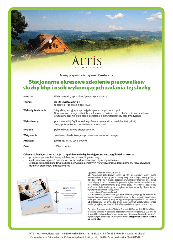 Mamy przyjemność zaprosić Państwa na: Stacjonarne okresowe szkolenie pracowników służby bhp i osób wykonujących zadania tej służby Miejsce: Wisła, ośrodek „Lepiarzówka”; www.lepiarzowka.pl Termin: 22–25 kwietnia 2013 r. (początek 1-go dnia o godz. 11.00) Wykłady i ćwiczenia: 32 godziny lekcyjne, w tym zajęcia z pierwszej pomocy i ppoż. Uczestnicy otrzymują materiały szkoleniowe, zaświadczenie o ukończeniu ww. szkolenia oraz zaświadczenie o ukończeniu szkolenia z pierwszej pomocy przedmedycznej. Wykładowcy: pracownicy PIP, Ogólnopolskiego Stowarzyszenia Pracowników Służby BHP, straży pożarnej oraz czynni ratownicy medyczni. Noclegi: pokoje dwuosobowe z łazienkami, TV. Wyżywienie: śniadania, obiady, kolacje + przerwy kawowe w trakcie zajęć. Atrakcje: jacuzzi i sauna w cenie pobytu Cena: 1250,- zł brutto. Celem szkolenia jest aktualizacja i uzupełnianie wiedzy i umiejętności w szczególności z zakresu: • przepisów prawnych dotyczących bezpieczeństwa i higieny pracy, • analizy i oceny zagrożeń oraz metod oceny ryzyka związanego z tymi zagrożeniami, • organizacji i metod kształtowania bezpiecznych i higienicznych warunków pracy, a także pomoc w rozwiązywaniu trudnych problemów z dziedziny BHP. Zgodnie z Kodeksem Pracy (art. 23711): §1. Pracodawca zatrudniający więcej niż 100 pracowników tworzy służbę bezpieczeństwa i higieny pracy, zwaną dalej „służbą bhp”, pełniącą funkcje doradcze i kontrolne w zakresie bezpieczeństwa i higieny pracy, zaś pracodawca zatrudniający do 100 pracowników powierza wykonywanie zadań służby bhp pracownikowi zatrudnionemu przy innej pracy. Pracodawca posiadający ukończone szkolenie niezbędne do wykonywania zadań służby bhp może sam wykonywać zadania tej służby, jeżeli: 1) zatrudnia do 10 pracowników albo 2) zatrudnia do 20 pracowników i jest zakwalifikowany do grupy działalności, dla której ustalono nie wyższą niż trzecią kategorię ryzyka w rozumieniu przepisów o ubezpieczeniu społecznym z tytułu wypadków przy pracy i chorób zawodowych. §2. Pracodawca - w przypadku braku kompetentnych pracowników - może powierzyć wykonywanie zadań służby bhp specjalistom spoza zakładu pracy. Zgodnie z Rozporządzeniem Ministra Gospodarki i Pracy z dnia 27 lipca 2004 r. w sprawie szkolenia w dziedzinie bezpieczeństwa i higieny pracy (Dz. U. z dnia 18 sierpnia 2004 r.) obowiązkowe szkolenia okresowe dla pracowników służby bhp i osób wykonujących zadania tej służby powinny być przeprowadzane nie rzadziej niż raz na 5 lat. ALTIS • ul. Słowackiego 16/9 • 43-300 Bielsko-Biała • tel. 33 812 35 15 • fax 33 816 94 61 • www.altisbhp.pl Firma wpisana do Rejestru Instytucji Szkoleniowych woj. śląskiego dnia 11.04.2012 r., nr ewidencyjny 2.24/00115/2012