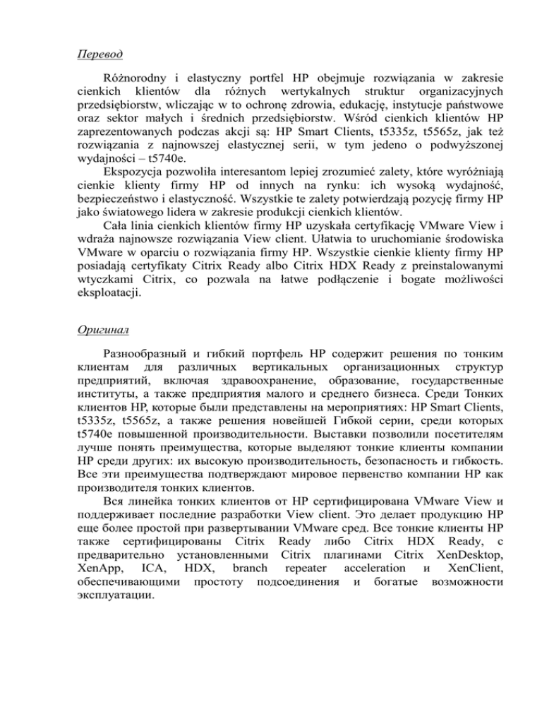 Перевод Różnorodny i elastyczny portfel HP obejmuje rozwiązania w zakresie cienkich klientów dla różnych wertykalnych struktur organizacyjnych przedsiębiorstw, wliczając w to ochronę zdrowia, edukację, instytucje państwowe oraz sektor małych i średnich przedsiębiorstw. Wśród cienkich klientów HP zaprezentowanych podczas akcji są: HP Smart Clients, t5335z, t5565z, jak też rozwiązania z najnowszej elastycznej serii, w tym jedeno o podwyższonej wydajności – t5740e. Ekspozycja pozwoliła interesantom lepiej zrozumieć zalety, które wyróżniają cienkie klienty firmy HP od innych na rynku: ich wysoką wydajność, bezpieczeństwo i elastyczność. Wszystkie te zalety potwierdzają pozycję firmy HP jako światowego lidera w zakresie produkcji cienkich klientów. Cała linia cienkich klientów firmy HP uzyskała certyfikację VMware View i wdraża najnowsze rozwiązania View client. Ułatwia to uruchomianie środowiska VMware w oparciu o rozwiązania firmy HP. Wszystkie cienkie klienty firmy HP posiadają certyfikaty Citrix Ready albo Citrix HDX Ready z preinstalowanymi wtyczkami Citrix, co pozwala na łatwe podłączenie i bogate możliwości eksploatacji. Оригинал Разнообразный и гибкий портфель HP содержит решения по тонким клиентам для различных вертикальных организационных структур предприятий, включая здравоохранение, образование, государственные институты, а также предприятия малого и среднего бизнеса. Среди Тонких клиентов НР, которые были представлены на мероприятиях: HP Smart Clients, t5335z, t5565z, а также решения новейшей Гибкой серии, среди которых t5740e повышенной производительности. Выставки позволили посетителям лучше понять преимущества, которые выделяют тонкие клиенты компании HP среди других: их высокую производительность, безопасность и гибкость. Все эти преимущества подтверждают мировое первенство компании НР как производителя тонких клиентов. Вся линейка тонких клиентов от НР сертифицирована VMware View и поддерживает последние разработки View client. Это делает продукцию НР еще более простой при развертывании VMware сред. Все тонкие клиенты НР также сертифицированы Citrix Ready либо Citrix HDX Ready, с предварительно установленными Citrix плагинами Citrix XenDesktop, XenApp, ICA, HDX, branch repeater acceleration и XenClient, обеспечивающими простоту подсоединения и богатые возможности эксплуатации.