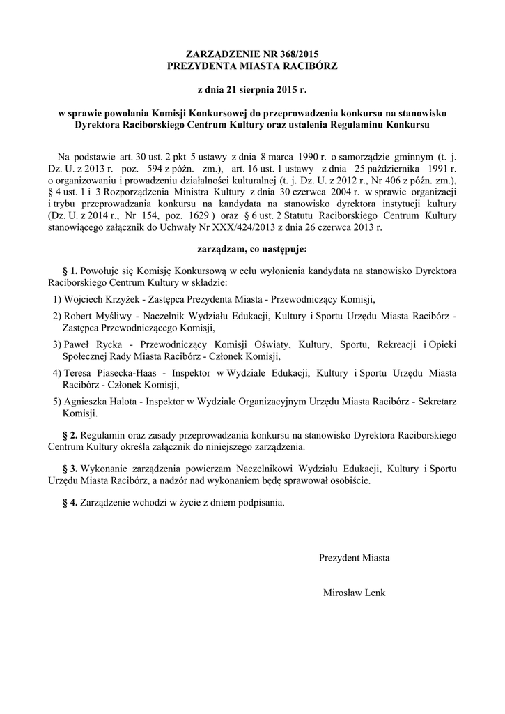 ZARZĄDZENIE NR 368/2015 PREZYDENTA MIASTA RACIBÓRZ z dnia 21 sierpnia 2015 r. w sprawie powołania Komisji Konkursowej do przeprowadzenia konkursu na stanowisko Dyrektora Raciborskiego Centrum Kultury oraz ustalenia Regulaminu Konkursu Na podstawie art. 30 ust. 2 pkt 5 ustawy z dnia 8 marca 1990 r. o samorządzie gminnym (t. j. Dz. U. z 2013 r. poz. 594 z późn. zm.), art. 16 ust. 1 ustawy z dnia 25 października 1991 r. o organizowaniu i prowadzeniu działalności kulturalnej (t. j. Dz. U. z 2012 r., Nr 406 z późn. zm.), § 4 ust. 1 i 3 Rozporządzenia Ministra Kultury z dnia 30 czerwca 2004 r. w sprawie organizacji i trybu przeprowadzania konkursu na kandydata na stanowisko dyrektora instytucji kultury (Dz. U. z 2014 r., Nr 154, poz. 1629 ) oraz § 6 ust. 2 Statutu Raciborskiego Centrum Kultury stanowiącego załącznik do Uchwały Nr XXX/424/2013 z dnia 26 czerwca 2013 r. zarządzam, co następuje: § 1. Powołuje się Komisję Konkursową w celu wyłonienia kandydata na stanowisko Dyrektora Raciborskiego Centrum Kultury w składzie: 1) Wojciech Krzyżek - Zastępca Prezydenta Miasta - Przewodniczący Komisji, 2) Robert Myśliwy - Naczelnik Wydziału Edukacji, Kultury i Sportu Urzędu Miasta Racibórz Zastępca Przewodniczącego Komisji, 3) Paweł Rycka - Przewodniczący Komisji Oświaty, Kultury, Sportu, Rekreacji i Opieki Społecznej Rady Miasta Racibórz - Członek Komisji, 4) Teresa Piasecka-Haas - Inspektor w Wydziale Edukacji, Kultury i Sportu Urzędu Miasta Racibórz - Członek Komisji, 5) Agnieszka Halota - Inspektor w Wydziale Organizacyjnym Urzędu Miasta Racibórz - Sekretarz Komisji. § 2. Regulamin oraz zasady przeprowadzania konkursu na stanowisko Dyrektora Raciborskiego Centrum Kultury określa załącznik do niniejszego zarządzenia. § 3. Wykonanie zarządzenia powierzam Naczelnikowi Wydziału Edukacji, Kultury i Sportu Urzędu Miasta Racibórz, a nadzór nad wykonaniem będę sprawował osobiście. § 4. Zarządzenie wchodzi w życie z dniem podpisania. Prezydent Miasta Mirosław Lenk Uzasadnienie W związku z decyzją Prezydenta Miasta o zatrudnieniu Dyrektora Raciborskiego Centrum Kultury, który zostanie wyłoniony w drodze konkursu, nastąpiła konieczność wprowadzenia niniejszego zarządzenia. Załącznik do Zarządzenia Nr 368/2015 Prezydenta Miasta Racibórz z dnia 21 sierpnia 2015 r. REGULAMIN I ZASADY PRZEPROWADZENIA KONKURSU na stanowisko Dyrektora Raciborskiego Centrum Kultury I. ZASADY OGÓLNE 1) Celem konkursu jest wyłonienie kandydata na stanowisko Dyrektora Raciborskiego Centrum Kultury. 2) Konkurs ma charakter otwarty i może w nim uczestniczyć każdy, kto odpowiada kryteriom określonym w ogłoszeniu konkursu na stanowisko Dyrektora Raciborskiego Centrum Kultury. 3) Kandydat na stanowisko dyrektora nie zostanie dopuszczony do postępowania konkursowego w przypadku, gdy: a) ofertę złożył po terminie wskazanym w ogłoszeniu konkursu, b) oferta nie zawiera wszystkich dokumentów wskazanych w ogłoszeniu konkursu lub z oferty wynika, że kandydat nie spełnia wymagań wskazanych w ogłoszeniu. 4) Członkiem komisji konkursowej, zwanej dalej „komisją”, nie może być osoba przystępująca do konkursu albo będąca małżonkiem takiej osoby lub jej krewnym albo powinowatym, albo pozostająca wobec niej w takim stosunku prawnym lub faktycznym, że może to budzić uzasadnione wątpliwości co do jej obiektywizmu i bezstronności. 5) Jeżeli okoliczności, o których mowa w ust. 4, zostaną ujawnione po powołaniu komisji, Prezydent Miasta niezwłocznie wyznacza inną osobę z zachowaniem trybu dla powołania tego członka. 6) Komisja pracuje na posiedzeniach zwoływanych przez Przewodniczącego Komisji. 7) Pracami komisji kieruje Przewodniczącego Komisji. Przewodniczący, a pod jego nieobecność Zastępca 8) Prace komisji są prowadzone, jeżeli w posiedzeniu bierze udział co najmniej 2/3 jej członków. 9) Komisja podejmuje uchwały zwykłą większością głosów w głosowaniach jawnych. 1 10) Protokoły z posiedzeń komisji, zawierające informacje o przebiegu obrad i podjętych ustaleniach, podpisują członkowie komisji obecni na posiedzeniu. Protokół jest jawny. 11) Członek komisji obecny na posiedzeniu, który odmawia podpisania protokołu, zobowiązany jest zgłosić do protokołu pisemne zastrzeżenie i z tym zastrzeżeniem podpisać protokół. 12) Ogłoszenie konkursu na stanowisko Dyrektora Raciborskiego Centrum Kultury umieszczone zostaje: w dwóch dziennikach o zasięgu regionalnym, Biuletynie Informacji Publicznej Urzędu Miasta Racibórz, Biuletynie Informacji Publicznej Raciborskiego Centrum Kultury, na tablicy ogłoszeń Urzędu Miasta Racibórz oraz zostaje podane do wiadomości pracownikom Raciborskiego Centrum Kultury w sposób przyjęty w tej instytucji. 13) Ustala się następujące wymagania niezbędne i dodatkowe dla uczestników konkursu na Dyrektora Raciborskiego Centrum Kultury: 1. Wymagania niezbędne: a) wykształcenie wyższe II stopnia, b) co najmniej 5 lat doświadczenia w wykonywaniu pracy zawodowej lub prowadzeniu działalności gospodarczej, c) przedstawienie koncepcji funkcjonowania i rozwoju Raciborskiego Centrum Kultury w perspektywie najbliższych 5 lat (w formie pisemnej; preferowane parametry dokumentu: do 10 stron formatu A4, rodzaj czcionki: Times New Roman 12p, odstępy między wierszami 1,5 wiersza), d) znajomość aktów prawnych: ustawy o finansach publicznych, ustawy prawo zamówień publicznych, ustawy o organizowaniu i prowadzeniu działalności kulturalnej, e) znajomość zagadnień związanych z pozyskiwaniem środków pozabudżetowych, w tym unijnych, na realizację projektów kulturalnych. f) brak przeciwwskazań kierowniczym, zdrowotnych do wykonywania pracy na stanowisku g) pełna zdolność do czynności prawnych oraz korzystanie z pełni praw publicznych, h) niekaralność za umyślne przestępstwo ścigane z oskarżenia publicznego lub umyślne przestępstwo skarbowe, i) ni