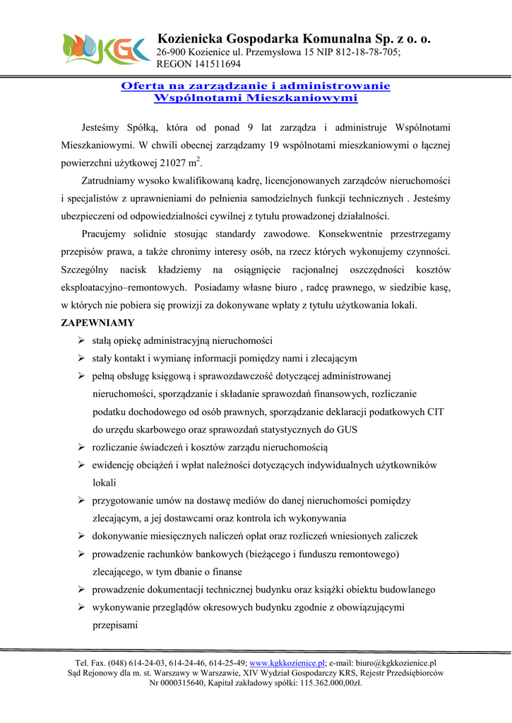 Kozienicka Gospodarka Komunalna Sp. z o. o. 26-900 Kozienice ul. Przemysłowa 15 NIP 812-18-78-705; REGON 141511694 Oferta na zarządzanie i administrowanie Wspólnotami Mieszkaniowymi Jesteśmy Spółką, która od ponad 9 lat zarządza i administruje Wspólnotami Mieszkaniowymi. W chwili obecnej zarządzamy 19 wspólnotami mieszkaniowymi o łącznej powierzchni użytkowej 21027 m2. Zatrudniamy wysoko kwalifikowaną kadrę, licencjonowanych zarządców nieruchomości i specjalistów z uprawnieniami do pełnienia samodzielnych funkcji technicznych . Jesteśmy ubezpieczeni od odpowiedzialności cywilnej z tytułu prowadzonej działalności. Pracujemy solidnie stosując standardy zawodowe. Konsekwentnie przestrzegamy przepisów prawa, a także chronimy interesy osób, na rzecz których wykonujemy czynności. Szczególny nacisk kładziemy na osiągnięcie racjonalnej oszczędności kosztów eksploatacyjno–remontowych. Posiadamy własne biuro , radcę prawnego, w siedzibie kasę, w których nie pobiera się prowizji za dokonywane wpłaty z tytułu użytkowania lokali. ZAPEWNIAMY stałą opiekę administracyjną nieruchomości stały kontakt i wymianę informacji pomiędzy nami i zlecającym pełną obsługę księgową i sprawozdawczość dotyczącej administrowanej nieruchomości, sporządzanie i składanie sprawozdań finansowych, rozliczanie podatku dochodowego od osób prawnych, sporządzanie deklaracji podatkowych CIT do urzędu skarbowego oraz sprawozdań statystycznych do GUS rozliczanie świadczeń i kosztów zarządu nieruchomością ewidencję obciążeń i wpłat należności dotyczących indywidualnych użytkowników lokali przygotowanie umów na dostawę mediów do danej nieruchomości pomiędzy zlecającym, a jej dostawcami oraz kontrola ich wykonywania dokonywanie miesięcznych naliczeń opłat oraz rozliczeń wniesionych zaliczek prowadzenie rachunków bankowych (bieżącego i funduszu remontowego) zlecającego, w tym dbanie o finanse prowadzenie dokumentacji technicznej budynku oraz książki obiektu budowlanego wykonywanie przeglądów okresowych budynku zgodnie z obowiązującymi przepisami Tel. Fax. (048) 614-24-03, 614-24-46, 614-25-49; www.kgkkozienice.pl; e-mail: [email protected] Sąd Rejonowy dla m. st. Warszawy w Warszawie, XIV Wydział Gospodarczy KRS, Rejestr Przedsiębiorców Nr 0000315640, Kapitał zakładowy spółki: 115.362.000,00zł. Kozienicka Gospodarka Komunalna Sp. z o. o. 26-900 Kozienice ul. Przemysłowa 15 NIP 812-18-78-705; REGON 141511694 odczyty wodomierzy i ciepłomierzy gotowość na wypadek awarii organizowanie i obsługę zebrań absolutoryjnych wraz z przygotowaniem niezbędnej dokumentacji prawnej z nimi związanych (udostępniamy własne sale –świetlice na zebrania) przygotowywanie do 31 marca każdego roku, po konsultacji ze zlecającym, rocznych planów gospodarczych dot. nieruchomości wspólnej, w tym planu remontów opracowywanie wieloletnich planów remontów na ustalony ze zlecającym okres UMOŻLIWIAMY zlecającemu pełną kontrolę nad finansami i gospodarką administrowanej nieruchomości dokonywanie opłat z tytułu utrzymania nieruchomości wspólnej i dostarczonych do lokali mediów bez prowizji w naszej kasie ubezpieczenie nieruchomości na korzystnych warunkach wynegocjowanych przez doświadczonego brokera dostęp zlecającemu do bieżącej informacji o wszelkich zmianach przepisów prawnych z zakresu zarządzania nieruchomością zawartych m.in. w „Ustawie o własności lokali”, Ustawie o gospodarce nieruchomościami, „Kodeksie cywilnym” i „Prawie budowlanym” windykację należności według zasad określonych w regulaminie obsługę prawną zlecającego administrowanie nieruchomością oraz reprezentowanie go (zastępstwo procesowe) w sądzie zlecanie usuwania awarii technicznych w nieruchomości zlecanie wykonania usług konserwacyjnych w nieruchomości GWARANTUJEMY profesjonalne wykonywanie obowiązków zarządcy nieruchomości racjonalne zarządzanie funduszami, w tym dążenie do minimalizacji kosztów utrzymania nieruchomości fachową obsługę każdego zlecającego usługę ścisłą współpracę ze zlecającym usługę Tel. Fax. (048) 614-24-03, 614-24-46, 614-25-49; www.kgkkozienice.pl; e-mail: [email protected] Sąd Rejonowy dla m. st. Warszawy w Warszawie, XIV Wydział Gospodarczy KRS, Rejestr Przedsiębiorców Nr 0000315640, Kapitał zakładowy spółki: 115.362.000,00zł. Kozienicka Gospodarka Komunalna Sp. z o. o. 26-900 Kozienice ul. Przemysłowa 15 NIP 812-18-78-705; REGON 141511694 Szczegółowy zakres obowiązków i sposób organizacji zarządzania jest każdorazowo zgodnie z życzeniem zlecającego - zawarty w stosownej umowie o zarządzanie nieruchomością. Zapytanie ofertowe dotyczące Państwa nieruchomości prosimy uzupełnić o dane, które pozwolą nam przygotować najbardziej optymalną, indywidualną dla wspólnoty mieszkaniowej ofertę tj.: adres nieruchomości powierzchnia nieruchomości ilość lokali ilość lokali własnościowych wyposażenie techniczne budynku (instalacje) Zapytania ofertowe prosimy kierować do: Kozienicka Gospodarka Komunalna Sp. z o.o. 26-900 Kozienice ul. Przemysłowa 15 Telefon: 48 6142403 Poczta e-mail: [email protected] Serdecznie zapraszamy Szanownych Państwa do skorzystania z naszej oferty. Tel. Fax. (048) 614-24-03, 614-24-46, 614-25-49; www.kgkkozienice.pl; e-mail: [email protected] Sąd Rejonowy dla m. st. Warszawy w Warszawie, XIV Wydział Gospodarczy KRS, Rejestr Przedsiębiorców Nr 0000315640, Kapitał zakładowy spółki: 115.362.000,00zł.