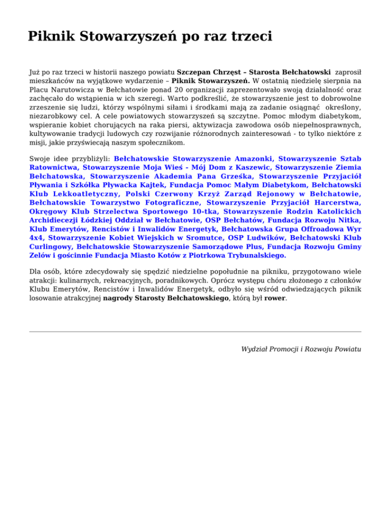 Piknik Stowarzyszeń po raz trzeci Już po raz trzeci w historii naszego powiatu Szczepan Chrzęst – Starosta Bełchatowski zaprosił mieszkańców na wyjątkowe wydarzenie – Piknik Stowarzyszeń. W ostatnią niedzielę sierpnia na Placu Narutowicza w Bełchatowie ponad 20 organizacji zaprezentowało swoją działalność oraz zachęcało do wstąpienia w ich szeregi. Warto podkreślić, że stowarzyszenie jest to dobrowolne zrzeszenie się ludzi, którzy wspólnymi siłami i środkami mają za zadanie osiągnąć określony, niezarobkowy cel. A cele powiatowych stowarzyszeń są szczytne. Pomoc młodym diabetykom, wspieranie kobiet chorujących na raka piersi, aktywizacja zawodowa osób niepełnosprawnych, kultywowanie tradycji ludowych czy rozwijanie różnorodnych zainteresowań - to tylko niektóre z misji, jakie przyświecają naszym społecznikom. Swoje idee przybliżyli: Bełchatowskie Stowarzyszenie Amazonki, Stowarzyszenie Sztab Ratownictwa, Stowarzyszenie Moja Wieś - Mój Dom z Kaszewic, Stowarzyszenie Ziemia Bełchatowska, Stowarzyszenie Akademia Pana Grześka, Stowarzyszenie Przyjaciół Pływania i Szkółka Pływacka Kajtek, Fundacja Pomoc Małym Diabetykom, Bełchatowski Klub Lekkoatletyczny, Polski Czerwony Krzyż Zarząd Rejonowy w Bełchatowie, Bełchatowskie Towarzystwo Fotograficzne, Stowarzyszenie Przyjaciół Harcerstwa, Okręgowy Klub Strzelectwa Sportowego 10-tka, Stowarzyszenie Rodzin Katolickich Archidiecezji Łódzkiej Oddział w Bełchatowie, OSP Bełchatów, Fundacja Rozwoju Nitka, Klub Emerytów, Rencistów i Inwalidów Energetyk, Bełchatowska Grupa Offroadowa Wyr 4x4, Stowarzyszenie Kobiet Wiejskich w Sromutce, OSP Ludwików, Bełchatowski Klub Curlingowy, Bełchatowskie Stowarzyszenie Samorządowe Plus, Fundacja Rozwoju Gminy Zelów i gościnnie Fundacja Miasto Kotów z Piotrkowa Trybunalskiego. Dla osób, które zdecydowały się spędzić niedzielne popołudnie na pikniku, przygotowano wiele atrakcji: kulinarnych, rekreacyjnych, poradnikowych. Oprócz występu chóru złożonego z członków Klubu Emerytów, Rencistów i Inwalidów Energetyk, odbyło się wśród odwiedzających piknik losowanie atrakcyjnej nagrody Starosty Bełchatowskiego, którą był rower. Wydział Promocji i Rozwoju Powiatu