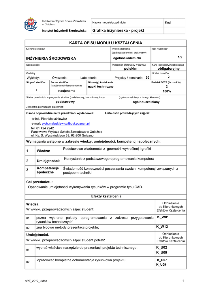 Państwowa Wyższa Szkoła Zawodowa w Gnieźnie Nazwa modułu/przedmiotu Instytut Inżynierii Środowiska Grafika inżynierska - projekt Kod KARTA OPISU MODUŁU KSZTAŁCENIA Kierunek studiów Profil kształcenia Rok / Semestr (ogólnoakademicki, praktyczny) 1/2 ogólnoakademicki INŻYNIERIA ŚRODOWISKA Specjalność Przedmiot oferowany w języku: Kurs (obligatoryjny/obieralny) polskim obligatoryjny Liczba punktów Godziny Wykłady: Stopień studiów: I Ćwiczenia: Forma studiów (stacjonarna/niestacjonarna) 2 Projekty / seminaria: 30 Laboratoria: Obszar(y) kształcenia Podział ECTS (liczba i %) nauki techniczne 2 100% stacjonarne Status przedmiotu w programie studiów (podstawowy, kierunkowy, inny) Liczba punktów (ogólnouczelniany, z innego kierunku) ogólnouczelniany podstawowy xx Jednostka prowadząca przedmiot: Osoba odpowiedzialna za przedmiot / wykładowca: xxx Lista osób prowadzących zajęcia: dr inż. Piotr Maluśkiewicz e-mail: [email protected] tel. 61 424 2942 Państwowa Wyższa Szkoła Zawodowa w Gnieźnie ul. Ks. S. Wyszyńskiego 38, 62-200 Gniezno Wymagania wstępne w zakresie wiedzy, umiejętności, kompetencji społecznych: Podstawowe wiadomości z geometrii wykreślnej i grafiki 1 Wiedza: 2 Umiejętności: Korzystanie z podstawowego oprogramowania komputera 3 Kompetencje społeczne Świadomość konieczności poszerzania swoich kompetencji związanych z postępem techniki Cel przedmiotu: Opanowanie umiejętności wykonywania rysunków w programie typu CAD. Efekty kształcenia Wiedza. W wyniku przeprowadzonych zajęć student: Odniesienie do Kierunkowych Efektów Kształcenia 01 pozna wybrane pakiety oprogramowania z zakresu przygotowania rysunków technicznych’ K_W01 02 zna typowe metody prezentacji projektu; K_W12 Umiejętności. W wyniku przeprowadzonych zajęć student potrafi: 01 02 wybrać właściwe narzędzie do prezentacji projektu technicznego; opracować kompletną dokumentacje rysunkowa projektu; APE_2012_3.doc Odniesienie do Kierunkowych Efektów Kształcenia K_U02 K_U09 K_U07 K_U09 1 03 Państwowa Wyższa Szkoła Zawodowa w Gnieźnie Nazwa modułu/przedmiotu Instytut Inżynierii Środowiska Grafika inżynierska - projekt posługiwać się efektywnie oprogramowaniem typu AUTOCAD. Kompetencje społeczne. W wyniku przeprowadzonych zajęć student zdobędzie następujące kompetencje: Kod K_U09 Odniesienie do Kierunkowych Efektów Kształcenia 01 rozumie potrzebę permanentnego kształcenia się i przekazywania w sposób zrozumiały informacji z najbliższym otoczeniem w działalności zawodowej; K_K01 K_K07 02 rozumie pozatechniczne ( w tym ekologiczne) skutki swojego działania i jego wpływu na środowisko; K_K02 dbałość o precyzyjny i estetyczny sposób prezentacji wytworów technicznych. K_K07 03 Sposoby sprawdzenia efektów kształcenia Wykonanie pełnej dokumentacji zadanego projektu: Treści programowe Użytkowanie programu AutoCAD 2009 PL – rysunki płaskie: komunikacja z programem; budowa rysunku wektorowego; współrzędne w rysunku; tworzenie nowego rysunku; podział rysunku na warstwy; narzędzia wspomagające rysowanie i edycję; rysowanie obiektów; oglądanie i edycja rysunku; wymiarowanie elementów rysunku; wydruk rysunku; dopasowanie programu AutoCAD 2009 PL do potrzeb użytkownika. Przygotowanie rysunku instalacyjnego. Literatura podstawowa: 1. Pikoń A., AutoCAD 2000 PL - Pierwsze kroki, Helion, 2000. 2. Babiuch M., AutoCAD 2000 PL ćwiczenia praktyczne, 2000. Literatura uzupełniająca: 1. Jaskulski A., AutoCAD 2000 PL i EN, Mikom, 1999. 2. Graf J., AutoCAD 2000 PL - ćwiczenia, Mikom, 2000. Obciążenie pracą studenta forma aktywności Godzin ECTS Łączny nakład pracy 50 3 Zajęcia wymagające indywidualnego kontaktu z nauczycielem 30 2 Zajęcia o charakterze praktycznym 30 2 APE_2012_3.doc 2