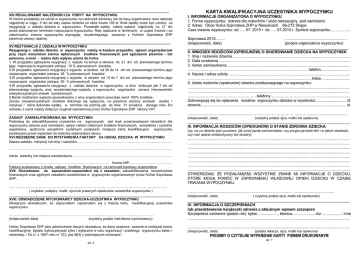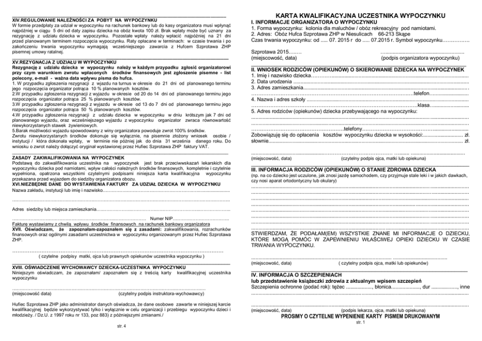 ____________________________________________________________________________________ XIV.REGULOWANIE NALEŻNOŚCI ZA POBYT NA WYPOCZYNKU W formie przedpłaty za udział w wypoczynku na rachunek bankowy lub do kasy organizatora musi wpłynąć najpóźniej w ciągu 5 dni od daty zapisu dziecka na obóz kwota 100 zł. Brak wpłaty może być uznany za rezygnację z udziału dziecka w wypoczynku. Pozostałe wpłaty należy wpłacić najpóźniej na 21 dni przed planowanym terminem rozpoczęcia wypoczynku. Raty opłacane w terminach: w czasie trwania i po zakończeniu trwania wypoczynku wymagają wcześniejszego zawarcia z Hufcem Szprotawa ZHP pisemnej umowy ratalnej. _____________________________________________________________________________________ XV.REZYGNACJA Z UDZIAŁU W WYPOCZYNKU Rezygnację z udziału dziecka w wypoczynku należy w każdym przypadku zgłosić organizatorowi przy czym warunkiem zwrotu wpłaconych środków finansowych jest zgłoszenie pisemne - list polecony, e-mail - ważna data wpływu pisma do hufca. 1. W przypadku zgłoszenia rezygnacji z wjazdu na turnus w okresie do 21 dni od planowanego terminu jego rozpoczęcia organizator potrąca 10 % planowanych kosztów. 2.W przypadku zgłoszenia rezygnacji z wyjazdu w okresie od 20 do 14 dni od planowanego terminu jego rozpoczęcia organizator potrąca 25 % planowanych kosztów. 3.W przypadku zgłoszenia rezygnacji z wyjazdu w okresie od 13 do 7 dni od planowanego terminu jego rozpoczęcia organizator potrąca 50 % planowanych kosztów. 4.W przypadku zgłoszenia rezygnacji z udziału dziecka w wypoczynku w dniu krótszym jak 7 dni od planowanego wyjazdu, oraz wcześniejszego wyjazdu z wypoczynku organizator zwraca równowartość niewykorzystanych stawek żywieniowych. 5.Barak możliwości wyjazdu spowodowany z winy organizatora powoduje zwrot 100% środków. Zwrotu niewykorzystanych środków dokonuje się wyłącznie, na pisemnie złożony wniosek osobie / instytucji / która dokonała wpłaty, w terminie nie później jak do dnia 31 września danego roku. Do wniosku o zwrot należy dołączyć oryginał wystawionej przez Hufiec Szprotawa ZHP faktury VAT. _____________________________________________________________________________________ ZASADY ZAKWALIFIKOWANIA NA WYPOCZYNEK Podstawą do zakwalifikowania uczestnika na wypoczynek jest brak przeciwwskazań lekarskich dla wypoczynku dziecka pod namiotami, wpływ całości należnych środków finansowych, kompletnie i czytelnie wypełniona, opatrzona wszystkimi czytelnymi podpisami niniejsza karta kwalifikacyjna wypoczynku przekazana przed wyjazdem do siedziby organizatora obozu. XVI.NIEZBĘDNE DANE DO WYSTAWIENIA FAKTURY ZA UDZIAŁ DZIECKA W WYPOCZYNKU Nazwa zakładu, instytucji lub imię i nazwisko…………….……………………………………..…......................... …………………………………………………………………………………………………….………………………. Adres siedziby lub miejsca zamieszkania…..……………….……………………………………..………………... ………………………………………………………….………………… Numer NIP………………………………. Fakturę wystawiamy z chwilą wpływu środków finansowych na rachunek bankowy organizatora XVII. Oświadczam, że zapoznałam-zapoznałem się z zasadami: zakwalifikowania, rozrachunków finansowych oraz ogólnymi zasadami uczestnictwa w wypoczynku organizowanym przez Hufiec Szprotawa ZHP. …………………………………………………………………………………………………………… ( czytelne podpisy matki, ojca lub prawnych opiekunów uczestnika wypoczynku ) ____________________________________________________________________________ XVIII. OŚWIADCZENIE WYCHOWAWCY DZIECKA-UCZESTNIKA WYPOCZYNKU Niniejszym oświadczam, że zapoznałam/ zapoznałem się z treścią karty kwalifikacyjnej uczestnika wypoczynku ………………………………………………………………………………………………………………. (miejscowość data) (czytelny podpis instruktora-wychowawcy) Hufiec Szprotawa ZHP jako administrator danych oświadcza, że dane osobowe zawarte w niniejszej karcie kwalifikacyjnej będzie wykorzystywać tylko i wyłącznie w celu organizacji i przebiegu wypoczynku dzieci i młodzieży. / Dz.U. z 1997 roku nr 133, poz 883) z późniejszymi zmianami./ str. 4 KARTA KWALIFIKACYJNA UCZESTNIKA WYPOCZYNKU I. INFORMACJE ORGANIZATORA O WYPOCZYNKU 1. Forma wypoczynku: kolonia dla maluchów / obóz rekreacyjny pod namiotami. 2. Adres: Obóz Hufca Szprotawa ZHP w Niesulicach 66-213 Skąpe Czas trwania wypoczynku: od ..... 07. 2015 r do ..... 07.2015 r. Symbol wypoczynku……………. Szprotawa 2015…..… …....................................................... (miejscowość, data) (podpis organizatora wypoczynku) ___________________________________________________________________________ II. WNIOSEK RODZICÓW (OPIEKUNÓW) O SKIEROWANIE DZIECKA NA WYPOCZYNEK 1. Imię i nazwisko dziecka…………................................................................................................ 2. Data urodzenia ........................................................................................................................... 3. Adres zamieszkania.................................................................................................................... ………………………………………………………………………………..…telefon…........................ 4. Nazwa i adres szkoły ................................................................................................................. …………………………………………………………………………………….klasa…........................ 5. Adres rodziców (opiekunów) dziecka przebywającego na wypoczynku: .