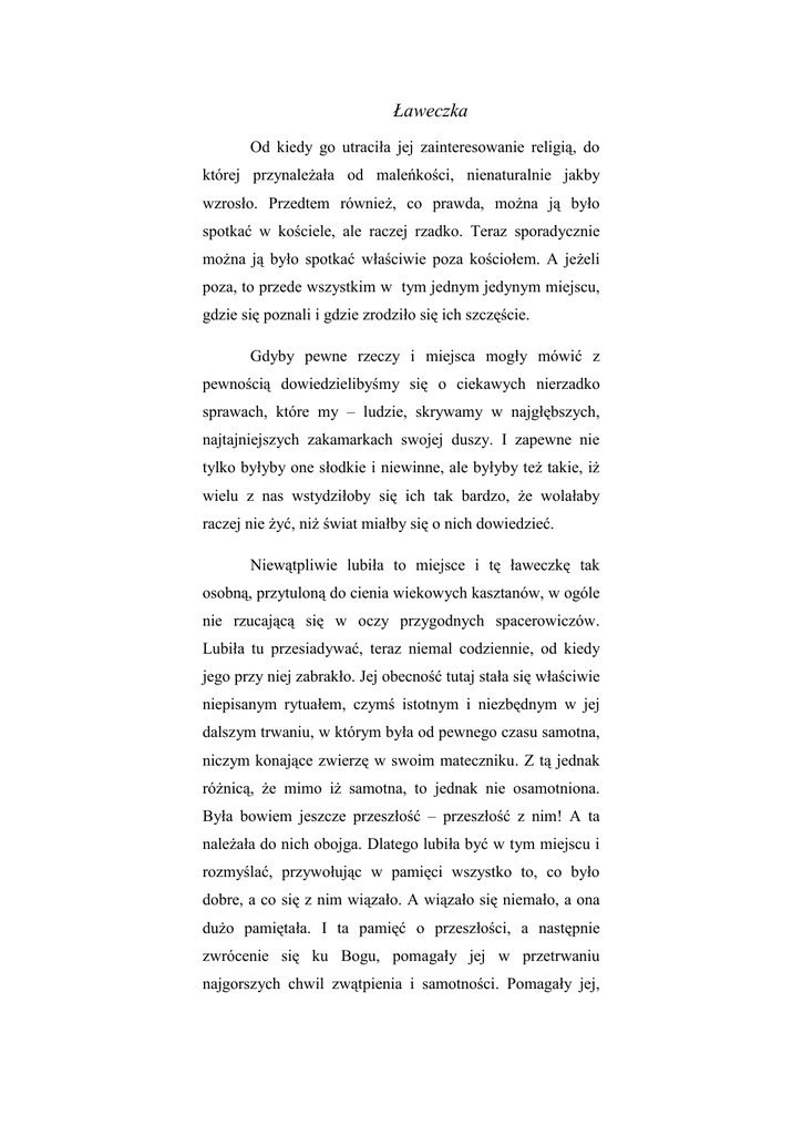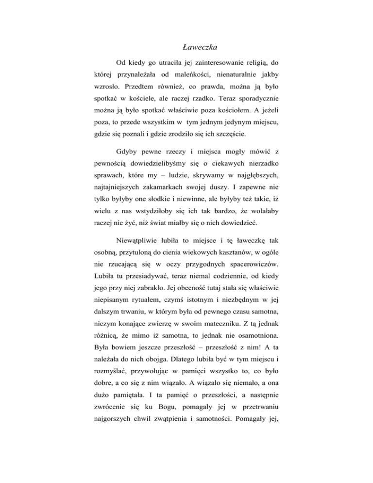 Ławeczka Od kiedy go utraciła jej zainteresowanie religią, do której przynależała od maleńkości, nienaturalnie jakby wzrosło. Przedtem również, co prawda, można ją było spotkać w kościele, ale raczej rzadko. Teraz sporadycznie można ją było spotkać właściwie poza kościołem. A jeżeli poza, to przede wszystkim w tym jednym jedynym miejscu, gdzie się poznali i gdzie zrodziło się ich szczęście. Gdyby pewne rzeczy i miejsca mogły mówić z pewnością dowiedzielibyśmy się o ciekawych nierzadko sprawach, które my – ludzie, skrywamy w najgłębszych, najtajniejszych zakamarkach swojej duszy. I zapewne nie tylko byłyby one słodkie i niewinne, ale byłyby też takie, iż wielu z nas wstydziłoby się ich tak bardzo, że wolałaby raczej nie żyć, niż świat miałby się o nich dowiedzieć. Niewątpliwie lubiła to miejsce i tę ławeczkę tak osobną, przytuloną do cienia wiekowych kasztanów, w ogóle nie rzucającą się w oczy przygodnych spacerowiczów. Lubiła tu przesiadywać, teraz niemal codziennie, od kiedy jego przy niej zabrakło. Jej obecność tutaj stała się właściwie niepisanym rytuałem, czymś istotnym i niezbędnym w jej dalszym trwaniu, w którym była od pewnego czasu samotna, niczym konające zwierzę w swoim mateczniku. Z tą jednak różnicą, że mimo iż samotna, to jednak nie osamotniona. Była bowiem jeszcze przeszłość – przeszłość z nim! A ta należała do nich obojga. Dlatego lubiła być w tym miejscu i rozmyślać, przywołując w pamięci wszystko to, co było dobre, a co się z nim wiązało. A wiązało się niemało, a ona dużo pamiętała. I ta pamięć o przeszłości, a następnie zwrócenie się ku Bogu, pomagały jej w przetrwaniu najgorszych chwil zwątpienia i samotności. Pomagały jej, jak uważała, w bezsensownym trwaniu. Bo tak właśnie, po jego śmierci, postrzegała swoje życie – jako pozbawione jakiegokolwiek sensu trwanie! Wkrótce jednak dotarło do niej, że tak naprawdę to zbliżenie do Boga przybliżyło ją w pewien sposób do niego! To duchowe zbliżenie ze Stwórcą zmniejszyło tę przepaść, która wytworzyła się pomiędzy nimi w dniu jego śmierci. Tak właśnie czuła i głęboko w to wierzyła. Pragnęła wierzyć! Bo wiara u nikogo nie jest tak silna, tak zdeterminowana, jak u tych, którzy kogoś tracą i nagle stają przed cienką linią życia i śmierci. Ale wtedy tego się nie rozumie, nie pojmuje zarówno tego, jak i wielu innych spraw, bo i nie to jest wtedy ważne. Istotne jest owo zbliżenie z Bogiem, które ostatecznie nie tkwi w naszej mądrości, lecz w naszej potrzebie nadziei. I w starości. W wieku, który uczy nas obojętności na życie, a także uzmysławia nam, czym jest czas i że on też kiedyś się kończy. Dla nas. Tutaj. Mimo że przecież tak naprawdę trwa nadal. Z nią było podobnie. Zrozumiała i doświadczyła tego również poprzez swój wiek i czas, który jej tę całą swoją tajemnicę uzmysłowił. Odkrył przed nią, że ta ławka stała się jej granicą, końcem życiowej drogi. I mimo że kiedyś była tylko zwykłą, jedną z wielu niezliczonych ławek, na której stała się pewnego dnia dojrzałą kobietą, to teraz ta sama ławka stała się również – wbrew jej pragnieniom – naturalnym symbolem śmierci. 2