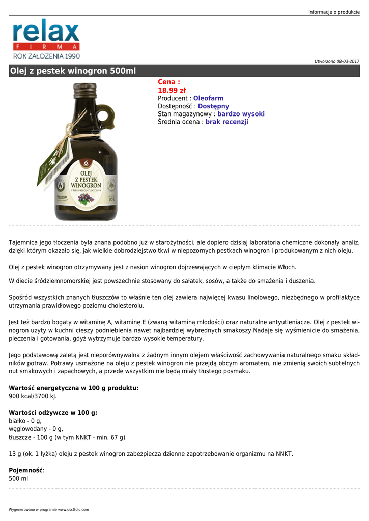 Informacje o produkcie Utworzono 08-03-2017 Olej z pestek winogron 500ml Cena : 18.99 zł Producent : Oleofarm Dostępność : Dostępny Stan magazynowy : bardzo wysoki Średnia ocena : brak recenzji Tajemnica jego tłoczenia była znana podobno już w starożytności, ale dopiero dzisiaj laboratoria chemiczne dokonały analiz, dzięki którym okazało się, jak wielkie dobrodziejstwo tkwi w niepozornych pestkach winogron i produkowanym z nich oleju. Olej z pestek winogron otrzymywany jest z nasion winogron dojrzewających w ciepłym klimacie Włoch. W diecie śródziemnomorskiej jest powszechnie stosowany do sałatek, sosów, a także do smażenia i duszenia. Spośród wszystkich znanych tłuszczów to właśnie ten olej zawiera najwięcej kwasu linolowego, niezbędnego w profilaktyce utrzymania prawidłowego poziomu cholesterolu. Jest też bardzo bogaty w witaminę A, witaminę E (zwaną witaminą młodości) oraz naturalne antyutleniacze. Olej z pestek winogron użyty w kuchni cieszy podniebienia nawet najbardziej wybrednych smakoszy.Nadaje się wyśmienicie do smażenia, pieczenia i gotowania, gdyż wytrzymuje bardzo wysokie temperatury. Jego podstawową zaletą jest nieporównywalna z żadnym innym olejem właściwość zachowywania naturalnego smaku składników potraw. Potrawy usmażone na oleju z pestek winogron nie przejdą obcym aromatem, nie zmienią swoich subtelnych nut smakowych i zapachowych, a przede wszystkim nie będą miały tłustego posmaku. Wartość energetyczna w 100 g produktu: 900 kcal/3700 kJ. Wartości odżywcze w 100 g: białko - 0 g, węglowodany - 0 g, tłuszcze - 100 g (w tym NNKT - min. 67 g) 13 g (ok. 1 łyżka) oleju z pestek winogron zabezpiecza dzienne zapotrzebowanie organizmu na NNKT. Pojemność: 500 ml Wygenerowano w programie www.oscGold.com