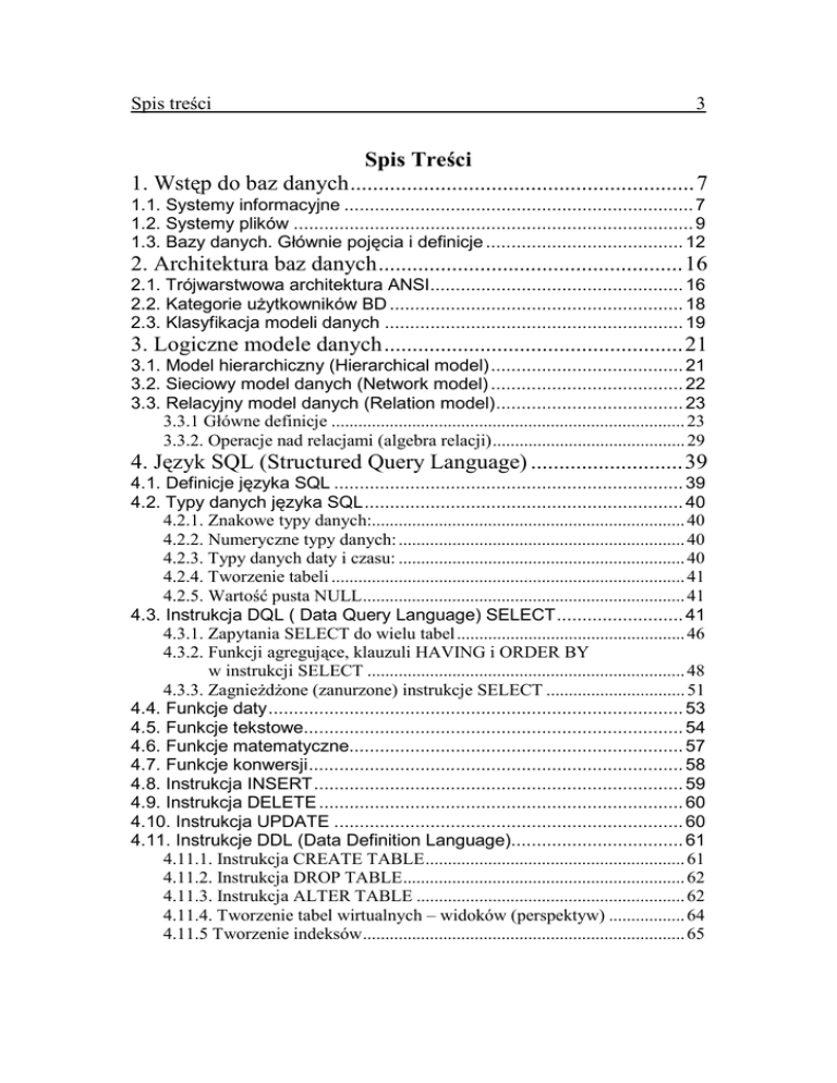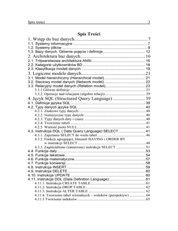 Spis treści 3 Spis Treści 1. Wstęp do baz danych ............................................................. 7 1.1. Systemy informacyjne ..................................................................... 7 1.2. Systemy plików ............................................................................... 9 1.3. Bazy danych. Głównie pojęcia i definicje ....................................... 12 2. Architektura baz danych ...................................................... 16 2.1. Trójwarstwowa architektura ANSI.................................................. 16 2.2. Kategorie użytkowników BD .......................................................... 18 2.3. Klasyfikacja modeli danych ........................................................... 19 3. Logiczne modele danych ..................................................... 21 3.1. Model hierarchiczny (Hierarchical model) ...................................... 21 3.2. Sieciowy model danych (Network model) ...................................... 22 3.3. Relacyjny model danych (Relation model) ..................................... 23 3.3.1 Główne definicje ............................................................................... 23 3.3.2. Operacje nad relacjami (algebra relacji) ........................................... 29 4. Język SQL (Structured Query Language) ........................... 39 4.1. Definicje języka SQL ..................................................................... 39 4.2. Typy danych języka SQL ............................................................... 40 4.2.1. Znakowe typy danych:...................................................................... 40 4.2.2. Numeryczne typy danych: ................................................................ 40 4.2.3. Typy danych daty i czasu: ................................................................ 40 4.2.4. Tworzenie tabeli ............................................................................... 41 4.2.5. Wartość pusta NULL ........................................................................ 41 4.3. Instrukcja DQL ( Data Query Language) SELECT ......................... 41 4.3.1. Zapytania SELECT do wielu tabel ................................................... 46 4.3.2. Funkcji agregujące, klauzuli HAVING i ORDER BY w instrukcji SELECT ....................................................................... 48 4.3.3. Zagnieżdżone (zanurzone) instrukcje SELECT ............................... 51 4.4. Funkcje daty .................................................................................. 53 4.5. Funkcje tekstowe........................................................................... 54 4.6. Funkcje matematyczne.................................................................. 57 4.7. Funkcje konwersji .......................................................................... 58 4.8. Instrukcja INSERT ......................................................................... 59 4.9. Instrukcja DELETE ........................................................................ 60 4.10. Instrukcja UPDATE ..................................................................... 60 4.11. Instrukcje DDL (Data Definition Language).................................. 61 4.11.1. Instrukcja CREATE TABLE .......................................................... 61 4.11.2. Instrukcja DROP TABLE ............................................................... 62 4.11.3. Instrukcja ALTER TABLE ............................................................ 62 4.11.4. Tworzenie tabel wirtualnych – widoków (perspektyw) ................. 64 4.11.5 Tworzenie indeksów ........................................................................ 65 4 Spis treści 4.12. Procedury przechowywane (Stored Procedure) oraz funkcje ......................................................................................... 67 4.13. Instrukcji sterowania dostępu do danych ..................................... 70 4.13.1. Instrukcja GRANT ......................................................................... 71 4.13.2. Instrukcja REVOKE ....................................................................... 71 4.14. Wykorzystywanie transakcji w SQL ............................................. 72 4.14.1. Automatyczne zatwierdzanie transakcji ......................................... 74 4.14.2. Instrukcja BEGIN ........................................................................... 74 4.14.3. Instrukcja COMMIT ....................................................................... 74 4.14.4. Instrukcja ROLLBACK.................................................................. 74 4.14.5. Instrukcje SAVEPOINT, ROLLBACK TO SAVEPOINT ............ 75 4.15. Zanurzony SQL (Embedded SQL) ............................................... 77 5. Projektowanie baz danych ................................................... 81 5.1. Cykl życiowy bazy danych (Life cycle of the database) ................. 81 5.2. Normalizacja relacji ....................................................................... 84 5.2.1. Pierwsza forma normalna (1NF) ...................................................... 84 5.2.2. Druga forma normalna (2NF) ........................................................... 88 5.2.3. Trzecia forma normalna (3NF) ......................................................... 90 5.3. Projektowanie modelu konceptualnego ......................................... 93 5.4. Przekształcenie ER – modelu (modelu infologicznego) do modelu relacyjnego (modelu fizycznego) ................................ 98 5.5. Przykład projektowania bazy danych ........................................... 101 5.5.1. Etap planowania projektu bazy danych .......................................... 101 5.5.2. Etap projektowania bazy danych ................................................... 103 5.6. Utrzymanie integralności bazy danych ........................................ 105 