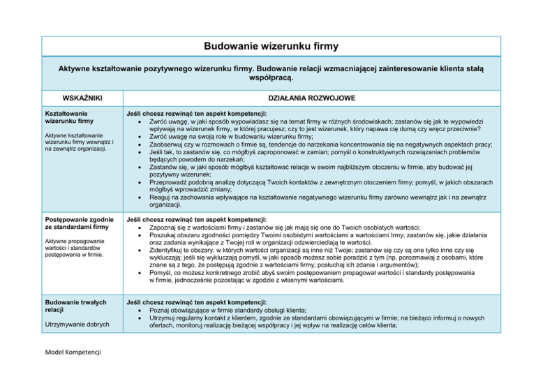 Budowanie wizerunku firmy Aktywne kształtowanie pozytywnego wizerunku firmy. Budowanie relacji wzmacniającej zainteresowanie klienta stałą współpracą. WSKAŹNIKI Kształtowanie wizerunku firmy Aktywne kształtowanie wizerunku firmy wewnątrz i na zewnątrz organizacji. Postępowanie zgodnie ze standardami firmy Aktywne propagowanie wartości i standardów postępowania w firmie. Budowanie trwałych relacji Utrzymywanie dobrych Model Kompetencji DZIAŁANIA ROZWOJOWE Jeśli chcesz rozwinąć ten aspekt kompetencji: Zwróć uwagę, w jaki sposób wypowiadasz się na temat firmy w różnych środowiskach; zastanów się jak te wypowiedzi wpływają na wizerunek firmy, w której pracujesz; czy to jest wizerunek, który napawa cię dumą czy wręcz przeciwnie? Zwróć uwagę na swoją role w budowaniu wizerunku firmy; Zaobserwuj czy w rozmowach o firmie są, tendencje do narzekania koncentrowania się na negatywnych aspektach pracy; Jeśli tak, to zastanów się, co mógłbyś zaproponować w zamian; pomyśl o konstruktywnych rozwiązaniach problemów będących powodem do narzekań; Zastanów się, w jaki sposób mógłbyś kształtować relacje w swoim najbliższym otoczeniu w firmie, aby budować jej pozytywny wizerunek; Przeprowadź podobną analizę dotyczącą Twoich kontaktów z zewnętrznym otoczeniem firmy; pomyśl, w jakich obszarach mógłbyś wprowadzić zmiany; Reaguj na zachowania wpływające na kształtowanie negatywnego wizerunku firmy zarówno wewnątrz jak i na zewnątrz organizacji. Jeśli chcesz rozwinąć ten aspekt kompetencji: Zapoznaj się z wartościami firmy i zastanów się jak mają się one do Twoich osobistych wartości; Poszukaj obszaru zgodności pomiędzy Twoimi osobistymi wartościami a wartościami Irmy; zastanów się, jakie działania oraz zadania wynikające z Twojej roli w organizacji odzwierciedlają te wartości. Zidentyfikuj te obszary, w których wartości organizacji są inne niż Twoje; zastanów się czy są one tylko inne czy się wykluczają; jeśli się wykluczają pomyśl, w jaki sposób możesz sobie poradzić z tym (np. porozmawiaj z osobami, które znane są z tego, że postępują zgodnie z wartościami firmy; posłuchaj ich zdania i argumentów); Pomyśl, co możesz konkretnego zrobić abyś swoim postępowaniem propagował wartości i standardy postępowania w firmie, jednocześnie pozostając w zgodzie z własnymi wartościami. Jeśli chcesz rozwinąć ten aspekt kompetencji: Poznaj obowiązujące w firmie standardy obsługi klienta; Utrzymuj regularny kontakt z klientem, zgodnie ze standardami obowiązującymi w firmie; na bieżąco informuj o nowych ofertach, monitoruj realizację bieżącej współpracy i jej wpływ na realizację celów klienta; relacji z klientem zgodnie z obowiązującymi standardami, nawet w trudnych sytuacjach. Kreowanie sytuacji, które są powodem do budowania kontaktu. Budowanie profesjonalnego wizerunku Dbanie o własny profesjonalny wizerunek w oczach klientów (wygląd, merytoryczne przygotowanie), bycie w tym zakresie dla wielu osób wzorem. Bądź przygotowany/a zarówno na złe jak i na dobre informacje zwrotne. Nie reaguj obronnie, wysłuchaj tego, co mają do powiedzenia - ich sugestie pomogą Ci dostrzec problemy, na które do tej pory nie zwracałeś/-aś uwagi oraz wyznaczyć nowe sposoby działania; Wychodź z inicjatywą, stwarzaj sytuacje budujące kontakt z klientem; pamiętaj o świętach i innych okazjach klienta – złóż życzenia, wyślij kartkę/e-mail, spotkaj się z klientem na kawę nie koniecznie w celu przedstawienia oferty biznesowej; Bierz udział w tworzeniu rozwiązań systemowych sprzyjających utrzymywaniu długofalowego kontaktu z klientem. Jeśli chcesz rozwinąć ten aspekt kompetencji: Poprzez odpowiedni wygląd i przygotowanie merytoryczne, dbaj o to, aby klienci postrzegali Cię, jako profesjonalistę w swojej dziedzinie; Dawaj przykład innym i promuj w firmie profesjonalny wygląd i odpowiednie przygotowanie merytoryczne; Utrzymuj bieżący kontakt ze stałymi klientami, buduj z mini długoterminowe relacje; pamiętaj, że strata klienta jest bardzo dużym obciążeniem – niezadowolony przekazuje negatywne informacje o firmie swoim znajomym i w rezultacie osób zrażonych do Twojej organizacji może być znacznie więcej; Staraj się pielęgnować relacje z dawnymi klientami, a nowych traktuj z dużą kurtuazją i dbaj o nich – przywiązanie klienta do firmy to proces czasochłonny i wymagający dużych nakładów energii; Bądź inicjatorem tworzenia standardów i procesów promujących i wdrażających zasady budowania profesjonalnego wizerunku. REKOMENDOWANE SZKOLENIA: Szkolenie wprowadzające (dla nowo zatrudnionych pracowników) Integracyjne szkolenia firmowe Szkolenia typu „outdoor” Budowanie zespołu REKOMENDOWANA LITERATURA: Elżbieta Binder, Bartłomiej Binder, „Reprezentuje firmę”, Petit 2002. Józef Machaczka, „Zarządzanie rozwojem organizacji”, Polskie Wydawnictwo Naukowe, Warszawa 1998. Łukasz Sułkowski, „Kulturowa zmienność organizacji”, Polskie Wydawnictwo Ekonomiczne, Warszawa 2002. Andrzej K. Koźmiński i Włodzimierz Piotrowski, „Zarządzanie. Teoria i praktyka”, Polskie Wydawnictwo Naukowe, Warszawa 2000 Model Kompetencji