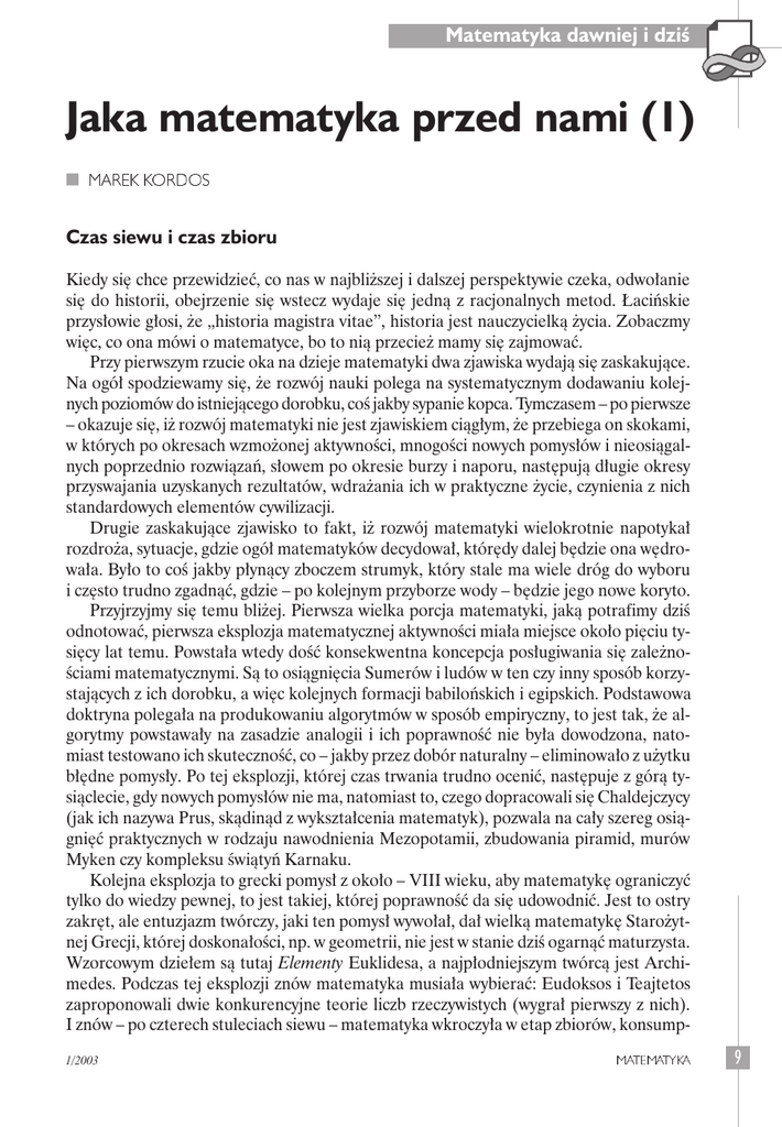 Matematyka dawniej i dziś Jaka matematyka przed nami (1) n MAREK KORDOS Czas siewu i czas zbioru Kiedy się chce przewidzieć, co nas w najbliższej i dalszej perspektywie czeka, odwołanie się do historii, obejrzenie się wstecz wydaje się jedną z racjonalnych metod. Łacińskie przysłowie głosi, że „historia magistra vitae”, historia jest nauczycielką życia. Zobaczmy więc, co ona mówi o matematyce, bo to nią przecież mamy się zajmować. Przy pierwszym rzucie oka na dzieje matematyki dwa zjawiska wydają się zaskakujące. Na ogół spodziewamy się, że rozwój nauki polega na systematycznym dodawaniu kolejnych poziomów do istniejącego dorobku, coś jakby sypanie kopca. Tymczasem – po pierwsze – okazuje się, iż rozwój matematyki nie jest zjawiskiem ciągłym, że przebiega on skokami, w których po okresach wzmożonej aktywności, mnogości nowych pomysłów i nieosiągalnych poprzednio rozwiązań, słowem po okresie burzy i naporu, następują długie okresy przyswajania uzyskanych rezultatów, wdrażania ich w praktyczne życie, czynienia z nich standardowych elementów cywilizacji. Drugie zaskakujące zjawisko to fakt, iż rozwój matematyki wielokrotnie napotykał rozdroża, sytuacje, gdzie ogół matematyków decydował, którędy dalej będzie ona wędrowała. Było to coś jakby płynący zboczem strumyk, który stale ma wiele dróg do wyboru i często trudno zgadnąć, gdzie – po kolejnym przyborze wody – będzie jego nowe koryto. Przyjrzyjmy się temu bliżej. Pierwsza wielka porcja matematyki, jaką potrafimy dziś odnotować, pierwsza eksplozja matematycznej aktywności miała miejsce około pięciu tysięcy lat temu. Powstała wtedy dość konsekwentna koncepcja posługiwania się zależnościami matematycznymi. Są to osiągnięcia Sumerów i ludów w ten czy inny sposób korzystających z ich dorobku, a więc kolejnych formacji babilońskich i egipskich. Podstawowa doktryna polegała na produkowaniu algorytmów w sposób empiryczny, to jest tak, że algorytmy powstawały na zasadzie analogii i ich poprawność nie była dowodzona, natomiast testowano ich skuteczność, co – jakby przez dobór naturalny – eliminowało z użytku błędne pomysły. Po tej eksplozji, której czas trwania trudno ocenić, następuje z górą tysiąclecie, gdy nowych pomysłów nie ma, natomiast to, czego dopracowali się Chaldejczycy (jak ich nazywa Prus, skądinąd z wykształcenia matematyk), pozwala na cały szereg osiągnięć praktycznych w rodzaju nawodnienia Mezopotamii, zbudowania piramid, murów Myken czy kompleksu świątyń Karnaku. Kolejna eksplozja to grecki pomysł z około – VIII wieku, aby matematykę ograniczyć tylko do wiedzy pewnej, to jest takiej, której poprawność da się udowodnić. Jest to ostry zakręt, ale entuzjazm twórczy, jaki ten pomysł wywołał, dał wielką matematykę Starożytnej Grecji, której doskonałości, np. w geometrii, nie jest w stanie dziś ogarnąć maturzysta. Wzorcowym dziełem są tutaj Elementy Euklidesa, a najpłodniejszym twórcą jest Archimedes. Podczas tej eksplozji znów matematyka musiała wybierać: Eudoksos i Teajtetos zaproponowali dwie konkurencyjne teorie liczb rzeczywistych (wygrał pierwszy z nich). I znów – po czterech stuleciach siewu – matematyka wkroczyła w etap zbiorów, konsump1/2003 MATEMATYKA 9 Matematyka dawniej i dziś cji. Najdonioślejszym przykładem jest tutaj ptolemejski system nieba. A przykładem na eklektyzm powstającej wówczas matematyki jest – znany zapewne Państwu – wzór Herona: bardzo zawiły i kompletnie nieprzydatny. Na następną eksplozję nowej matematyki trzeba było czekać znów tysiąc lat. Tym razem nowe do matematyki wnieśli Arabowie – stworzona przez nich nowa (dziś najsilniejsza) gałąź matematyki to algebra: sztuka redukcji. Ten okres tworzenia nowego to blisko cztery stulecia. I znów następuje okres spożycia, wdrożenia uzyskanych rezultatów. Tym razem interludium jest krótsze: w XVI wieku ponownie pojawiają się Europejczycy. Od uzyskania sukcesu w postaci rozwiązania równań stopnia 3 i 4 zaczyna się kolejny burzliwy okres rozwoju matematyki. Tym razem kluczowym pomysłem jest naśladowanie przez matematykę fizyki, a głównie mechaniki. Daje to najobszerniejszą dziś, zwłaszcza w nauczaniu akademickim, dyscyplinę – analizę matematyczną. Kolejne trzy stulecia to wykorzystanie wszelkich możliwości, jakie ten pomysł nasunął (a jest ich wiele). Matematyka tak nabrała pewności siebie, że postanowiła zacząć badać metodami matematycznymi samą siebie. Tu znów pojawiły się rozmaite koncepcje rozumienia matematyki i znów trzeba było wybierać. Wszystko to każe zobaczyć w pytaniu o matematykę przed nami nieoczywistość. To, co będzie, może być bardzo rozmaite, a poziom zmatematyzowania naszego życia każe poważnie zastanawiać się nad odpowiedzią i jej praktycznymi konsekwencjami. Matematyka postrachunkowa Dokonany w roku 1947 (względnie w 1949) wynalazek tranzystora nie pozwolił wprawdzie zbudować maszyny Turinga, ale dał możność zrealizowania i wdrożenia pomysłów na zdjęcie z ludzkości kłopotów z liczeniem i przetwarzaniem danych we wszystkich powszechnie uprawianych typach działalności praktycznej. W ten sposób stało się faktem, że obecnie statystycznie nikt nie oczekuje od matematyków, iż będą dostarczali nowych sposobów rachowania – problemy z brakiem dostatecznie szybkich algorytmów, po pierwsze dotyczą bardzo wyspecjalizowanych zagadnień i społeczne zapotrzebowanie na nie jest zerowe, po drugie nie sposób dziś poważnie obstawać przy tym, że zajmujący się poszukiwaniem coraz doskonalszych algorytmów uczeni to matematycy. Powstał nowy, odrębny zawód informatyka czy, jak kto woli, specjalisty od computer science. Same rachunki zaś stały się szczególnym przypadkiem szerszej (a nowej) dyscypliny – przetwarzania danych. Matematyka uwolniona od rac