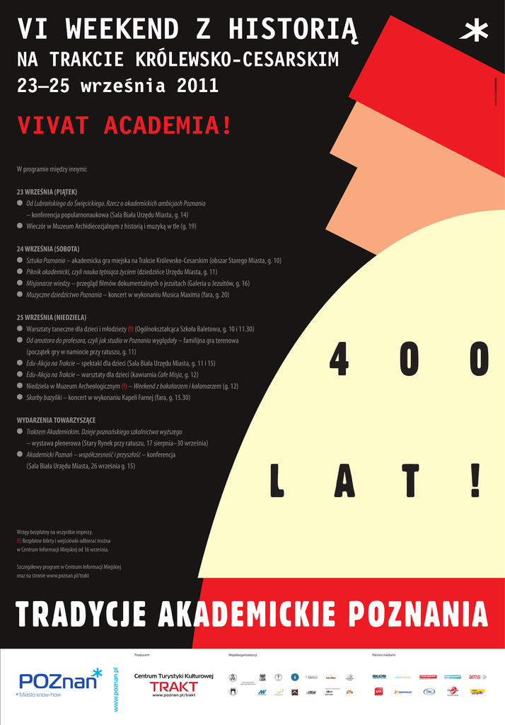 VI WEEKEND Z HISTORIĄ NA TRAKCIE KRÓLEWSKO-CESARSKIM 23–25 września 2011 VIVAT ACADEMIA! W programie między innymi: 23 WRZEŚNIA (PIĄTEK) Od Lubrańskiego do Święcickiego. Rzecz o akademickich ambicjach Poznania – konferencja popularnonaukowa (Sala Biała Urzędu Miasta, g. 14) Wieczór w Muzeum Archidiecezjalnym z historią i muzyką w tle (g. 19) 24 WRZEŚNIA (SOBOTA) Sztuka Poznania – akademicka gra miejska na Trakcie Królewsko-Cesarskim (obszar Starego Miasta, g. 10) Piknik akademicki, czyli nauka tętniąca życiem (dziedzińce Urzędu Miasta, g. 11) Misjonarze wiedzy – przegląd filmów dokumentalnych o jezuitach (Galeria u Jezuitów, g. 16) Muzyczne dziedzictwo Poznania – koncert w wykonaniu Musica Maxima (fara, g. 20) 25 WRZEŚNIA (NIEDZIELA) Warsztaty taneczne dla dzieci i młodzieży (!) (Ogólnokształcąca Szkoła Baletowa, g. 10 i 11.30) Od amatora do profesora, czyli jak studia w Poznaniu wyglądały – familijna gra terenowa (początek gry w namiocie przy ratuszu, g. 11) Edu-Akcja na Trakcie – spektakl dla dzieci (Sala Biała Urzędu Miasta, g. 11 i 15) Edu-Akcja na Trakcie – warsztaty dla dzieci (kawiarnia Cafe Misja, g. 12) Niedziela w Muzeum Archeologicznym (!) – Weekend z bakałarzem i kałamarzem (g. 12) Skarby bazyliki – koncert w wykonaniu Kapeli Farnej (fara, g. 15.30) WYDARZENIA TOWARZYSZĄCE Traktem Akademickim. Dzieje poznańskiego szkolnictwa wyższego – wystawa plenerowa (Stary Rynek przy ratuszu, 17 sierpnia–30 września) Akademicki Poznań – współczesność i przyszłość – konferencja (Sala Biała Urzędu Miasta, 26 września g. 15) Wstęp bezpłatny na wszystkie imprezy. (!) Bezpłatne bilety i wejściówki odbierać można w Centrum Informacji Miejskiej od 16 września. Szczegółowy program w Centrum Informacji Miejskiej oraz na stronie www.poznan.pl/trakt FARA POZNAŃSKA BAZYLIKA KOLEGIACKA