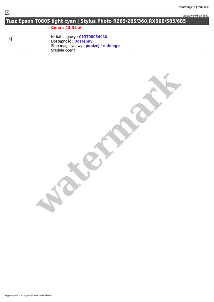 Informacje o produkcie Utworzono 08-03-2017 Tusz Epson T0805 light cyan | Stylus Photo R265/285/360,RX560/585/685 Cena : 43,35 zł w at er m ar k Nr katalogowy : C13T08054010 Dostępność : Dostępny Stan magazynowy : poniżej średniego Średnia ocena : Wygenerowano w programie www.oscGold.com