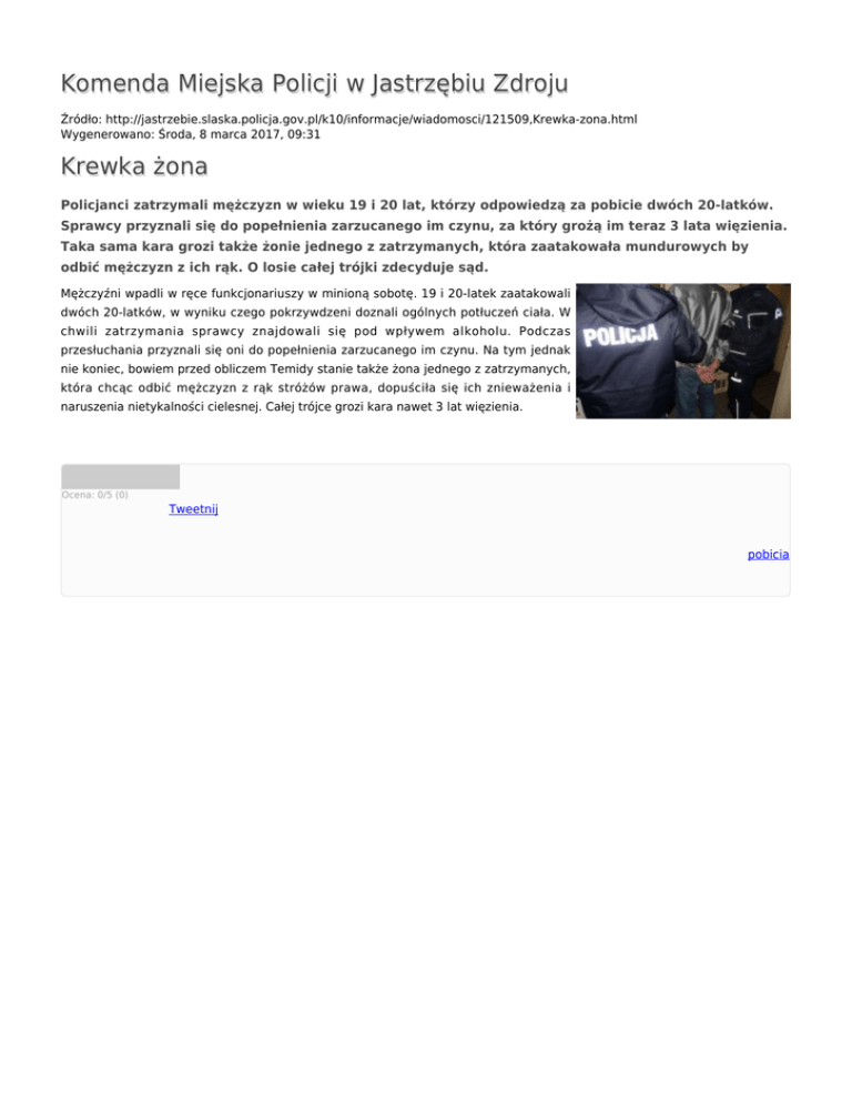 Komenda Miejska Policji w Jastrzębiu Zdroju Źródło: http://jastrzebie.slaska.policja.gov.pl/k10/informacje/wiadomosci/121509,Krewka-zona.html Wygenerowano: Środa, 8 marca 2017, 09:31 Krewka żona Policjanci zatrzymali mężczyzn w wieku 19 i 20 lat, którzy odpowiedzą za pobicie dwóch 20-latków. Sprawcy przyznali się do popełnienia zarzucanego im czynu, za który grożą im teraz 3 lata więzienia. Taka sama kara grozi także żonie jednego z zatrzymanych, która zaatakowała mundurowych by odbić mężczyzn z ich rąk. O losie całej trójki zdecyduje sąd. Mężczyźni wpadli w ręce funkcjonariuszy w minioną sobotę. 19 i 20-latek zaatakowali dwóch 20-latków, w wyniku czego pokrzywdzeni doznali ogólnych potłuczeń ciała. W chwili zatrzymania sprawcy znajdowali się pod wpływem alkoholu. Podczas przesłuchania przyznali się oni do popełnienia zarzucanego im czynu. Na tym jednak nie koniec, bowiem przed obliczem Temidy stanie także żona jednego z zatrzymanych, która chcąc odbić mężczyzn z rąk stróżów prawa, dopuściła się ich znieważenia i naruszenia nietykalności cielesnej. Całej trójce grozi kara nawet 3 lat więzienia. Ocena: 0/5 (0) Tweetnij pobicia