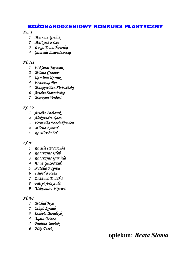 BOŻONARODZENIOWY KONKURS PLASTYCZNY KL. I 1. 2. 3. 4. Mateusz Grelak Martyna Krzos Kinga Kwiatkowska Gabriela Zawadzińska Kl. III 1. Wiktoria Jagucak 2. Milena Grabias 3. Karolina Kornik 4. Weronika Rój 5. Maksymilian Słotwiński 6. Amelia Słotwińska 7. Martyna Wróbel Kl. IV 1. Amelia Padiasek 2. Aleksandra Gaca 3. Weronika Maciukiewicz 4. Milena Kowal 5. Kamil Wróbel Kl. V 1. 2. 3. 4. 5. 6. 7. 8. 9. Kamila Czerwonka Katarzyna Głąb Katarzyna Gumiela Anna Guzorczuk Natalia Kaproń Paweł Koman Zuzanna Kuszka Patryk Przytuła Aleksandra Wyrwa Kl. VI 1. Michał Hyz 2. Jakub Łysiak 3. Izabela Mendryk 4. Agata Ostasz 5. Paulina Smolak 6. Filip Turek opiekun: Beata Słoma KONKURS HISTORYCZNY Z OKAZJI 70 ROCZNICY ROZBICIA POSTERUNKU ŻANDARMERII W ŁUKOWEJ kl. V: 1. 2. 3. 4. Kolska Wiktoria Koman Paweł Wierzbowski Łukasz Wyrwa Aleksandra kl. VI: 1. 2. Gumiela Miłosz Ostasz Paweł Miłosz Gumiela – II miejsce Łukasz Wierzbowski – II miejsce Paweł Koman - III miejsce opiekun: Beata Słoma KONKURS HISTORYCZNY ORGANIZOWANY PRZEZ KO W LUBLINIE ETAP SZKOLNY: kl. VI: 1. 2. 3. 4. Gumiela Miłosz Gumiela Szymon Ostasz Paweł Wierzbowski Miłosz opiekun: Beata Słoma KONKURS MATEMATYCZNY OLIMPIADA WIEDZY ARCHIMEDES.PLUS XX edycja KL. III 1. Agnieszka Rorata 2. Izabela Turek 3. Kacper Kościk laureat V stopnia 4. Martyna Wróbel laureat III stopnia 5. Jakub Kuszka 6. Patrycja Czarna laureat V stopnia 7. Dominika Grasza laureat II stopnia KL. IV 1. Adrian Kaproń 2. Kamil Wróbel 3. Szymon Niedzielski laureat III stopnia KL. V 1. Wiktoria Kolska 2. Paweł Koman laureat V stopnia 3. Aleksandra Wyrwa 4. Katarzyna Gumiela KL. VI 1. Filip Turek laureat III stopnia 2. Kamil Koszarny laureat I stopnia 3. Paweł Ostasz 4. Jakub Łysiak laureat I stopnia 5. Miłosz Gumiela 6. Jakub Słoma laureat V stopnia 7. Tomasz Gajur opiekun: Mariola Małyszek KONKURS MATEMATYCZNY ORGANIZOWANY PRZEZ KO W LUBLINIE ETAP SZKOLNY: kl. VI: 1. 2. Koszarny Kamil Łysiak Jakub opiekun: Mariola Małyszek KONKURS MATEMATYCZNY „SZPAK” Organizowany przez LSCDN w Zamościu pod patronatem: Wydziału Matematyki, Fizyki i Informatyki UMCS w Lublinie, Wydziału Edukacji i Sportu UM w Zamościu i Państwowej Wyższej Szkoły Zawodowej w Zamościu. ETAP SZKOLNY: KL. IV 1. Kaproń Adrian 2. Maciukiewicz Weronika 3. Niedzielski Szymon 4. Wróbel Kamil KL. V Kolska Wiktoria Koman Paweł Przytuła Patryk Wierzbowski Łukasz 5. Wyrwa Aleksandra 1. 2. 3. 4. KL. VI 1. Gajur Tomasz 2. Gumiela Miłosz 3. Koszarny Kamil 4. Łysiak Jakub 5. Ostasz Paweł 6. Słoma Jakub 7. Turek Filip ETAP POWIATOWY: Słoma Jakub opiekun: Mariola Małyszek KONKURS PLASTYCZNY „Bezpieczni na drodze” ORGANIZOWANY PRZEZ WOJEWÓDZKI OŚRODEK RUCHU DROGOWEGO W ZAMOŚCIU Oliwia Tadra – I miejsce Amelia Słotwińska – I miejsce Gabriela Zawadzińska – II miejsce opiekunowie: Jolanta Zwolińska Marzena Bździuch KONKURS Z JĘZYKA ANGIELSKIEGO ORGANIZOWANY PRZEZ KO W LUBLINIE ETAP SZKOLNY: kl. V: 1. 2. 3. Paweł Koman Aleksandra Wyrwa Łukasz Wierzbowski kl. VI: 1. 2. Kamil Koszarny Filip Turek opiekun: Joanna Wiertel