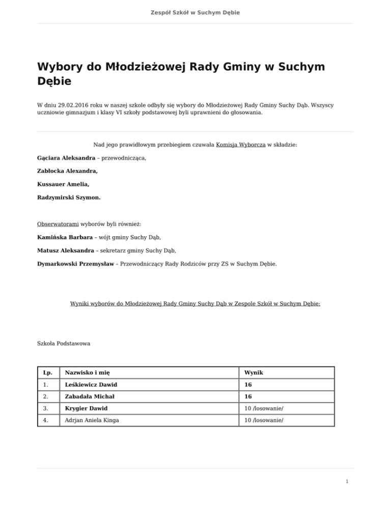 Zespół Szkół w Suchym Dębie Wybory do Młodzieżowej Rady Gminy w Suchym Dębie W dniu 29.02.2016 roku w naszej szkole odbyły się wybory do Młodzieżowej Rady Gminy Suchy Dąb. Wszyscy uczniowie gimnazjum i klasy VI szkoły podstawowej byli uprawnieni do głosowania. Nad jego prawidłowym przebiegiem czuwała Komisja Wyborcza w składzie: Gąciara Aleksandra – przewodnicząca, Zabłocka Alexandra, Kussauer Amelia, Radzymirski Szymon. Obserwatorami wyborów byli również: Kamińska Barbara – wójt gminy Suchy Dąb, Matusz Aleksandra – sekretarz gminy Suchy Dąb, Dymarkowski Przemysław – Przewodniczący Rady Rodziców przy ZS w Suchym Dębie. Wyniki wyborów do Młodzieżowej Rady Gminy Suchy Dąb w Zespole Szkół w Suchym Dębie: Szkoła Podstawowa Lp. Nazwisko i mię Wynik 1. Leśkiewicz Dawid 16 2. Zabadała Michał 16 3. Krygier Dawid 10 /losowanie/ 4. Adrjan Aniela Kinga 10 /losowanie/ 1 Zespół Szkół w Suchym Dębie Gimnazjum Lp. Nazwisko i mię Wynik Kasińska Weronika 59 Nazimek Marcelina 59 Dziedzic Martyna 51 Okrój Hanna 47 Rzepecka Karolina 43 Heinrich Patrycja 41 Kowalczyk Daria 39 Dubiella Tomasz 37 Pawłowicz Jan 35 Rogaczewska Wiktoria 34 Jurczyk Damian 32 Frąckowiak Maksymilian Karol 31 Lewandowska Andżelika Anna 21 Tomasz Jagielski 2