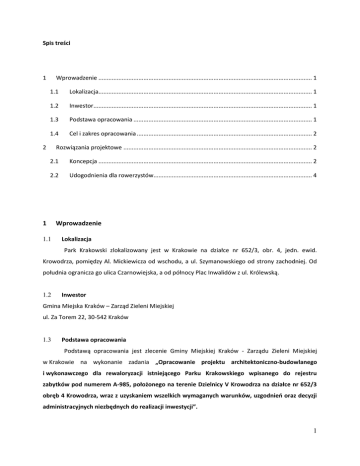 Spis treści 1 Wprowadzenie ................................................................................................................................ 1 1.1 Lokalizacja................................................................................................................................ 1 1.2 Inwestor................................................................................................................................... 1 1.3 Podstawa opracowania ........................................................................................................... 1 1.4 Cel i zakres opracowania ......................................................................................................... 2 2 Rozwiązania projektowe ................................................................................................................. 2 2.1 Koncepcja ................................................................................................................................ 2 2.2 Udogodnienia dla rowerzystów............................................................................................... 4 1 1.1 Wprowadzenie Lokalizacja Park Krakowski zlokalizowany jest w Krakowie na działce nr 652/3, obr. 4, jedn. ewid. Krowodrza, pomiędzy Al. Mickiewicza od wschodu, a ul. Szymanowskiego od strony zachodniej. Od południa ogranicza go ulica Czarnowiejska, a od północy Plac Inwalidów z ul. Królewską. 1.2 Inwestor Gmina Miejska Kraków – Zarząd Zieleni Miejskiej ul. Za Torem 22, 30-542 Kraków 1.3 Podstawa opracowania Podstawą opracowania jest zlecenie Gminy Miejskiej Kraków - Zarządu Zieleni Miejskiej w Krakowie na wykonanie zadania „Opracowanie projektu architektoniczno-budowlanego i wykonawczego dla rewaloryzacji istniejącego Parku Krakowskiego wpisanego do rejestru zabytków pod numerem A-985, położonego na terenie Dzielnicy V Krowodrza na działce nr 652/3 obręb 4 Krowodrza, wraz z uzyskaniem wszelkich wymaganych warunków, uzgodnień oraz decyzji administracyjnych niezbędnych do realizacji inwestycji”. 1 1.4 Cel i zakres opracowania Celem opracowania jest wykonanie projektu rewaloryzacji Parku Krakowskiego w Krakowie wraz z infrastrukturą techniczną na terenie obejmującym działki nr 652/3 obręb 4 jednostka ewidencyjna Krowodrza. Prace prowadzono na podstawie projektu zaopiniowanego pozytywnie przez Miejskiego Konserwatora Zabytków w 2015 roku. Obszar ten stanowi teren zieleni publicznej jako uzupełnienie istniejącej zabudowy mieszkaniowej i usługowej. Zakresem opracowania objęto rewaloryzację parku w zakresie zieleni (kompleksowo), infrastruktury towarzyszącej, w tym oświetlenie i iluminacja, ścieżek i alejek, elementów małej architektury z placami zabaw, ogrodzeniem (z uwzględnieniem wejść istniejących i projektowanych). Objęto nim cały teren o powierzchni ok. 4,95 ha. Na przedmiotowym obszarze nie planuje się obiektów kubaturowych. 2 2.1 Rozwiązania projektowe Koncepcja Niniejsze opracowanie zakłada rewaloryzację parku – modernizację infrastruktury, rewaloryzację zieleni i małej architektury wraz z oświetleniem na terenie, z wyłączeniem obiektów kubaturowych i sadzawki. Koncepcję wykonano w oparciu o Projekt budowlano – wykonawczy z 2015 roku, który uzyskał pozytywną opinię Małopolskiego Konserwatora Zabytków. Głównym założeniem projektowym było uczytelnienie kompozycji wnętrz parkowych i osi widokowych, oraz stworzenie polan poprzez etapową wycinkę drzew i krzewów. W opracowaniu przewidziano zastąpienie części istniejących trawników bylinami, szczególnie w zewnętrznych częściach parku, oraz dosadzenia drzew. Planuje się wycinkę krzewów w złym i średnim stanie, o niskiej wartości kompozycyjnej, i dosadzenie do istniejących grup krzewów nowych okazów. Szczegółowy pod względem ilościowym i gatunkowym plan nasadzeń przedstawiono w Projekcie zieleni. Projekt zakłada uporządkowanie układu komunikacyjnego alejek i przejść pod względem kompozycji, gradacji szerokości alejek i użytych materiałów dla nawierzchni (nawierzchnia asfaltowa oraz mineralne). Projektuje się wprowadzenie nawierzchni utwardzonych pod ławki, kosze, stojaki rowerowe i pitniki. Opracowanie zawiera ponadto program budowy pochylni dla osób niepełnosprawnych. Planuje się zastąpienie istniejących latarni nowoczesnym oświetleniem typu LED. Ponadto projekt zakłada zwiększenie iluminacji wzdłuż głównych alejek. 2 W opracowaniu ujęto również plac zabaw wraz z projektem pagórków z nawierzchni bezpiecznej i wyposażeniem oraz elementy małej architektury. Program funkcjonalny parku został podzielony na następujące strefy: - funkcja komunikacyjno - tranzytowa po głównej osi północ - południe wzdłuż Alei Mickiewicza, - funkcja spacerowa i rekreacyjna - alejki w zachodniej części parku od strony ul. Szymanowskiego, oraz plac zabaw dla dzieci i urządzenia rekreacyjne dla dorosłych w zachodniej części parku. Rewaloryzacja, rozbudowa i modernizacja infrastruktury będzie oparta o następujące działania: - etapową wycinkę drzew i krzewów zgodnie z Projektem inwentaryzacji i gospodarki drzewostanem oraz realizację Projektu zieleni, mającego na celu częściową wymianę nasadzeń, dosadzenie drzew, krzewów, wprowadzenie rabat bylinowych, odtworzenie istniejących żywopłotów i uczytelnienie gabinetu grabowego, - nowa organizacja wejścia do parku od strony ul. Szymanowskiego – adaptacja istniejących przedeptów, - projekt rampy - pochylni umożliwiającej osobom niepełnosprawnym wejście od strony Placu Inwalidów, - zróżnicowanie nawierzchni alejek w zależności od programu funkcjonalnego parku na nawierzchnię asfaltową w części służącej tranzytowi i mineralną typu Hanse Grand w części spacerowej i służącej rekreacji, - urządzenie placu zabaw dla dzieci o programie dostosowanym do różnych grup wiekowych oraz stworzenie strefy rekreacji dla mł