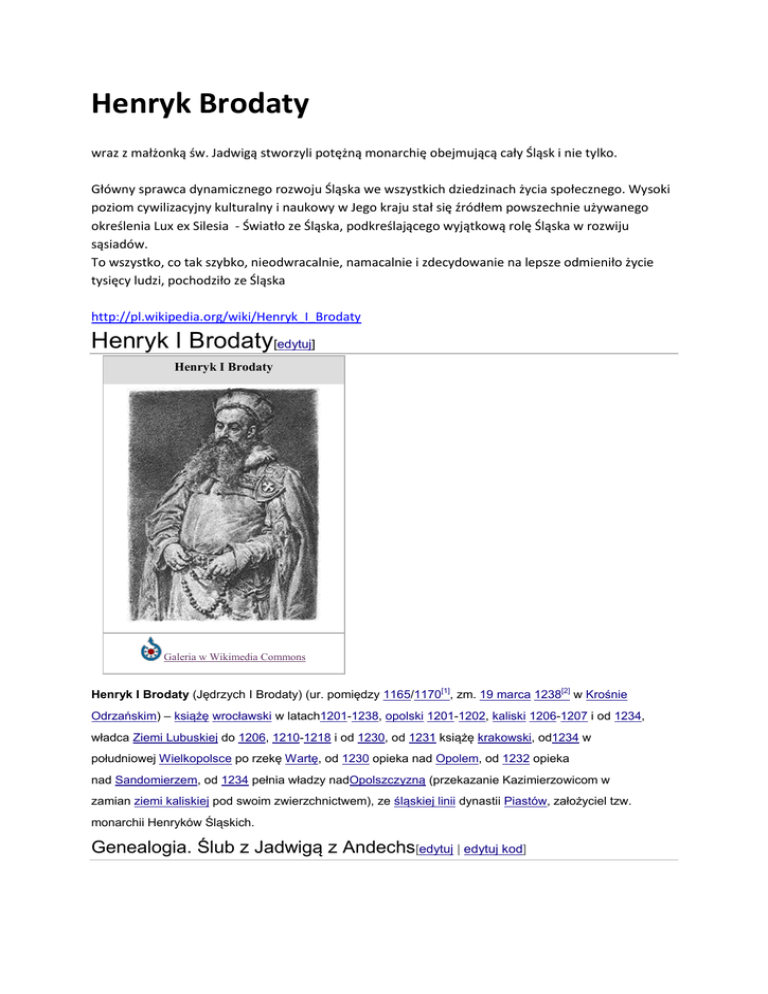 Henryk Brodaty wraz z małżonką św. Jadwigą stworzyli potężną monarchię obejmującą cały Śląsk i nie tylko. Główny sprawca dynamicznego rozwoju Śląska we wszystkich dziedzinach życia społecznego. Wysoki poziom cywilizacyjny kulturalny i naukowy w Jego kraju stał się źródłem powszechnie używanego określenia Lux ex Silesia - Światło ze Śląska, podkreślającego wyjątkową rolę Śląska w rozwiju sąsiadów. To wszystko, co tak szybko, nieodwracalnie, namacalnie i zdecydowanie na lepsze odmieniło życie tysięcy ludzi, pochodziło ze Śląska http://pl.wikipedia.org/wiki/Henryk_I_Brodaty Henryk I Brodaty[edytuj] Henryk I Brodaty Galeria w Wikimedia Commons Henryk I Brodaty (Jędrzych I Brodaty) (ur. pomiędzy 1165/1170[1], zm. 19 marca 1238[2] w Krośnie Odrzańskim) – książę wrocławski w latach1201-1238, opolski 1201-1202, kaliski 1206-1207 i od 1234, władca Ziemi Lubuskiej do 1206, 1210-1218 i od 1230, od 1231 książę krakowski, od1234 w południowej Wielkopolsce po rzekę Wartę, od 1230 opieka nad Opolem, od 1232 opieka nad Sandomierzem, od 1234 pełnia władzy nadOpolszczyzną (przekazanie Kazimierzowicom w zamian ziemi kaliskiej pod swoim zwierzchnictwem), ze śląskiej linii dynastii Piastów, założyciel tzw. monarchii Henryków Śląskich. Genealogia. Ślub z Jadwigą z Andechs[edytuj | edytuj kod] Ślub Henryka I Brodatego z Jadwigą z Andechs, według ikonografii z XIV w. Henryk I Brodaty (w ówczesnej polszczyźnie mówiono Jędrzych, a nie Henryk)[3] był czwartym pod względem starszeństwa synem Bolesława I Wysokiego i Krystyny, jego drugiej małżonki, pochodzącej zapewne z Niemiec[4]. W chwili urodzenia najprawdopodobniej nie był przewidywanym dziedzicem schedy po ojcu (zgodnie z ówczesną praktyką zostałby przeznaczony do stanu duchownego), jednak wobec przedwczesnej śmierci starszych braci (Bolesława, Konrada i Jana) i kariery kościelnej przyrodniego brata Jarosława, już około 1190 r. stał się jedynym spadkobiercą[5]. Wtedy to Bolesław zaczął wprowadzać syna w arkana wielkiej polityki. Ożenił go z Jadwigą (późniejszą świętą), córką księcia Meranu, Bertolda VI, spokrewnioną lub spowinowaconą z cesarzami Niemiec, władcami Węgier, Czech, Austrii i Francji[6]. Wywód rodowodowy[edytuj | edytuj kod] 4. Władysław II Wygnaniec zm. 30 maja 1159 5. Agnieszka Babenberg zm. 24 lub 25 stycznia między 1160 a 1163 2. Bolesław I Wysoki zm. 7 lub 8 grudnia 1201 1. Henryk I Brodaty zm. 19 marca 1238 6. nieznany przodek 3. Krystyna niemiecka(?) zm. 23 lutego po 1201 7. nieznany przodek Początek rządów. Utrata Opola[edytuj | edytuj kod] Księstwo śląskie pod panowaniem Henryka Brodatego 1201-1202 (pomarańczowy kolor) W chwili śmierci Bolesława Wysokiego 7 lub 8 grudnia 1201[7], Henryk był dobrze przygotowany do przejęcia władzy, choć nie obyło się bez przejściowych trudności. Na początku 1202 stryj Henryka, dotychczasowy książę raciborski, Mieszko I Plątonogi, śmiałym atakiem zdobył przyłączoną zaledwie w 1201 przez Bolesława Wysokiego (po śmierci syna Jarosława) Opolszczyznę[8]. Ambitny książę zająłby z pewnością więcej ziem, gdyby nie zgodna postawa Kościoła, który stanął murem za Henrykiem. Pokój zawarty za pośrednictwem arcybiskupa gnieźnieńskiego Henryka Kietlicza oraz biskupów: krakowskiego (Pełki) i wrocławskiego Cypriana, nie był jednak zbyt korzystny dla nowego księcia śląskiego – nie tylko musiał się on zrzec świeżego nabytku ojca, ale jeszcze zapłacić dużej wielkości okup w wysokości 1000 grzywien srebra[9]. Hohenstaufowie, Wittelsbachowie, Welfowie i Przemyślidzi[edytuj Więcej na stronie Internetowej NWŚD www.nwsd.pl Lata kolejne przyniosły niespodziewane zaangażowanie się Henryka w politykę europejską. Był to czas, kiedy w Niemczech trwała zażarta walka pomiędzy Hohenstaufami i Welfami[10]. W walce tej Henryk bezpośrednio nie uczestniczył, starając się zachować neutralność, ale zaręczyny jego córki Gertrudy z Ottonem Wittelsbachem[11] (stronnikiem Hohenstaufów) stawiały księcia śląskiego w gronie potencjalnych sojuszników tego niemieckiego rodu (z drugiej jednak strony przyjął na swoim dworze wygnanego z Czech przezPrzemysła Ottokara I Dypolda III Borzywoja, pochodzącego z bocznej linii Przemyślidów, a król czeski należał do czołowych w Niemczech stronników Welfów[12], co sugerowałoby świadome zaangażowanie. Nie bez znaczenia były również naciski polityczne krewnych żony – hrabiów z Andechs). Spokojne wyczekiwanie na zwycięzcę wydawało się dobrym posunięciem Henryka, i kiedy w 1204 Hohenstaufowie zdobyli znaczącą przewagę w wojnie na terenie Niemiec, książę śląski zdecydował się zerwać zaręczyny córki z Wittelsbachem pod wpływem listów króla niemieckiego Filipa Szwabskiego ostrzegających przed niezrównoważeniem kandydata na zięcia. Bardzo szybko okazało się, że nowo kreowany król niemiecki miał całkowitą rację. Otto Wittelsbach, dowiedziawszy się o zerwaniu zaręczyn, oskarżył Hohenstaufów o knowania (zresztą słusznie) i poprzysiągł im zemstę. Okazja nadarzyła się już wkrótce. W 1208 Europą wstrząsnęła wiadomość o brutalnym morderstwie, jakiego Otto dokonał na Filipie[13]. Wydarzenia te w sposób zasadniczy zmieniły sytuację polityczną w Niemczech i przyniosły niespodziewane zwycięstwo Ottona IV Welfa w walce o tron i upadek znaczenia krewnych żony Henryka – hrabiów Andechs[14]. Cele polityczne księcia śląskiego (znalezienie sobie silnego poparcia na terenie Niemiec) nie zostały więc zrealizowane. Do unormowania stosunków z Czechami doszło dopiero około 1218, kiedy ożenił swojego syna Henryka II z córką Przemysła Ottokara, Anną[15]. Początek współpracy z Władysławem Laskonogim[edytuj | edytuj kod] W kolejnych latach książę śląski zaabsorbował się sprawami w Polsce. W 1202 umarł książę Wielkopols