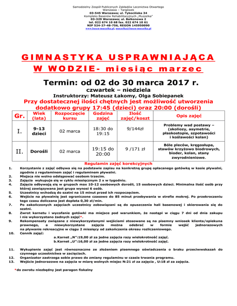 Samodzielny Zespół Publicznych Zakładów Lecznictwa Otwartego Warszawa – Targówek 03-545 Warszawa; ul. Tykocińska 34 Kompleks Basenów Rehabilitacyjnych „Muszelka” 03-329 Warszawa; ul. Balkonowa 2 tel. 022 674 10 68 fax. 022 674 10 61 NIP 524-27-48-756, REGON 145950090 www.basen-muszelka.pl, [email protected] GIMNASTYKA USPRAWNIAJĄCA W WODZIE- miesiąc marzec Termin: od 02 do 30 marca 2017 r. czwartek – niedziela Instruktorzy: Mateusz Łakomy, Olga Sobiepanek Przy dostatecznej ilości chętnych jest możliwość utworzenia dodatkowo grupy 17:45 (dzieci) oraz 20:00 (dorośli) Gr. Wiek (lata) I. 9-13 dzieci II. Dorośli Rozpoczęcie kursu Godzina zajęć Ilość zajęć/koszt 02 marca 18:30 do 19:15 9/144zł 02 marca 19:15 do 20:00 9 /171 zł Opis zajęć Problemy wad postawy – (skoliozy, asymetrie, płaskostopie, szpotawości i koślawości kolan) Bóle pleców, kręgosłupa, stawów krzyżowo biodrowych, bioder, kolan, stany zwyrodnieniowe. Regulamin zajęć korekcyjnych 1. 2. 3. 4. 5. 6. 7. 8. 9. 10. 11. 12. 13. Korzystanie z zajęć odbywa się na podstawie zapisu na konkretną grupę opłacanego gotówką w kasie pływalni, zgodnie z regulaminem zajęć i regulaminem pływalni. Miejsca nie wolno odstępować osobom trzecim. Zajęcia wykupuje się w cyklu miesięcznym 2 x w tygodniu. Zajęcia odbywają się w grupach max 10-12 osobowych dorośli, 15 osobowych dzieci. Minimalna ilość osób przy której zawiązywana jest grupa wynosi 6 osób. Uczestnicy wchodzą do szatni na 15 minut przed ich rozpoczęciem. Wejście na pływalnię jest ograniczone czasowo do 85 minut przebywania w strefie mokrej. Po przekroczeniu tego czasu doliczana jest dopłata 0,30 zł/min. Po zakończonych zajęciach uczestnicy zobowiązani są do opuszczenia hali basenowej i skierowania się do szatni. Zwrot karnetu i wycofanie gotówki ma miejsce pod warunkiem, że nastąpi w ciągu 7 dni od dnia zakupu i nie wykorzystano żadnych zajęć*. Rekompensaty związane z niewykorzystanymi wejściami stosowane są na pisemny wniosek klienta/opiekuna prawnego, a niewykorzystane zajęcia można odebrać w formie wejść jednorazowych na pływanie rekreacyjne w ciągu 2 miesięcy od zakończenia okresu rozliczeniowego. Cennik zajęć: a. Karnet „N”:19,00 zł za jedne zajęcia razy wielokrotność zajęć. b. Karnet „U”:16,00 zł za jedne zajęcia razy wielokrotność zajęć. Wykupienie zajęć jest równoznaczne ze złożeniem pisemnego oświadczenia o braku przeciwwskazań do czynnego uczestnictwa w zacięciach. Organizator zastrzega sobie prawo do zmiany regulaminu w czasie trwania programu. Wejście jednorazowe na zajęcia w miarę wolnych miejsc N:21 zł za zajęcia , U:18 zł za zajęcia. *do zwrotu niezbędny jest paragon fiskalny