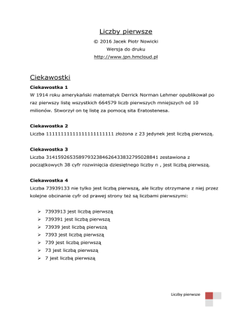 Liczby pierwsze © 2016 Jacek Piotr Nowicki Wersja do druku http://www.jpn.hmcloud.pl Ciekawostki Ciekawostka 1 W 1914 roku amerykański matematyk Derrick Norman Lehmer opublikował po raz pierwszy listę wszystkich 664579 liczb pierwszych mniejszych od 10 milionów. Stworzył on tę listę za pomocą sita Eratostenesa. Ciekawostka 2 Liczba 11111111111111111111111 złożona z 23 jedynek jest liczbą pierwszą. Ciekawostka 3 Liczba 31415926535897932384626433832795028841 zestawiona z początkowych 38 cyfr rozwinięcia dziesiętnego liczby π , jest liczbą pierwszą. Ciekawostka 4 Liczba 73939133 nie tylko jest liczbą pierwszą, ale liczby otrzymane z niej przez kolejne obcinanie cyfr od prawej strony też są liczbami pierwszymi: 7393913 jest liczbą pierwszą 739391 jest liczbą pierwszą 73939 jest liczbą pierwszą 7393 jest liczbą pierwszą 739 jest liczbą pierwszą 73 jest liczbą pierwszą 7 jest liczbą pierwszą Liczby pierwsze