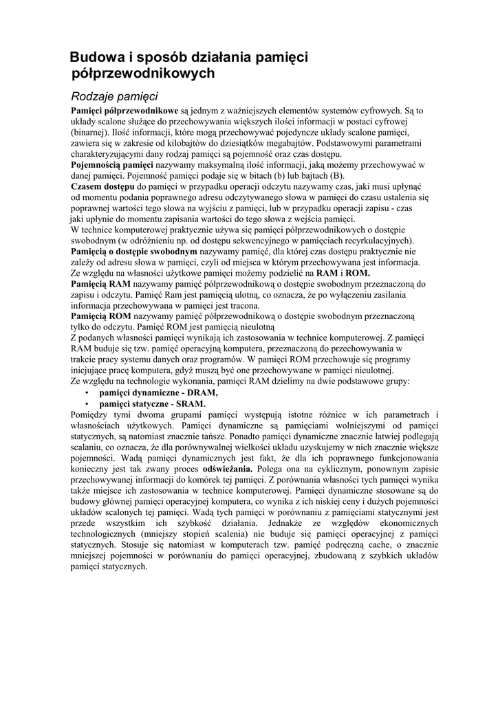 Budowa i sposób działania pamięci półprzewodnikowych Rodzaje pamięci Pamięci półprzewodnikowe są jednym z ważniejszych elementów systemów cyfrowych. Są to układy scalone służące do przechowywania większych ilości informacji w postaci cyfrowej (binarnej). Ilość informacji, które mogą przechowywać pojedyncze układy scalone pamięci, zawiera się w zakresie od kilobajtów do dziesiątków megabajtów. Podstawowymi parametrami charakteryzującymi dany rodzaj pamięci są pojemność oraz czas dostępu. Pojemnością pamięci nazywamy maksymalną ilość informacji, jaką możemy przechowywać w danej pamięci. Pojemność pamięci podaje się w bitach (b) lub bajtach (B). Czasem dostępu do pamięci w przypadku operacji odczytu nazywamy czas, jaki musi upłynąć od momentu podania poprawnego adresu odczytywanego słowa w pamięci do czasu ustalenia się poprawnej wartości tego słowa na wyjściu z pamięci, lub w przypadku operacji zapisu - czas jaki upłynie do momentu zapisania wartości do tego słowa z wejścia pamięci. W technice komputerowej praktycznie używa się pamięci półprzewodnikowych o dostępie swobodnym (w odróżnieniu np. od dostępu sekwencyjnego w pamięciach recyrkulacyjnych). Pamięcią o dostępie swobodnym nazywamy pamięć, dla której czas dostępu praktycznie nie zależy od adresu słowa w pamięci, czyli od miejsca w którym przechowywana jest informacja. Ze względu na własności użytkowe pamięci możemy podzielić na RAM i ROM. Pamięcią RAM nazywamy pamięć półprzewodnikową o dostępie swobodnym przeznaczoną do zapisu i odczytu. Pamięć Ram jest pamięcią ulotną, co oznacza, że po wyłączeniu zasilania informacja przechowywana w pamięci jest tracona. Pamięcią ROM nazywamy pamięć półprzewodnikową o dostępie swobodnym przeznaczoną tylko do odczytu. Pamięć ROM jest pamięcią nieulotną Z podanych własności pamięci wynikają ich zastosowania w technice komputerowej. Z pamięci RAM buduje się tzw. pamięć operacyjną komputera, przeznaczoną do przechowywania w trakcie pracy systemu danych oraz programów. W pamięci ROM przechowuje się programy inicjujące pracę komputera, gdyż muszą być one przechowywane w pamięci nieulotnej. Ze względu na technologie wykonania, pamięci RAM dzielimy na dwie podstawowe grupy: • pamięci dynamiczne - DRAM, • pamięci statyczne - SRAM. Pomiędzy tymi dwoma grupami pamięci występują istotne różnice w ich parametrach i własnościach użytkowych. Pamięci dynamiczne są pamięciami wolniejszymi od pamięci statycznych, są natomiast znacznie tańsze. Ponadto pamięci dynamiczne znacznie łatwiej podlegają scalaniu, co oznacza, że dla porównywalnej wielkości układu uzyskujemy w nich znacznie większe pojemności. Wadą pamięci dynamicznych jest fakt, że dla ich poprawnego funkcjonowania konieczny jest tak zwany proces odświeżania. Polega ona na cyklicznym, ponownym zapisie przechowywanej informacji do komórek tej pamięci. Z porównania własności tych pamięci wynika także miejsce ich zastosowania w technice komputerowej. Pamięci dynamiczne stosowane są do budowy głównej pamięci operacyjnej komputera, co wynika z ich niskiej ceny i dużych pojemności układów scalonych tej pamięci. Wadą tych pamięci w porównaniu z pamięciami statycznymi jest przede wszystkim ich szybkość działania. Jednakże ze względów ekonomicznych technologicznych (mniejszy stopień scalenia) nie buduje się pamięci operacyjnej z pamięci statycznych. Stosuje się natomiast w komputerach tzw. pamięć podręczną cache, o znacznie mniejszej pojemności w porównaniu do pamięci operacyjnej, zbudowaną z szybkich układów pamięci statycznych. Organizacja pamięci Podstawowe wyprowadzenia układu pamięci półprzewodnikowej pokazane są na rysunku poniżej. Szyna wejścia/wyjścia danych (DB) służ do wprowadzania i wyprowadzania informacji do i z pamięci. Wejście adresowe AB służy do dokonania wyboru, na którym z wielu słów w pamięci zostanie wykonana operacja (zapisu lub odczytu). Wejście sterujące R/W# informuje układ pamięci, jakiego rodzaju operacja będzie wykonywana: odczyt lub zapis. Wreszcie wejście CS# służy do uaktywnienia układu pamięci. Wejście to jest używane przy budowie zespołów pamięci metodą łączenia dwóch lub więcej układów Rysunek 1. Podstawowe wyprowadzenia scalonych pamięci. układu scalonego pamięci. Adresem nazywamy niepowtarzalną liczbę (numer) przypisaną danemu miejscu (słowu) w pamięci w celu jego identyfikacji. Słowem w pamięci nazywamy zestaw pojedynczych adresów komórek pamięci, do którego odwołujemy się pojedynczym adresem. Ilość bitów w pojedynczym słowie pamięci będziemy nazywać długością słowa pamięci. Warto zauważyć, że długość słowa pamięci musi być równa ilości wyprowadzeń szyny wejścia/wyjścia, gdyż słowa są wprowadzane i wyprowadzane z pamięci równolegle. Organizacją pamięci nazywamy sposób podziału obszaru pamięci na słowa. Pojęcie organizacji pamięci najprościej wyjaśnić na przykładzie. Pamięci narysowane symbolicznie na rysunku 2 a i b mają tą samą pojemność wynoszącą 32b, różnią się natomiast organizacją. Pamięć z rysunku a ma organizację bitową (32 x lb). Pamięć z rysunku b ma organizację bajtową (4 x 8b lub inaczej 4 x 1B). Przy okazji należy zwrócić uwagę na ilość linii danych i adresowych dla każdej z tych pamięci. Łączenie układów pamięci Budowa bloków (banków) pamięci polega na łączeniu układów scalonych pamięci o określonej pojemności i organizacji w ten sposób, aby uzyskać zespoły pamięci o większej pojemności i/lub o zmienionej długości słowa. Stąd problem rozbudowy pamięci możemy podzielić na dwa podstawowe przypadki: • zwiększanie (rozszerzanie) długości słowa przy niezmienionej ilości słów, • zwiększanie ilości słów przy niezmienionej długości