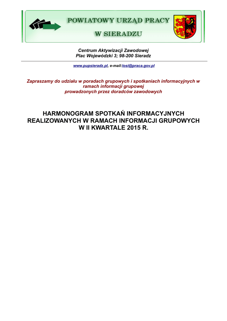 Centrum Aktywizacji Zawodowej Plac Wojewódzki 3; 98-200 Sieradz www.pupsieradz.pl, e-mail:[email protected] Zapraszamy do udziału w poradach grupowych i spotkaniach informacyjnych w ramach informacji grupowej prowadzonych przez doradców zawodowych HARMONOGRAM SPOTKAŃ INFORMACYJNYCH REALIZOWANYCH W RAMACH INFORMACJI GRUPOWYCH W II KWARTALE 2015 R. TERMIN REALIZACJI INFORMACJI GRUPOWEJ*: 09.04.2015 r. 10.04.2015 r. 13.04.2015 r. 14.04.2015 r. CZAS TRWANIA: MAX. LICZBA UCZESTNIKÓW: „Usługi i instrumenty rynku pracy oraz nowe sposoby aktywizacji osób bezrobotnych w oparciu o znowelizowane przepisy ustawy" I spotkanie: 09:00–10:00 20 „Usługi i instrumenty rynku pracy oraz nowe sposoby aktywizacji osób bezrobotnych w oparciu o znowelizowane przepisy ustawy" I spotkanie: 09:00–10:00 TEMATYKA: TERMIN NABORU: 01.04.2015 r. II spotkanie: 11:00-12:00 20 20 02.04.2015 r. II spotkanie: 11:00-12:00 20 „Usługi i instrumenty rynku pracy oraz nowe sposoby aktywizacji osób bezrobotnych w oparciu o znowelizowane przepisy ustawy" I spotkanie: 09:00–10:00 II spotkanie: 11:00-12:00 20 „Usługi i instrumenty rynku pracy oraz nowe sposoby aktywizacji osób bezrobotnych w oparciu o znowelizowane przepisy ustawy" I spotkanie: 09:00–10:00 20 20 03.04.2015 r. 03.04.2015 r. II spotkanie: 11:00-12:00 20 20 11.06.2015 r. 12.06.2015 r. 15.06.2015 r. 16.06.2015 r. „Usługi i instrumenty rynku pracy oraz nowe sposoby aktywizacji osób bezrobotnych w oparciu o znowelizowane przepisy ustawy" „Usługi i instrumenty rynku pracy oraz nowe sposoby aktywizacji osób bezrobotnych w oparciu o znowelizowane przepisy ustawy" „Usługi i instrumenty rynku pracy oraz nowe sposoby aktywizacji osób bezrobotnych w oparciu o znowelizowane przepisy ustawy" „Usługi i instrumenty rynku pracy oraz nowe sposoby aktywizacji osób bezrobotnych w oparciu o znowelizowane przepisy ustawy" I spotkanie: 09:00–10:00 20 03.06.2015 r. II spotkanie: 11:00-12:00 I spotkanie: 09:00–10:00 20 03.06.2015 r. II spotkanie: 11:00-12:00 20 I spotkanie: 09:00–10:00 20 05.06.2015r. II spotkanie: 11:00-12:00 20 I spotkanie: 09:00–10:00 20 08.06.2015r. II spotkanie: 11:00-12:00 20 * PUP Sieradz zastrzega sobie prawo do zmiany terminów spotkań informacyjnych w ramach informacji grupowej Spotkania informacyjne w ramach informacji grupowych odbywają się w Powiatowym Urzędzie Pracy w Sieradzu, w Sali Aktywizacji Zawodowej (pok. 702, VII piętro). Osoby zainteresowane udziałem w warsztatach proszone są o zgłaszanie się do swoich doradców klienta w celu dokonania zapisu i ustalenie terminu spotkania. SERDECZNIE ZAPRASZAMY!