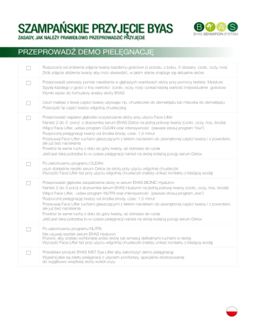 SZAMPAŃSKIE PRZYJĘCIE BYAS Zasady, jak należy prawidłowo przeprowadzić przyjęcie Przeprowadź demo pielęgnację Rozpocznij od zrobienia zdjęcia twarzy każdemu gościowi (z przodu, z boku, 3 obszary: czoło, oczy, nos) Zrób zdjęcie zbliżenia twarzy aby móc stwierdzić, w jakim stanie znajduje się aktualnie skóra Przeprowadź pierwszy pomiar nawilżenia w głębszych warstwach skóry przy pomocy testera Moisture Spytaj każdego z gości o trzy wartości (czoło, oczy, nos) i pokaż każdą wartość indywidualnie gościowi Wyniki wpisz do formularzy analizy skóry BYAS Usuń makijaż z lewej części twarzy używając np. chusteczek do demakijażu lub mleczka do demakijażu Przeczyść tę część twarzy wilgotną chusteczką Przeprowadź najpierw głębokie oczyszczanie skóry przy użyciu Face Lifter Nanieś 2 do 3 porcji z dozownika serum BYAS Detox na jedną połowę twarzy (czoło, oczy, nos, broda) Włącz Face Lifter, ustaw program CLEAN oraz intensywność (zawsze stosuj program “low”) Rozpocznij pielęgnację twarzy od środka brody, czas: 1,5 minut Przesuwaj Face Lifter ruchami głaszczącymi z lekkim naciskiem do zewnętrznej części twarzy i z powrotem, ale już bez naciskania Powtórz te same ruchy z dołu do góry twarzy, aż dotrzesz do czoła Jeśli jest taka potrzeba to w czasie pielęgnacji nanieś na skórę kolejną porcję serum Detox Po zakończeniu programu CLEAN: usuń dokładnie resztki serum Detox ze skóry przy użyciu wilgotnej chusteczki Wyczyść Face Lifter też przy użyciu wilgotnej chusteczki (należy unikać kontaktu z bieżącą wodą) Przeprowadź głębokie zaopatrzenie skóry w serum BYAS BIONIC Hyaluron Nanieś 2 do 3 porcji z dozownika serum BYAS Hyaluron na jedną połowę twarzy (czoło, oczy, nos, broda) Włącz Face Lifter, ustaw program NUTRI oraz intensywność (zawsze stosuj program „low”) Rozpocznij pielęgnację twarzy od środka brody, czas: 1,5 minut Przesuwaj Face Lifter ruchami głaszczącymi z lekkim naciskiem do zewnętrznej części twarzy i z powrotem, ale już bez naciskania Powtórz te same ruchy z dołu do góry twarzy, aż dotrzesz do czoła Jeśli jest taka potrzeba to w czasie pielęgnacji nanieś na skórę kolejną porcję serum Detox Po zakończeniu programu NUTRI: Nie usuwaj resztek serum BYAS Hyaluron Pozwól, aby zostało wchłonięte przez skórę lub wmasuj delikatnymi ruchami w skórę Wyczyść Face Lifter też przy użyciu wilgotnej chusteczki (należy unikać kontaktu z bieżącą wodą) Przedstaw produkt BYAS MST Eye Lifter aby zakończyć demo pielęgnację Wyjaśnij jake są zalety pielęgnacji z użyciem jonoforezy, specjalnie dostosowanej do wyjątkowo wrażliwej skóry wokół oczu SZAMPAŃSKIE PRZYJĘCIE BYAS Zasady, jak należy prawidłowo przeprowadzić przyjęcie Przeprowadź demo pielęgnację Zakończ demo pielęgnacją końcową dla zewnętrznej wartswy skóry Zastosuj BYAS Day Creme aby mieć pewność, że skóra została pokryta specjalną warstwą ochronną zapobiegającą utracie wilgotności Zastosuj BYAS Night Creme aby mieć pewność, że w nocy uaktywnione zostaną procesy regeneracyjne, dzięki którym skra będzie rano promieniowała świeżością Teraz przeprowadź drugi głęboki pomiar wilgotności skóry przy użyciu testera Moisture Sprawdź ponownie u każdego z gości trzy wartości (czoło, oczy, nos) i każdemu zaprezentuj te wartości indywidualnie Porównaj te wartości z wartościami wyjściowymi i wpisz do formularza analizy skóry BYAS danego gościa Wykonaj ponownie zbliżeniowe ujęcia każdej twarzy (czoło, oczy, nos) swoich gości i zaprezentuj im indywidualnie wyniki Spytaj czy są pod wrażeniem efektu! “… w ciągu zaledwie 3 minut i tylko przy pomocy jednego zabiegu pielęgnacyjnego osiągnęliśmy niespotykane efekty… Jak bardzo jesteś zadowolony?” Zaprezentuj & wyjaśnij sensacyjną ofertę, jaką posiadasz “Proszę sobie pozwolić na luksus w postaci niespotykanej zmiany skóry w wyjątkowo krótkim czasie” Spytaj o zainteresowanie! „Kto jest zainteresowany: … elepszym działaniem produktów kosmetycznych stosowanch na co dzeń?“ … zakupen jedynego w swoim rodzaju systemu BYAS do odmładzania skóry?“ Zakończ transakcję sprzedaży: sprzedaj zestaw BYAS Face Lifter Silver lub BYAS Premium-Package + BASIC ASP z Detox & Hyaluron (= 1 BYAS MST Eye Lifter gratis do tego) lub BYAS Premium-Package + VIP ASP z Detox & Hyaluron & Day / Night Cream (= 1 BYAS MST Eye Lifter gratis do tego) lub też sprzedaj przynajmniej BYAS MST Eye Lifter! Stwórz dla każdego z gości indywidualny plan Beauty Przekonaj każdego z gości do tego, aby zastosował w domu pielęgnację BYAS i dzięki niej spełnił swoje marzenia dotyczące piŁknego wyglądu Sięgnij po więcej i wyjaśnij: BYAS oferuje też możliowości zarobkowe: … następne Szampańskie przyjęcie BYAS przeprowadź sam jako gospodarz … lub nawet zostań partnerem BYAS! Zaplanuj kolejne kroki (przyjęcie/ Workshop) Umów wiążące terminy Podziękuj wszystkim za przybycie Podziękuj gospodarzowi za wspaniałe zorganizowanie przyjęcia Rozlej po symbolicznej lampce szampana i na koniec wznieś ze wszystkimi toast!