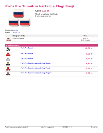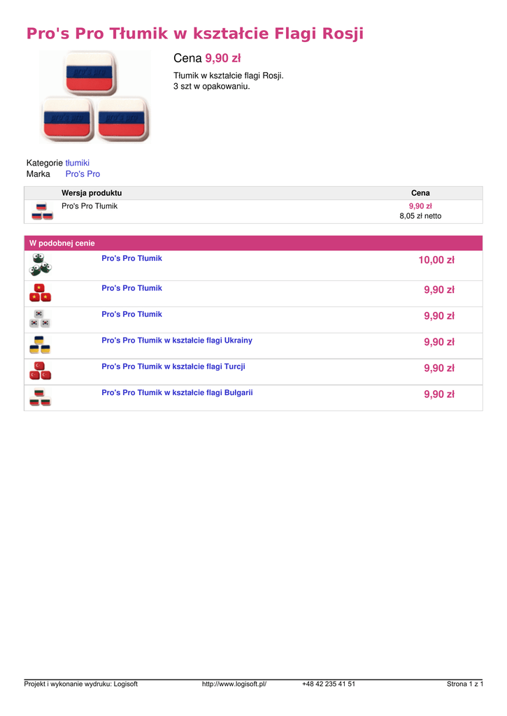 Pro's Pro Tłumik w kształcie Flagi Rosji Cena 9,90 zł Tłumik w kształcie flagi Rosji. 3 szt w opakowaniu. Kategorie tłumiki Marka Pro's Pro Wersja produktu Cena Pro's Pro Tłumik 9,90 zł 8,05 zł netto W podobnej cenie Pro's Pro Tłumik 10,00 zł Pro's Pro Tłumik 9,90 zł Pro's Pro Tłumik 9,90 zł Pro's Pro Tłumik w kształcie flagi Ukrainy 9,90 zł Pro's Pro Tłumik w kształcie flagi Turcji 9,90 zł Pro's Pro Tłumik w kształcie flagi Bułgarii 9,90 zł Projekt i wykonanie wydruku: Logisoft Powered by TCPDF (www.tcpdf.org) http://www.logisoft.pl/ +48 42 235 41 51 Strona 1 z 1