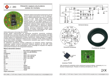 JABEL ® J - 283 Wskaźnik napięcia akumulatora zestaw do montażu Wskaźnik napięcia akumulatora przeznaczony jest do kontroli napięcia akumulatorów 12 lub 24 voltowych. Poziom napięcia wskazywany jest przez 10 diod LED z krokiem co 0,5V. Każdy próg napięcia posiada histerezę ok 0,2V. Jeżeli napięcie na akumulatorze spadnie poniżej 10V, lub będzie wyższe od 14,5V sygnalizowane jest to migotaniem odpowiedniej diody. Dokładność wskaźnika zależy głównie od tolerancji rezystorów zastosowanych w wejściowym dzielniku napięcia. Zwarcie 4 nóżki procesora do masy (minus zasilania) spowoduje przełączenie zakresu pracy wskaźnika do pomiaru akumulatorów 24V. Zakres wskazań będzie wynosił od 20 do 29V. Układ zasilany jest z mierzonego akumulatora. Montaż układu rozpoczynamy od wlutowania wszystkich rezystorów, podstawki, kondensatorów, a na końcu diod LED. Diody LED montujemy na taką wysokość, aby lekko wystawały nad kondensatory elektrolityczne. Dla ułatwienia montażu diod dłuższą ich nóżkę (anoda) lutujemy do kwadratowych punktów lutowniczych, krótszą (katoda) do okrągłych punktów lutowniczych. Stabilizator napięcia 5V jest w obudowie TO-252. Należy przylutować go od strony ścieżek pamiętając o przylutowaniu wszystkich jego nóżek (3 “nóżką” jest blaszka radiatorowa - masa układu). Po dokładnym sprawdzeniu montażu podłączamy do wskaźnika zasilacz regulowany. Zwiększając napięcie zasilania sprawdzamy kolejność zapalania się diod LED. Jeżeli dokładność wskazań nie jest zadawalająca można równolegle do rezystora R2 dołączyć potencjometr montażowy i nim wyregulować wskazania. Schemat ideowy Schemat montażowy Wykaz elementów zestawu: US1..............................................PIC12F675 (zaprogramowany) US2..............................................7805 (TO-252 DPACK) Podstawka....................................DIP8 D1-D3........................................ ..LED 3 mm czerwone D4-D8........................................ ..LED 3 mm zielone D9-D10.........................................LED 3 mm żółte R1.................................................9,1k R2.................................................1,8k R3.................................................10k R4-R7............................................75 C1.................................................220nF C2.................................................220uF/35V C3.................................................100uF/16V C4,C5...........................................100nF Płytka drukowana PPHU JABEL s.c. 76-270 Ustka ul. Słupska 3, tel./fax (+48 59) 814 56 66, www.jabel.com.pl, e-mail:[email protected] Przykładowa obudowa GND OUTPUT INPUT obudowa TO252 Jako obudowę do wskaźnika można zastosować przepust kablowy stosowany m..in. w biurkach komputerowych. Posiada on średnicę wewnętrzną ok..50 mm. PPHU JABEL s.c. 76-270 Ustka ul. Słupska 3, tel./fax (+48 59) 814 56 66, www.jabel.com.pl, e-mail:[email protected]