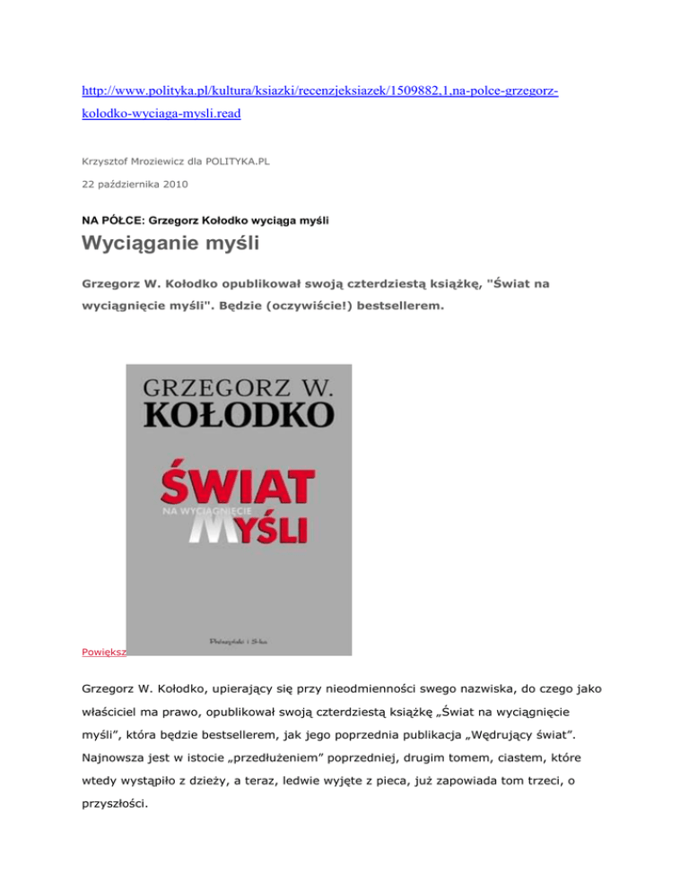 http://www.polityka.pl/kultura/ksiazki/recenzjeksiazek/1509882,1,na-polce-grzegorzkolodko-wyciaga-mysli.read Krzysztof Mroziewicz dla POLITYKA.PL 22 października 2010 NA PÓŁCE: Grzegorz Kołodko wyciąga myśli Wyciąganie myśli Grzegorz W. Kołodko opublikował swoją czterdziestą książkę, "Świat na wyciągnięcie myśli". Będzie (oczywiście!) bestsellerem. Powiększ Grzegorz W. Kołodko, upierający się przy nieodmienności swego nazwiska, do czego jako właściciel ma prawo, opublikował swoją czterdziestą książkę „Świat na wyciągnięcie myśli”, która będzie bestsellerem, jak jego poprzednia publikacja „Wędrujący świat”. Najnowsza jest w istocie „przedłużeniem” poprzedniej, drugim tomem, ciastem, które wtedy wystąpiło z dzieży, a teraz, ledwie wyjęte z pieca, już zapowiada tom trzeci, o przyszłości. „Wędrujący świat” sprzedany został w nakładzie 60 tysięcy egzemplarzy, co jak na dzieło ekonomiczne, antropologiczne, kulturoznawcze, a nawet - podróżnicze jest osiągnięciem niebywałym. Jeśli wydawca sprzeda dziś 5 tysięcy – jest szczęśliwy. O nakładzie dziesięciokrotnie wyższym nie marzą ani wydawcy, ani autorzy. Książka doczekała się przekładów na angielski, węgierski, rosyjski, chiński i wietnamski. Czytali ją Fukuyama, Stiglitz i Amartya Sen. Opisuje świat zglobalizowany, przenoszący się nad Pacyfik, ale jednocześnie reagujący na te przenosiny wzmożonym pulsem w Europie (UE), satysfakcją w nadpacyficznej Ameryce Łacińskiej i odżywającej, świetnie opisanej Afryce. „Wędrujący świat” opisuje nadchodzący globalny kryzys finansowy, przewidziany tam z precyzją astrologa i zarazem chłodnego analityka, który na podstawie wiedzy o tym, co jest, mówi bez błędów o tym, co będzie. Profesor Kołodko jest praktykiem polityki, więc zasadne wydaje się pytanie: jeśli potrafi postawić diagnozę i prognozę, to czy wie, jaką zastosować terapię, przy założeniu, że stosunki ekonomiczne w świecie zawsze były (i są!) chore i że trzeba je leczyć. Grzegorz – mamy prawo tak powiedzieć, bo przez trzy lata był naszym cotygodniowym autorem komentarza-felietonu – czterokrotnie pełnił funkcję wicepremiera i ministra finansów w rządach panów Pawlaka, Cimoszewicza, Oleksego i Millera. Na leczenie wieloletnich, żeby nie powiedzieć - wielopokoleniowych, genetycznych schorzeń nie wystarczą krótkotrwałe kadencje władzy, która w zgodzie ze skrajnym indywidualizmem każdego z nas, Polaków, funkcjonuje jako sprzątaczka po poprzednikach, zrywa tynki, skrobie do fundamentów, i buduje na nowo, ale zanim dociągnie mury pod dach, już przychodzi następna ekipa, burzy, sprząta i buduje. I tak bez końca. W najnowszej książce Kołodko mówi o koincydencji teorii rozwoju, rozumiejąc koincydencję jako współistnienie i współzależność różnych czynników i procesów, nie zawsze opisywalnych i policzalnych. Pisze też o nowym pragmatyzmie, którego przykładów od Chin po Brazylię nie brakuje. Uderza w dzwon żałobny, choć bynajmniej nie ze smutkiem, obwieszczając koniec neoliberalizmu, czyli reaganomics i thatcheryzmu. 2 Te ostatnie wykształciły między innymi kastę „banksterów”, doprowadzając do zapaści finansowej świata obecnego. Kołodko zastanawia się nad rolą radców i doradców w takich krajach jak Rosja, Chiny, Bhutan, Indie, Kuba i - rzecz jasna - Polska, przypominając, że należy odróżniać ekonomię od show businessu. Książka nie napawa nadmiernym optymizmem, dlatego autor pozwala sobie na nieco żartobliwy finał w stylu „Dzienników Iljona Tichego” Stanisława Lema. Ale z kart „Świata na wyciągnięcie myśli” wynika niezbicie, to, co mówił Santayana: „kto nie chce rozumieć historii, skazany jest na to, żeby ją przeżyć ponownie”. Nie da się myśleć o przyszłości, jeśli nie mamy kanonów wartości, i to jest chyba główna myśl książki. Grzegorz W. Kołodko, Świat na wyciągnięcie myśli, Prószyński i S-ka, Warszawa 2010, s. 320. 3