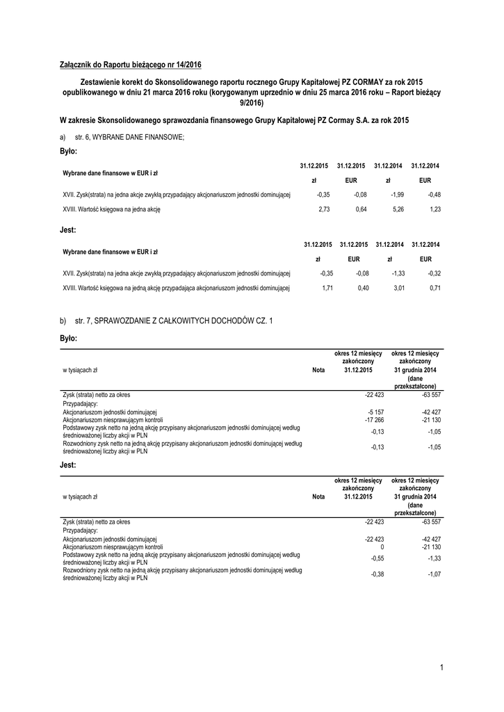Załącznik do Raportu bieżącego nr 14/2016 Zestawienie korekt do Skonsolidowanego raportu rocznego Grupy Kapitałowej PZ CORMAY za rok 2015 opublikowanego w dniu 21 marca 2016 roku (korygowanym uprzednio w dniu 25 marca 2016 roku – Raport bieżący 9/2016) W zakresie Skonsolidowanego sprawozdania finansowego Grupy Kapitałowej PZ Cormay S.A. za rok 2015 a) str. 6, WYBRANE DANE FINANSOWE; Było: Wybrane dane finansowe w EUR i zł 31.12.2015 31.12.2015 31.12.2014 31.12.2014 zł EUR zł EUR XVII. Zysk(strata) na jedna akcje zwykłą przypadający akcjonariuszom jednostki dominującej -0,35 -0,08 -1,99 -0,48 XVIII. Wartość księgowa na jedna akcję 2,73 0,64 5,26 1,23 31.12.2015 31.12.2015 31.12.2014 31.12.2014 zł EUR zł EUR Jest: Wybrane dane finansowe w EUR i zł XVII. Zysk(strata) na jedna akcje zwykłą przypadający akcjonariuszom jednostki dominującej -0,35 -0,08 -1,33 -0,32 XVIII. Wartość księgowa na jedną akcję przypadająca akcjonariuszom jednostki dominującej 1,71 0,40 3,01 0,71 b) str. 7, SPRAWOZDANIE Z CAŁKOWITYCH DOCHODÓW CZ. 1 Było: w tysiącach zł Nota Zysk (strata) netto za okres Przypadający: Akcjonariuszom jednostki dominującej Akcjonariuszom niesprawującym kontroli Podstawowy zysk netto na jedną akcję przypisany akcjonariuszom jednostki dominującej według średnioważonej liczby akcji w PLN Rozwodniony zysk netto na jedną akcję przypisany akcjonariuszom jednostki dominującej według średnioważonej liczby akcji w PLN okres 12 miesięcy zakończony 31.12.2015 -22 423 okres 12 miesięcy zakończony 31 grudnia 2014 (dane przekształcone) -63 557 -5 157 -17 266 -42 427 -21 130 -0,13 -1,05 -0,13 -1,05 okres 12 miesięcy zakończony 31.12.2015 -22 423 okres 12 miesięcy zakończony 31 grudnia 2014 (dane przekształcone) -63 557 -22 423 0 -42 427 -21 130 -0,55 -1,33 -0,38 -1,07 Jest: w tysiącach zł Zysk (strata) netto za okres Przypadający: Akcjonariuszom jednostki dominującej Akcjonariuszom niesprawującym kontroli Podstawowy zysk netto na jedną akcję przypisany akcjonariuszom jednostki dominującej według średnioważonej liczby akcji w PLN Rozwodniony zysk netto na jedną akcję przypisany akcjonariuszom jednostki dominującej według średnioważonej liczby akcji w PLN Nota 1 c) str. 8, SKONSOLIDOWANE SPRAWOZDANIE Z CAŁKOWITYCH DOCHODÓW CZ. 2 Było okres 12 miesięcy zakończony 31.12.2015 Podział innych całkowitych dochodów netto za okres Przypadający: Akcjonariuszom jednostki dominującej Akcjonariuszom niesprawującym kontroli okres 12 miesięcy zakończony 31.12.2014 dane przekształcone 422 1 411 -301 -301 Jest: okres 12 miesięcy zakończony 31.12.2015 Podział innych całkowitych dochodów netto za okres Przypadający: Akcjonariuszom jednostki dominującej Akcjonariuszom niesprawującym kontroli d) okres 12 miesięcy zakończony 31.12.2014 dane przekształcone 1 833 0 -301 -301 str. 9, SKONSOLIDOWANE SPRAWOZDANIE Z SYTUACJI FINANSOWEJ Było: w tysiącach złotych Nota 125 936 -5 157 48 209 31.12.2014 (dane przekształcone) 96 011 -42 427 71 597 108 670 -22 423 65 475 31.12.2014 (dane przekształcone) 96 011 -42 427 71 597 31.12.2015 Kapitał własny (przypadający akcjonariuszom jednostki dominującej) Wynik okresu bieżącego Udziały niekontrolujące Jest: w tysiącach złotych Nota 31.12.2015 Kapitał własny (przypadający akcjonariuszom jednostki dominującej) Wynik okresu bieżącego Udziały niekontrolujące e) str. 12. SKONSOLIDOWNAE SPRAWOZDANIE ZE ZMIAN W KAPITALE WŁASNYM Było: Zysk / strata za okres Całkowite dochody za okres ogółem Na dzień 31 GRUDNIA 2015 roku Kapitał podstawowy Kapitał zapasowy 0 63 724 0 51 365 Kapitał podstawowy Kapitał zapasow y 0 63 724 0 51 365 Zyski zatrzymane/ niepokryte straty -5 157 -5 157 10 847 Różnice z przeliczeń kursowych 1 833 0 Razem -5 157 -3 324 125 936 Udziały niekontroluj ące -17 266 -17 266 48 209 Kapitał własny ogółem -22 423 -20 590 174 145 Jest: Zysk / strata za okres Całkowite dochody za okres ogółem Na dzień 31 GRUDNIA 2015 roku Zyski zatrzymane/ niepokryte straty -22 423 -22 423 -6 419 Różnice z przeliczeń kursowych 1 833 0 Razem -22 423 -20 590 108 670 Udziały niekontrolu jące 0 0 65 475 Kapitał własny ogółem -22 423 -20 590 174 145 2 f) str. 50. Nota 24 Zysk przypadający na jedną akcję Było: Rok zakończony 31 grudnia 2014 (dane przekształcone) -5 157 -42 427 31 grudnia 2015 Zysk netto z działalności kontynuowanej przypisany akcjonariuszom jednostki dominującej Zysk netto przypadający na zwykłych akcjonariuszy, zastosowany do obliczenia podstawowego zysku na jedną akcję Zysk netto przypadający na zwykłych akcjonariuszy, zastosowany do obliczenia rozwodnionego zysku na jedną akcję Podstawowy zysk netto przypadający na jedną akcję w zł przypisany akcjonariuszom jednostki dominującej Rozwodniony zysk netto na jedną akcję przypisany akcjonariuszom jednostki dominującej według liczby akcji uwzględniających przyszłą emisję -5 157 -42 427 -9 707 -21 771 -0,15 -0,68 -0,15 -0,34 Jest: Rok zakończony 31 grudnia 2015 31 grudnia 2014 (dane przekształcone) Zysk netto z działalności kontynuowanej przypisany akcjonariuszom jednostki dominującej Zysk netto przypadający na zwykłych akcjonariuszy, zastosowany do obliczenia podstawowego zysku na jedną akcję Zysk netto przypadający na zwykłych akcjonariuszy, zastosowany do obliczenia rozwodnionego zysku na jedną akcję Podstawowy zysk netto przypadający na jedną akcję w zł przypisany akcjonariuszom jednostki dominującej Rozwodniony zysk netto na jedną akcję przypisany akcjonariuszom jednostki dominującej według liczby akcji uwzględniających przyszłą emisję -22 423 -42 427 -22 423 -42 427 -22 423 -42 427 -0,35 -1,33 -0,35 -0,67 3