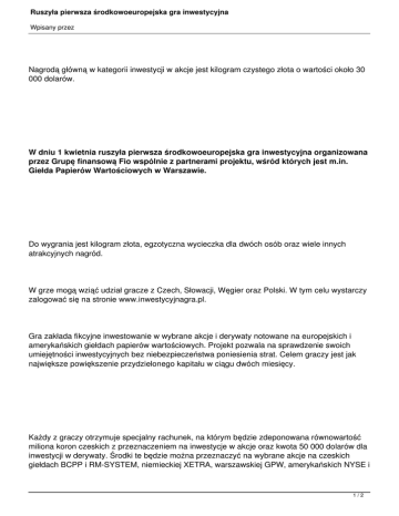 Ruszyła pierwsza środkowoeuropejska gra inwestycyjna Wpisany przez Nagrodą główną w kategorii inwestycji w akcje jest kilogram czystego złota o wartości około 30 000 dolarów. W dniu 1 kwietnia ruszyła pierwsza środkowoeuropejska gra inwestycyjna organizowana przez Grupę finansową Fio wspólnie z partnerami projektu, wśród których jest m.in. Giełda Papierów Wartościowych w Warszawie. Do wygrania jest kilogram złota, egzotyczna wycieczka dla dwóch osób oraz wiele innych atrakcyjnych nagród. W grze mogą wziąć udział gracze z Czech, Słowacji, Węgier oraz Polski. W tym celu wystarczy zalogować się na stronie www.inwestycyjnagra.pl. Gra zakłada fikcyjne inwestowanie w wybrane akcje i derywaty notowane na europejskich i amerykańskich giełdach papierów wartościowych. Projekt pozwala na sprawdzenie swoich umiejętności inwestycyjnych bez niebezpieczeństwa poniesienia strat. Celem graczy jest jak największe powiększenie przydzielonego kapitału w ciągu dwóch miesięcy. Każdy z graczy otrzymuje specjalny rachunek, na którym będzie zdeponowana równowartość miliona koron czeskich z przeznaczeniem na inwestycje w akcje oraz kwota 50 000 dolarów dla inwestycji w derywaty. Środki te będzie można przeznaczyć na wybrane akcje na czeskich giełdach BCPP i RM-SYSTEM, niemieckiej XETRA, warszawskiej GPW, amerykańskich NYSE i 1/2 Ruszyła pierwsza środkowoeuropejska gra inwestycyjna Wpisany przez NASDAQ oraz derywaty notowane na giełdzie CME, a także na kontrakty na indeks WIG20 notowane w Warszawie. Zwycięzcami zostaną ci, którzy w danym okresie zarobią najwięcej. Inwestycje w akcje i derywaty są liczone oddzielnie. Już w czasie gry w każdym tygodniu będą wybierani i oceniani najlepsi inwestorzy, a po zakończeniu konkursu ogólni zwycięzcy. Ciekawą możliwością inwestowania jest granie z przyjaciółmi w tzw. grupach inwestycyjnych. Wielki finał Gry Inwestycyjnej odbędzie się na GPW w Warszawie. Dla najlepszych uczestników przygotowane zostały cenne nagrody. Nagrodą główną w kategorii inwestycji w akcje jest kilogram czystego złota o wartości około 30 000 dolarów. W kategorii derywatów zwycięzca wyjedzie na atrakcyjną wycieczkę do egzotycznego kraju dla dwóch osób. Dla pozostałych zwycięzców ufundowane zostały nagrody w postaci pobytów w ośrodkach odnowy biologicznej, biletów lotniczych, elektroniki użytkowej, książek oraz pakietów darmowych zleceń na zakup papierów wartościowych poprzez platformę Fio. W Polsce zmagania graczy będzie można obserwować na blogu „Inwestycyjna Gra 2009" pod adresem http://grupafio.blogbank.pl, gdzie będą publikowane dzienne podsumowania oraz rozmowy z nagrodzonymi inwestorami. Patronem medialnym Inwestycyjnej Gry 2009 w Polsce jest internetowy serwis finansowy Bankier.pl, natomiast partnerem instytucjonalnym - Giełda Papierów Wartościowych w Warszawie. 2/2